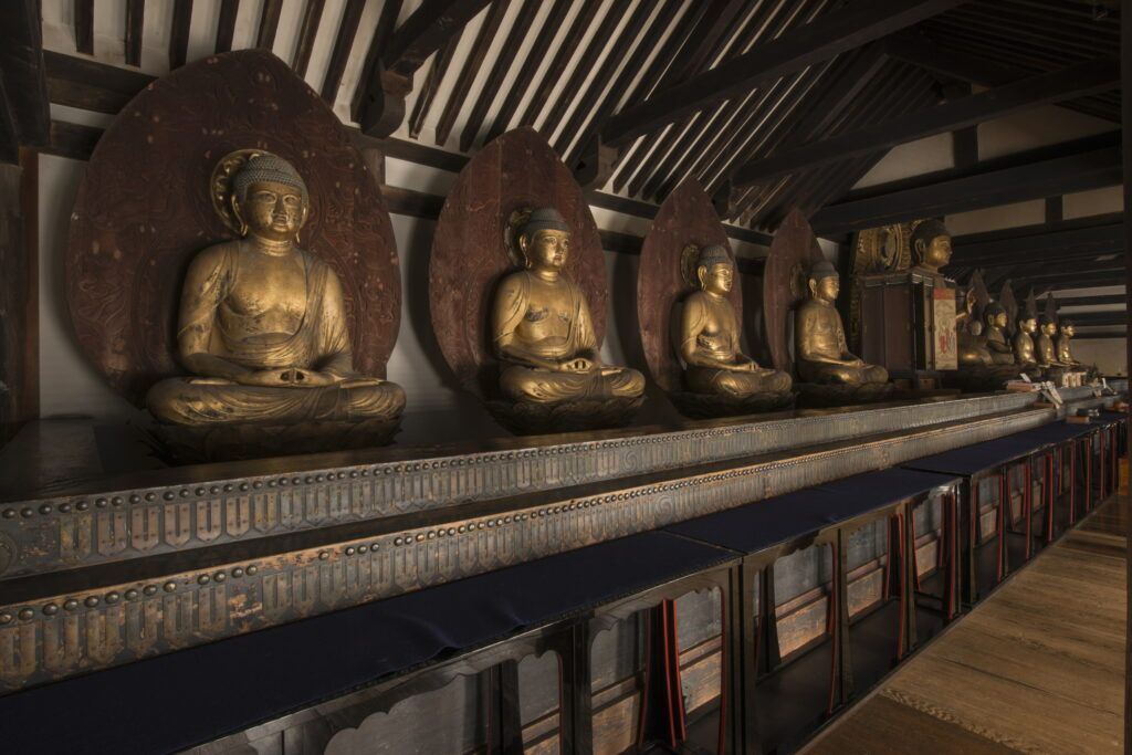 * Девять сидячих статуй Будды Амиды ремонтируются по две за раз в течение пяти лет, начиная с июля 2018 года.