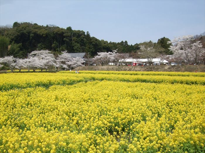 Весной на подходе к храму цветут сакуры. Также цветы рапса покрывают поле перед храмом, и это захватывающее зрелище.