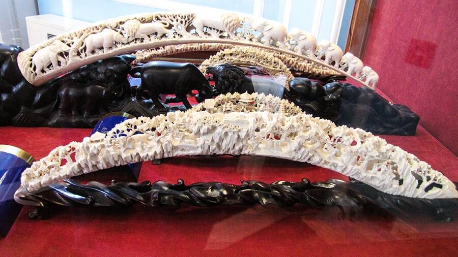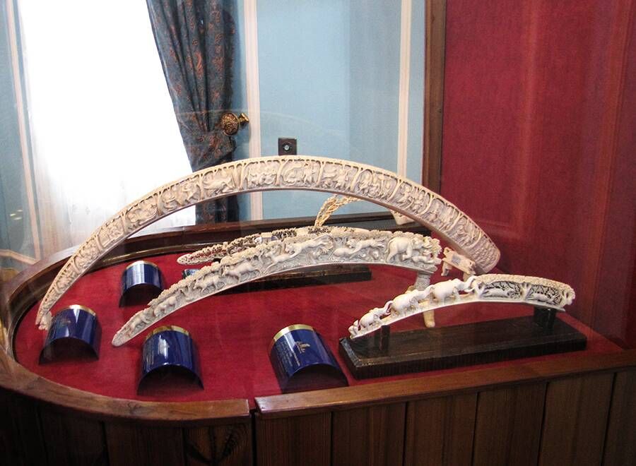 Картины, висящие на стене, — все бесценные произведения искусства, собранные в этом комплексе. На юге Мраморного дворца есть еще один вход, перед которым видна мраморная скульптура двух мазандаранских тигров; тигров, которые вымерли, и их нет в Мазандаране или других частях Ирана.