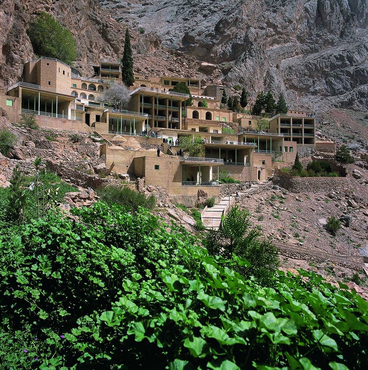 Архитектура этого района и окружающих зданий находится в полной гармонии с топографией местности, ступенчатая и вздымающаяся, примерно в 5 неравномерных этажей; так что крыша первого этажа является двором второго этажа, а храм огня внутри пещеры находится в самой высокой части горы. Чтобы войти в это место, необходимо соблюдать определенные правила. Вход в храм металлический с золотым покрытием, украшенным изображением Ахеменидов.
