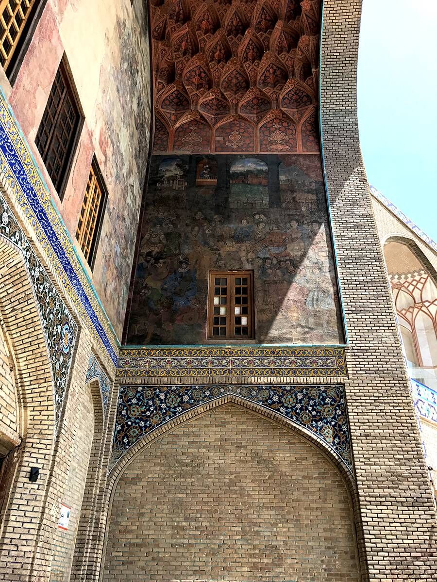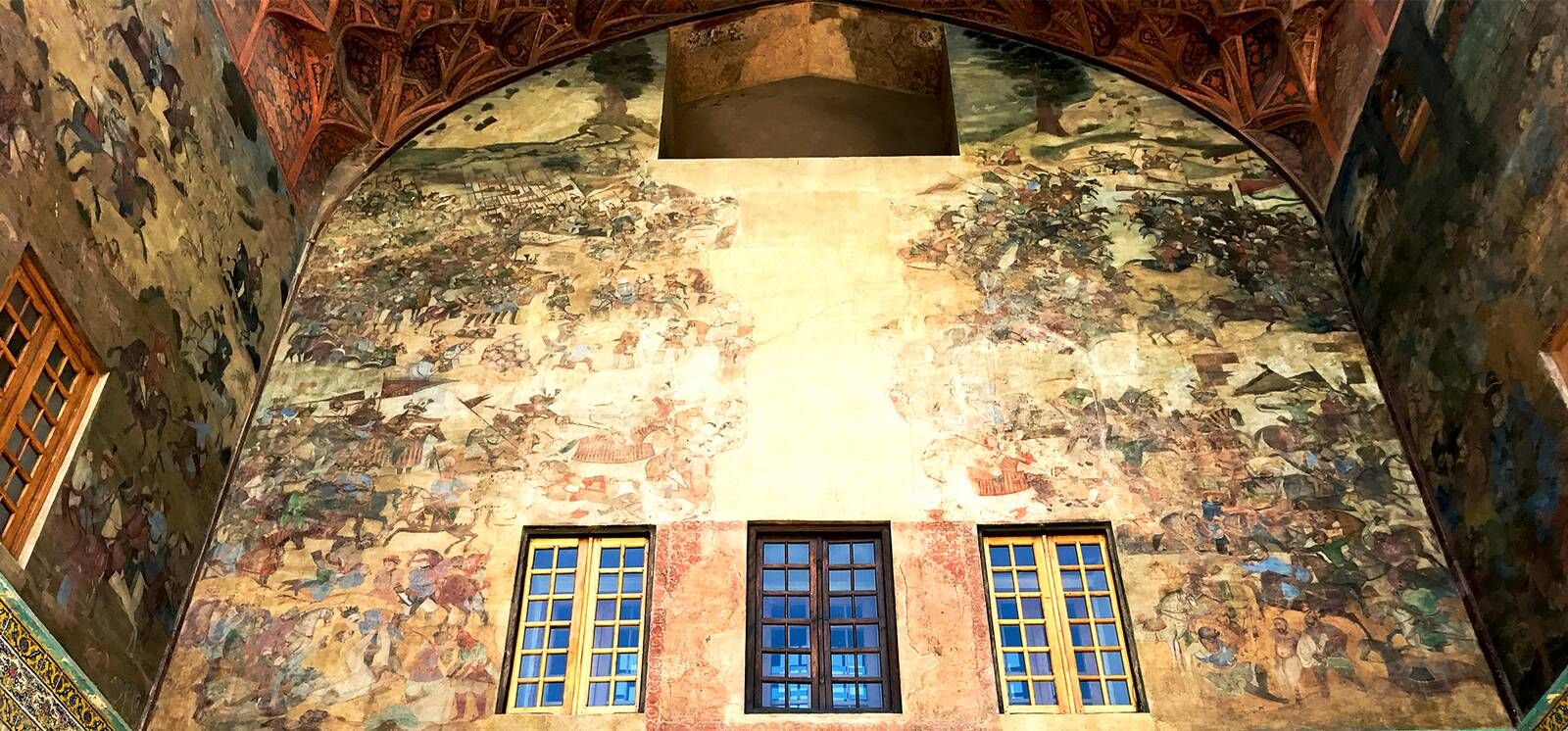 Пропилеум особняка Али Капу украшен красивыми украшениями, заставляющими посетителей поднимать глаза на вход, чтобы увидеть картины. Картины включают в себя сцены войны Сефевидов с узбеками и европейцами. Тем не менее, выделенный предмет этой картины - лучник, состоящий из головы человека, тела льва или тигра и хвоста дракона, который теперь является символом города Исфахан, ведомый из созвездия месяца Азар.