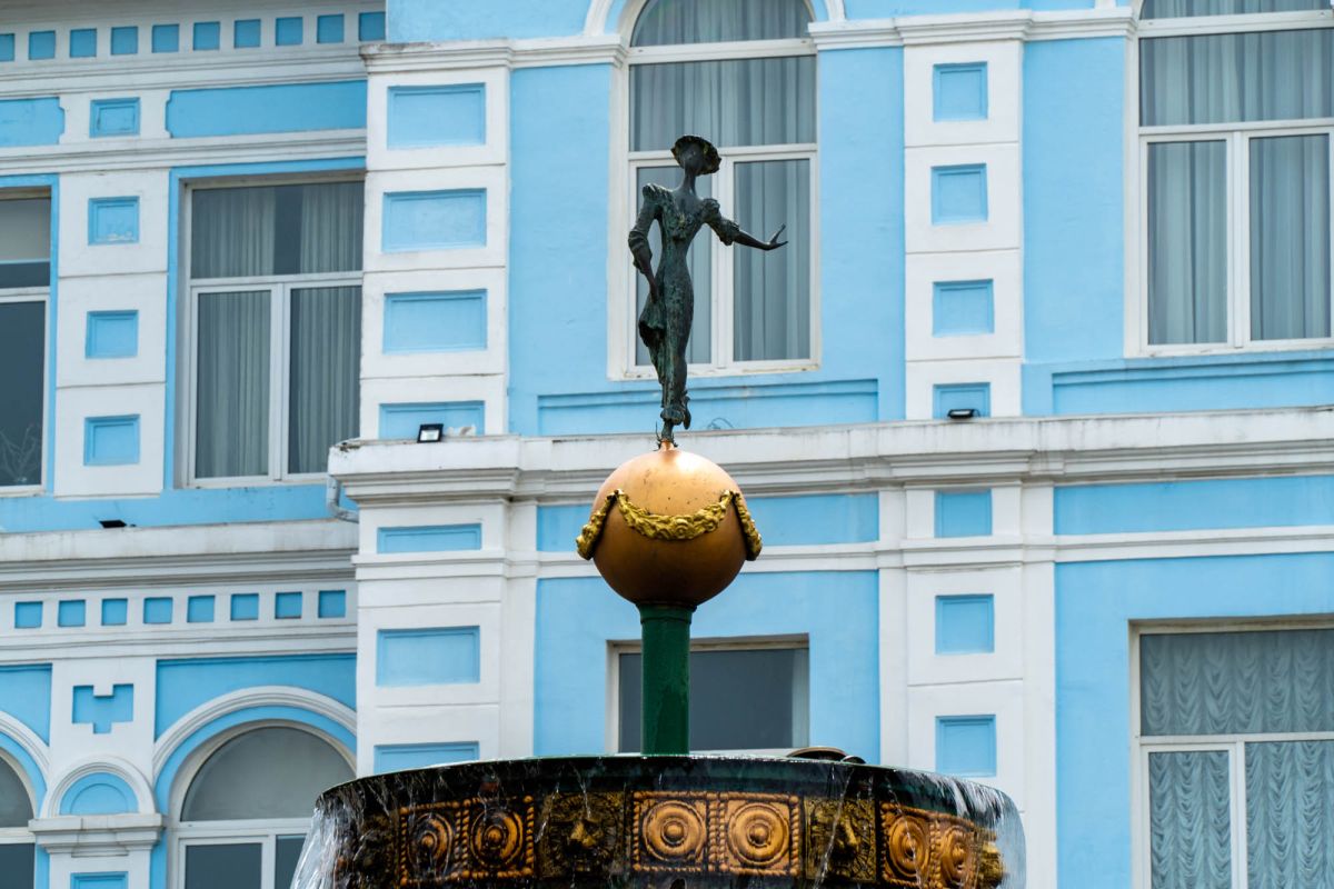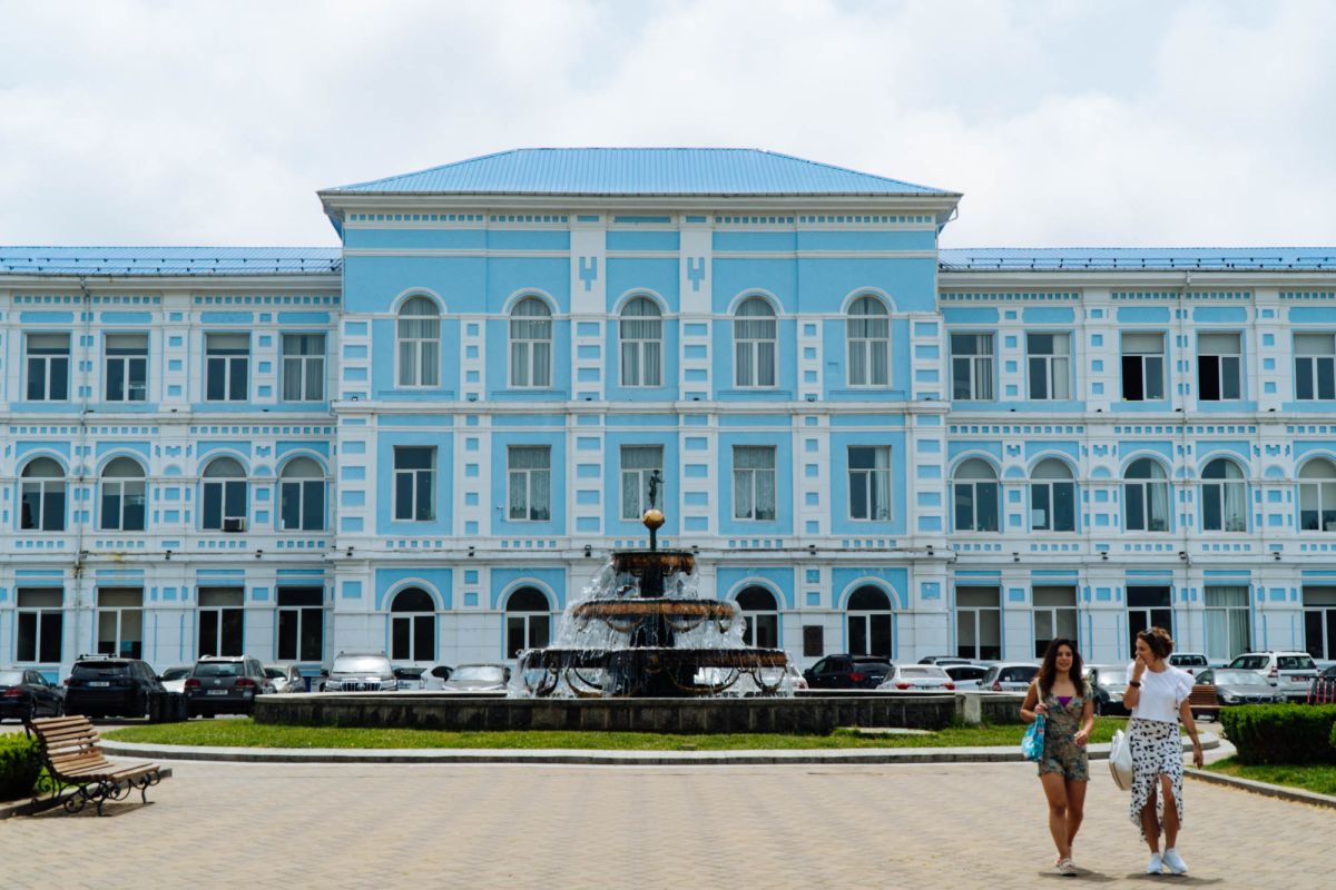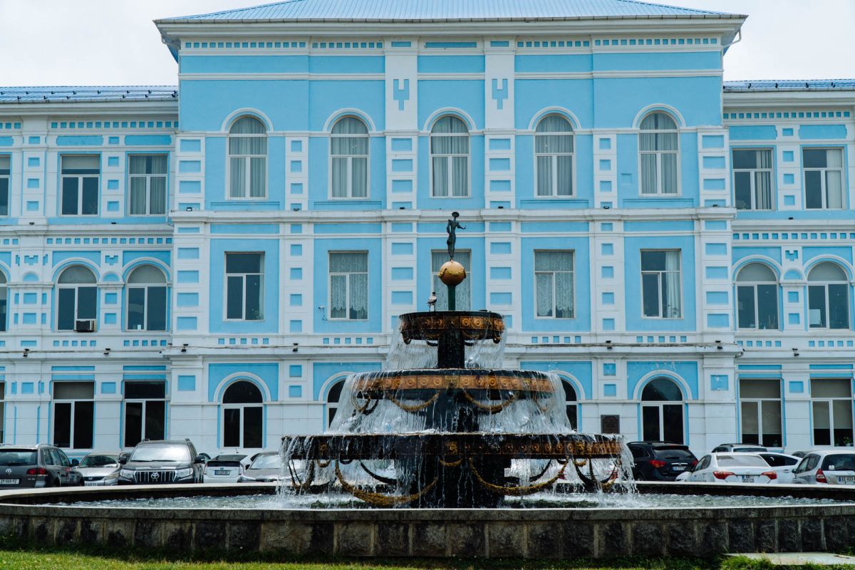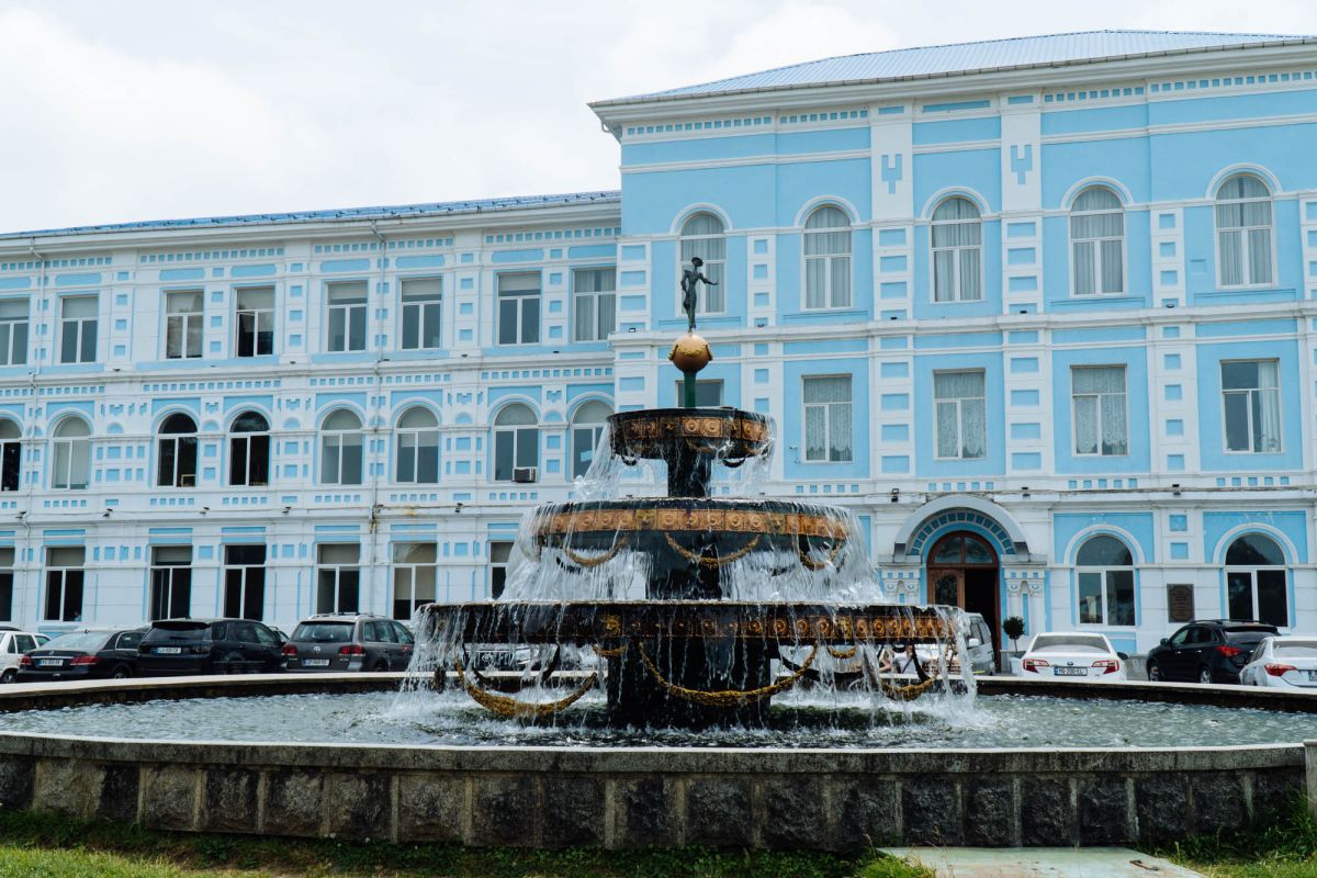 Великолепный фонтан с тремя широкими бронзовыми чашами и просторным бассейном в основании установлен перед зданием университема Батуми. Фонтан венчает изящная фигура девушки на золотом шаре.