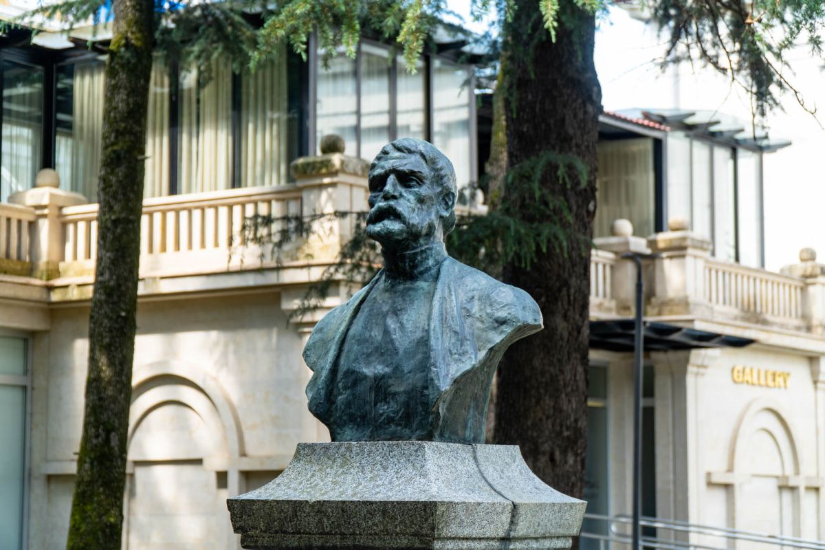 Бюст выполнен из бронзы и установлен на высоком постаменте, на котором написано имя писателя и даты его жизни. Важе Пшавеле это один из самых известных и популярных грузинских писателей и поэтов 20 века. Он является автором многих знаменитых произведений, в том числе романа "Руки", который был переведен на многие языки мира.