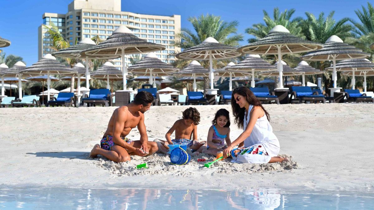 Гости могут расслабиться в шезлонгах на белом песчаном пляже или в частных кабинках для переодевания с услугами дворецкого, а затем окунуться в прохладный пейзажный бассейн с баром у кромки бассейна с видом на Персидский залив. Здесь также есть большое джакузи на открытом воздухе и отдельный тенистый бассейн для детей с веселой водной горкой и игровой площадкой.