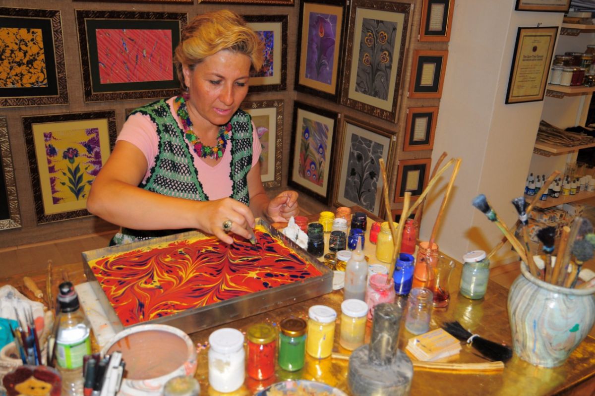 Гюлер Сомтюрк представляет это искусство, которому она обучалась в "Турецком и мусульманском реставрационном образовательном центре", уже 14 лет. Она сама знакомит посетителей со своими работами, проводит мастер-классы по мрамированию.