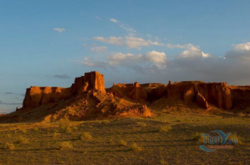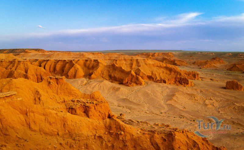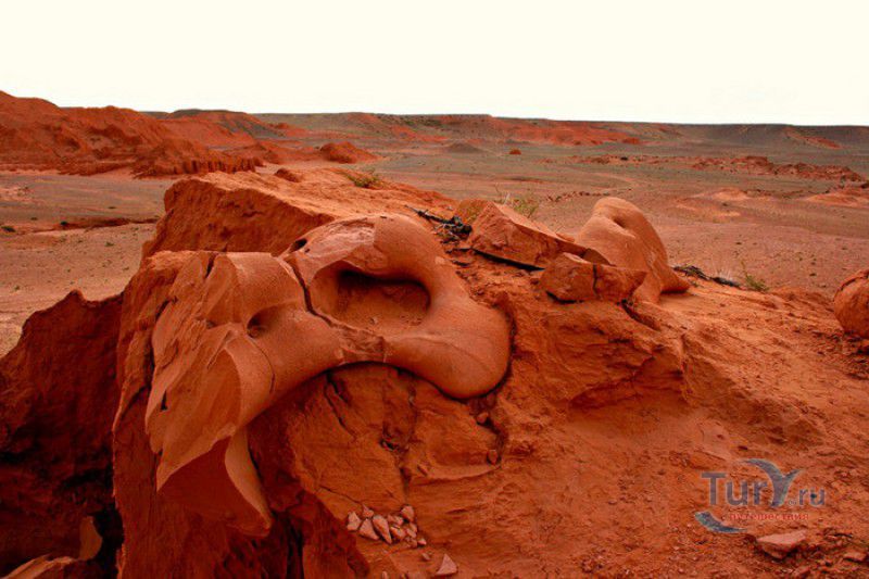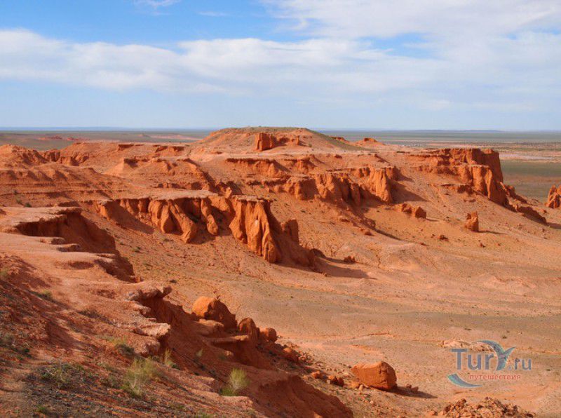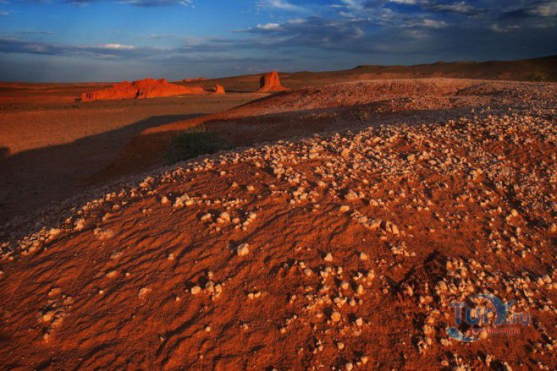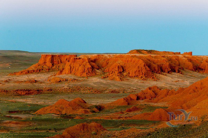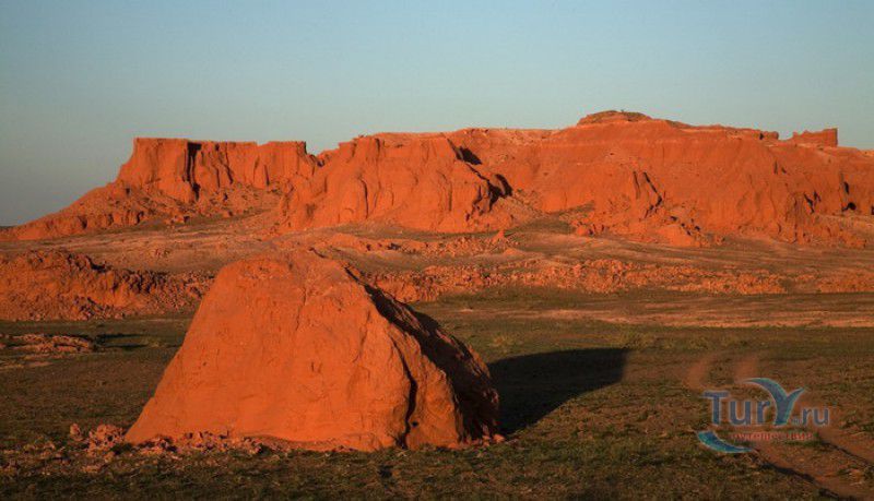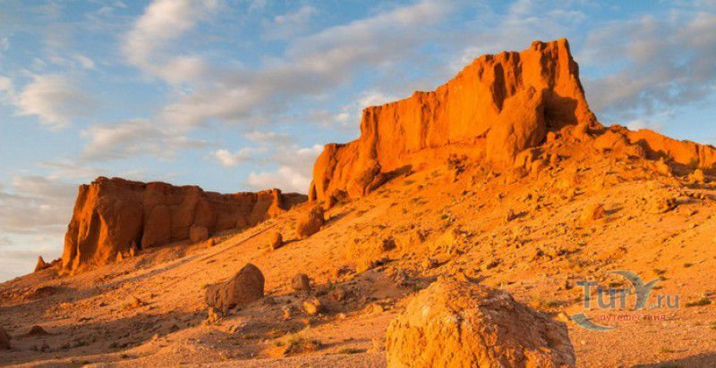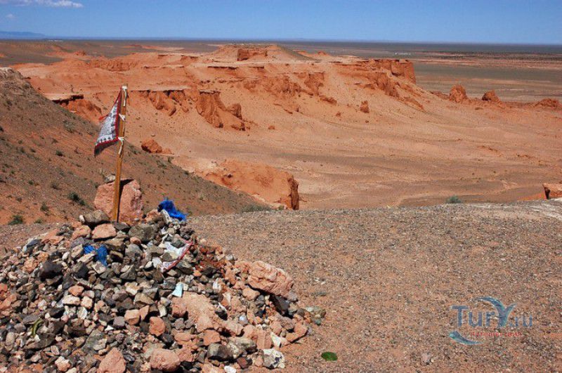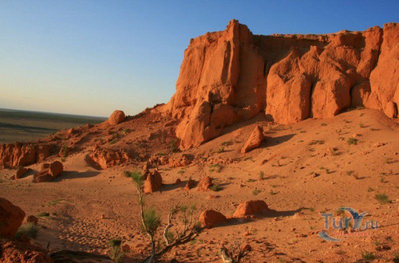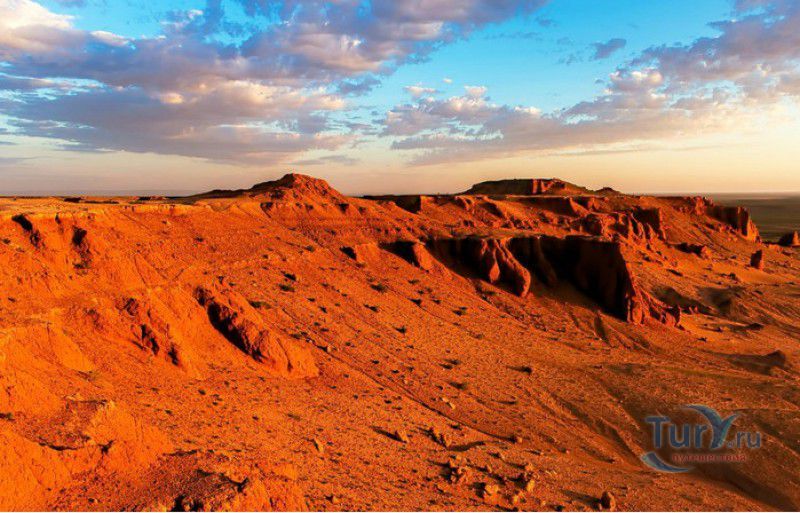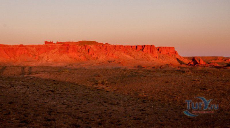 Скалы Баянзаг (Пылающие Скалы) расположены на юге Монголии, в провинции Умнеговь, в пустыне Гоби, в 90 километрах к северо-западу от города Даланзадгад. В переводе с монгольского Баянзаг означает "богатые саксаулом", так местные жители назвали эти скалы из-за обильно растущего на их склонах колючего кустарника (любимого лакомства верблюдов). Пылающими их назвал американский палеонтолог Рой Чепмен Эндрюс из-за красно-оранжевого цвета песчаника, из которого эти скалы сложены. В лучах восходящего солнца и на закате скалы словно пылают, охваченные огнём. Но не только красивые виды привлекают сюда туристов - Баянзаг является одним из самых знаменитых палеонтологических захоронений в мире. В 1920-х годах экспедиция Американского музея естественной истории, возглавляемая Эндрюсом, обнаружила здесь гнездо с окаменелыми яйцами динозавра Теропода овираптора (внутри одного яйца учёные обнаружили остатки зародыша), а также окаменелые останки хищного динозавра Велоцираптора и плацентарных млекопитающих, населявших эти места 60-80 миллионов лет назад. Эти находки произвели сенсацию в мировом научном сообществе. Экспедиции следовали одна за другой, палеонтологами были обнаружены кости и черепа динозавров, некоторые виды которых до этого времени науке были неизвестны. Туристам, посещающим Баянзаг, и сейчас местные торговцы предлагают "совсем недорого" яйца, кости динозавров и окаменелости доисторических животных. Однако, следует помнить, что ещё в середине XX века в Баянзаге палеонтологами были извлечены из земли все ценные находки, а, кроме того, незаконная торговля и вывоз окаменелостей динозавров за пределы Монголии строго запрещены и могут грозить, в лучшем случае, огромными штрафами. Но красота этих мест никуда не исчезла - вот как описывал Баянзаг писатель-фантаст и палеонтолог Иван Ефремов, побывший здесь с экспедицией в конце 1940-х годов: "И все же ни с чем не сравнимую, совершенно фантастическую картину представляла котловина вечером, минут за десять до захода солнца. Круглые обрывы изъеденных ветром древних песчанистых отложений полыхали ярко-красным пламенем. Казалось, вся котловина превратилась в море огня. Этот неожиданный эффект объяснялся просто: лучи заходящего солнца освещали древние красноцветные песчаники стен котловины и останцы, создавая совершенно реальное представление "пылающих скал"".