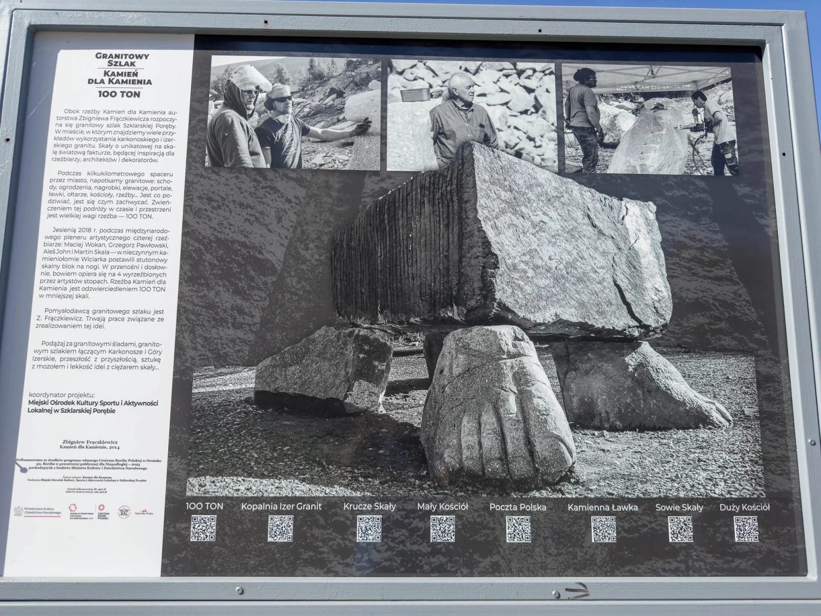Оригинальное произведение, монументальная инсталляция "100 тонн", украшающая Йизерские горы, расположена на территории заброшенной шахты Вичарка. "Камень за камень" находится на улице Килиньского, откуда открывается путь к Йизерским горам. Путешествие по этому маршруту предоставляет возможность исследовать уникальные места, связанные с крконошским гранитом, материалом, вдохновлявшим художников на протяжении веков. Создание "Камня за камнем" состоялось в рамках международной выставки под открытым небом в Стшегоме в 2014 году и с тех пор экспонировалось в различных уголках региона, став символом наследия Крконоше-Изеры, высеченного природой и человеческими руками. Тропа "100 тонн" ведёт к гранитным сооружениям, фигурам снеговиков из гранита, гранитной шахте и тихим уголкам для отдыха, связывая две скульптуры З. Фрончкевича.