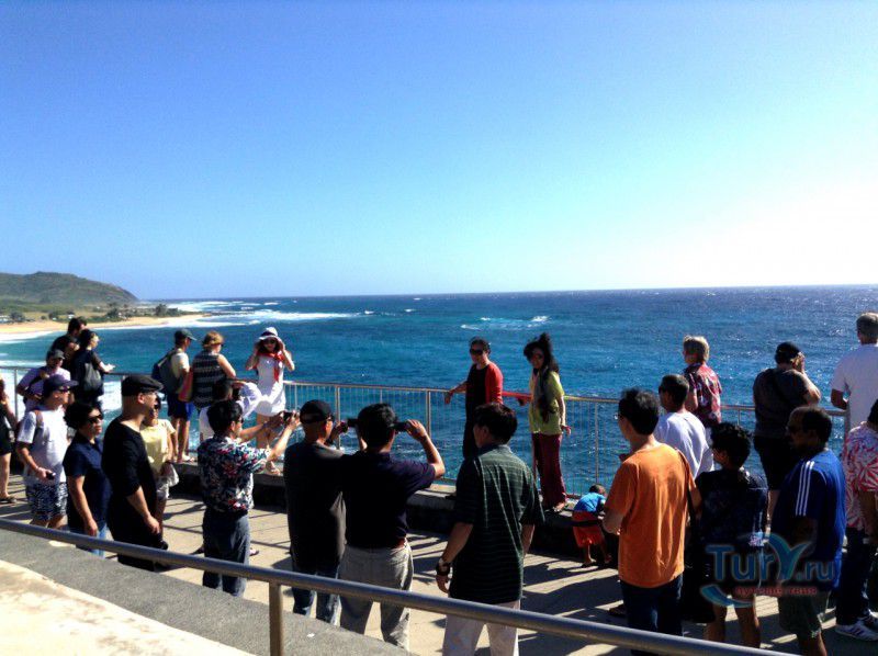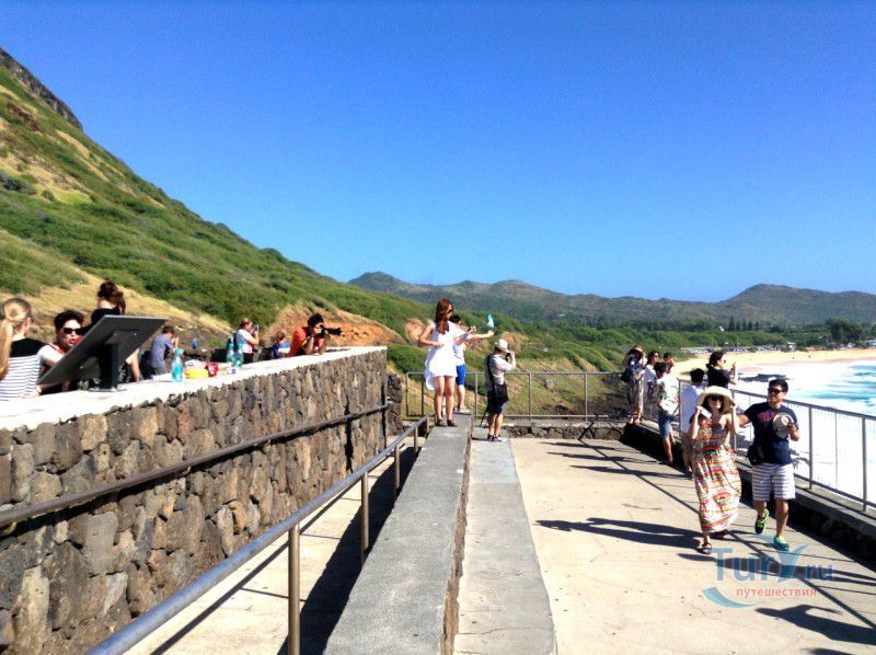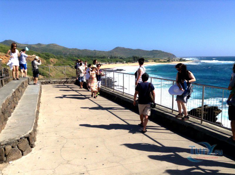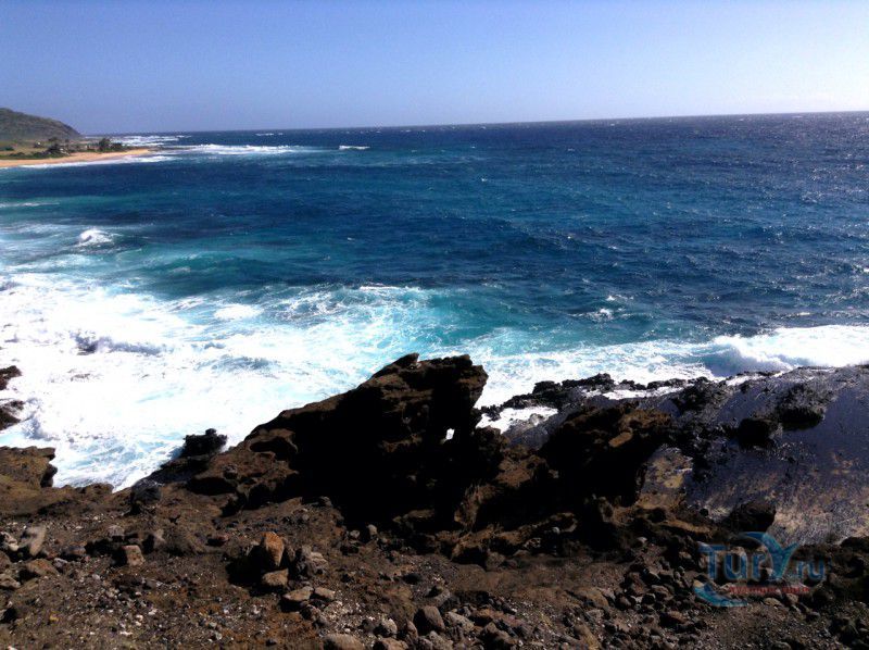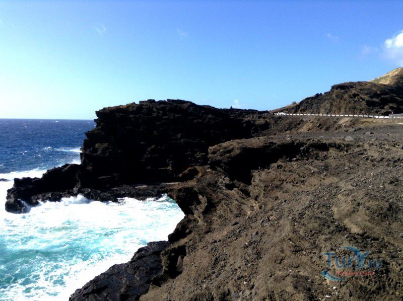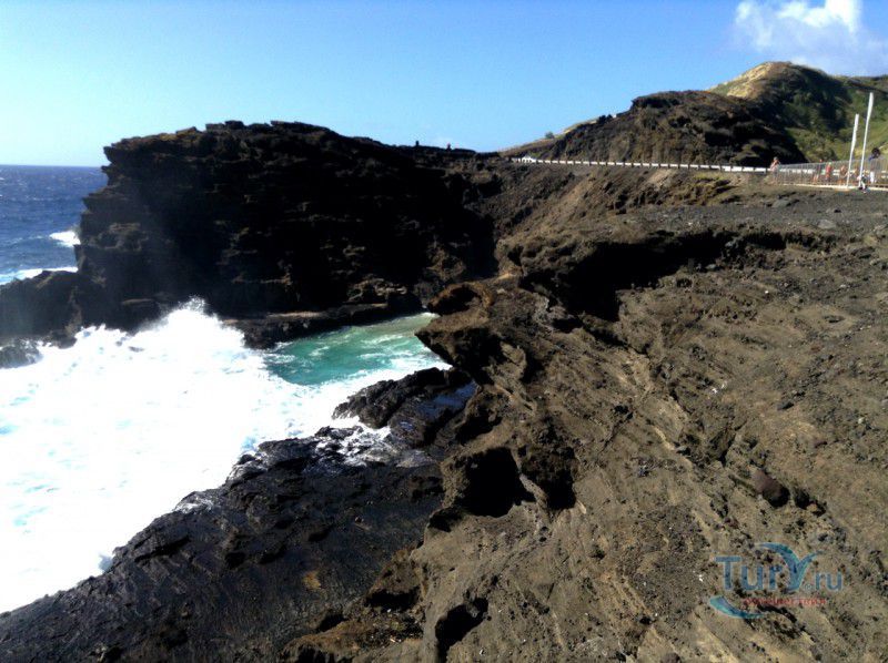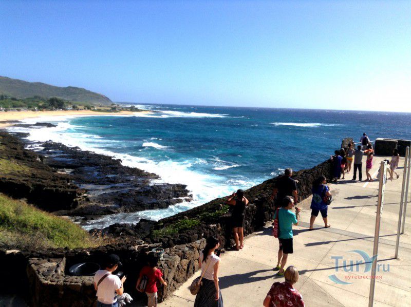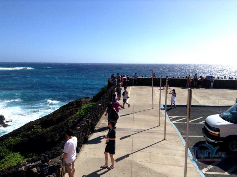 Панорамная площадка Halona Blow Hole Lookout расположена на юго-восточной оконечности острова Оаху - одного из островов Гавайского архипелага. Здесь же в недрах скал находится пещера Halona Cove. Стоя на площадке, можно часами наблюдать за тем как неистовые волны, наваливаясь на черные вулканические скалы побережья, разбиваются в дребезги, создавая огромные столбы белоснежных брызг. С пронзительным воем и свистом продолжая свою титаническую работу снова и снова. Брызги, подсвеченные солнечными лучами, образуют радугу, которая, порадовав немного, тает на глазах и, словно по волшебству, возникает уже в другом месте. Сочетание красок - ярко-голубого неба, темно-синего моря, белоснежно-белых брызг и черных скал, разукрашенных семицветной радугой, интригует и завораживает. Природа поистине великий художник, которому нет равных. С панорамной площадки Halona Blow Hole Lookout хорошо виден Sandy Beach Park, который расположен в 500 метрах на восток.