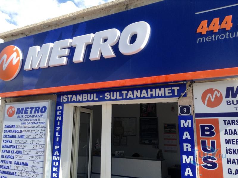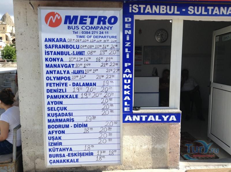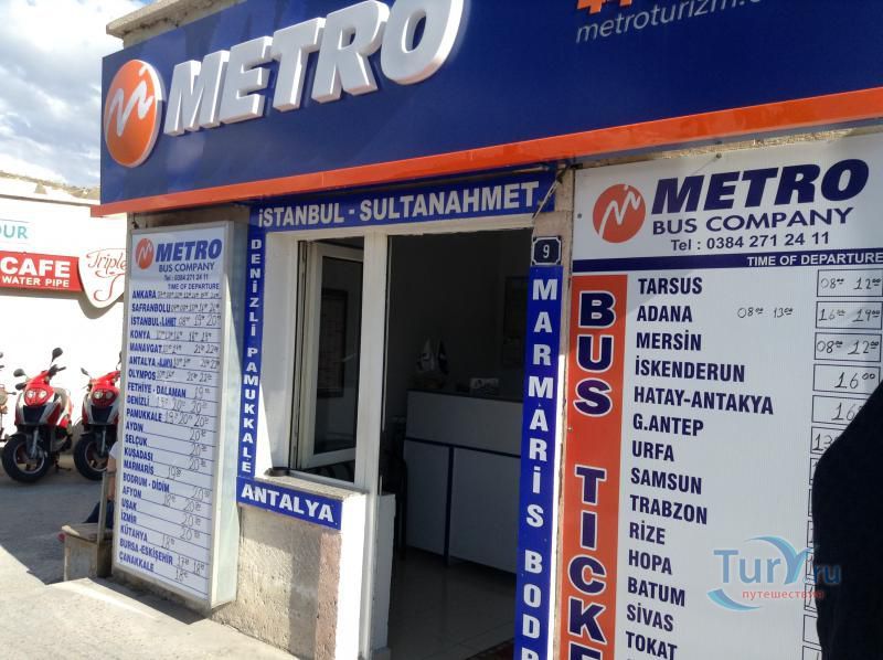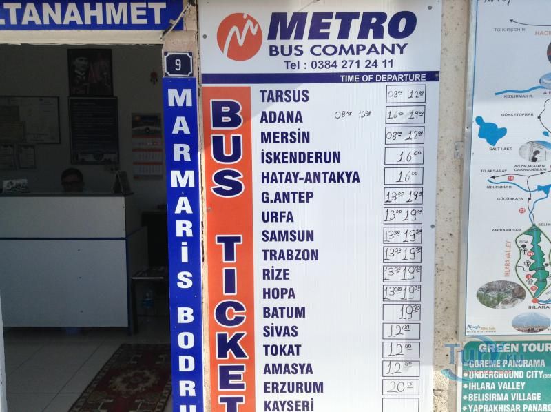 В центральной части Гёреме на площади у Автобусной Станции Bus Station расположилась автобусная компания Metro Bus Company. Компания продает автобусные билеты из Гёреме практически по всем важнейшим направлениям Турции, таким как Стамбул, Анкара, Конья, Манавгат, Анталья, Аланья, Олимпос, Фетхие, Даламан, Памуккале, Кушадасы, Мармарис, Бодрум, Измир и другие города и курорты Турции. Компания Metro Bus предлагает современные комфортабельные автобусы с раскладывающимися до спального уровня сидениями, встроенными мониторами и наушниками. В дороге через USB-порт можно подзарядить свою технику и воспользоваться Wi-Fi интернетом. Стюарды автобуса следят за порядком, помогают с загрузкой и разгрузкой багажа, а также бесплатно предлагают горячие напитки - чай, кофе или прохладительные - воду, соки и печенье во время путешествия к месту следования.