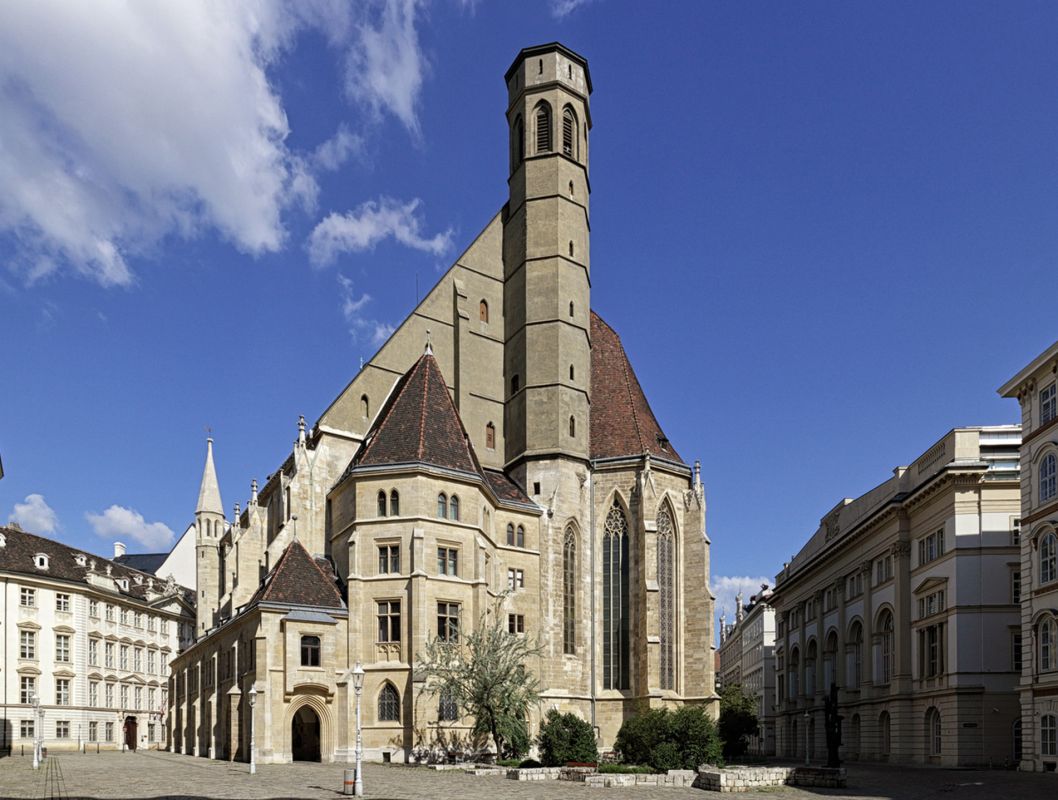 Церковь миноритов была заложена в 1275 году, став одной из первых церквей в готическом стиле в Вене. Первые изменения в архитектуре здания произошли довольно быстро: в 1328 году была построена часовня в честь Людовика IX Святого. Часовня имела отдельный вход и не соединялась с церковью. Однако, объединение произошло уже в 1340 году, создав трехнефное единое помещение.