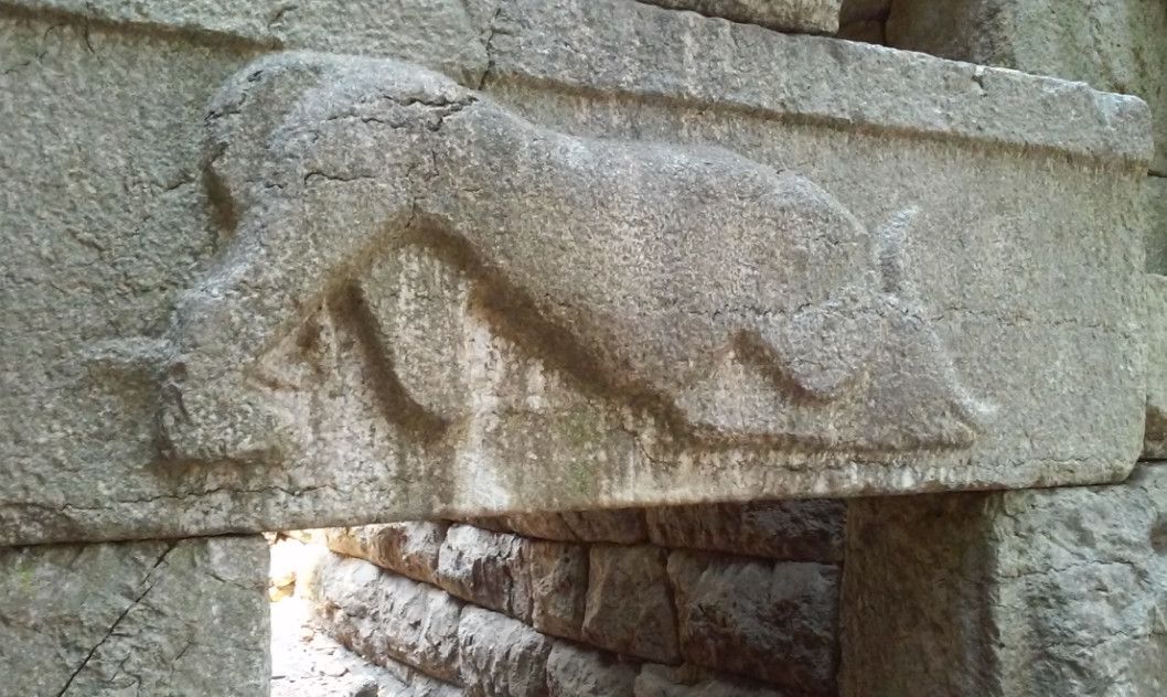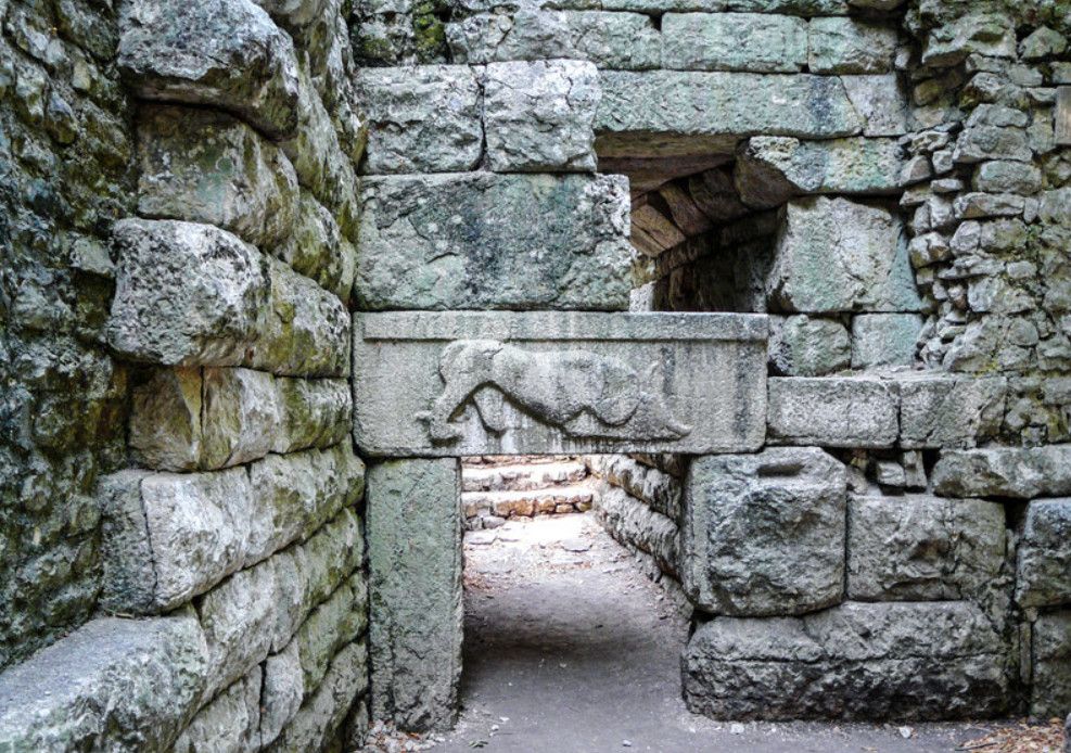 Так называемые Ворота Льва берут свое имя от рельефного изображения льва, пожирающего голову быка, помещенного выше входа. Изображение льва не было частью оригинальной стены, но было помещено сюда в 5-ом столетии нашей эры, чтобы уменьшить размер ворот и облегчить защиту. Рельеф здания храма может датироваться уже с 6-ого столетия до н.э. Родник в воротах был в течение римских времен, связанных с культом нимф. Надпись перед воротами, посвященная гражданину Бутринта, Хунии Руфине, которая заплатила за восстановление родника в 2-ом столетии нашей эры гласит: "Хуния Руфина, друг нимф”. Рельеф здания из известняка, расположенного ближе к Воротам Льва, намного более ранний, чем старинные ворота, которые были построены позже. Стилистически рельеф может быть датирован 6-ым столетием до н.э. Рельеф изображает в профиле льва, который пожирает голову быка. Голова и шея быка показана между челюстей льва, и только его рога ясно прорисованы и обеспечивают идентификацию животного. От льва не сохранились его передние лапы, и так же вся детализация головы была стерта, кроме слабой схемы одного скругленного уха.