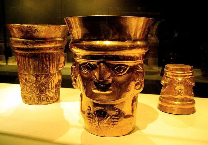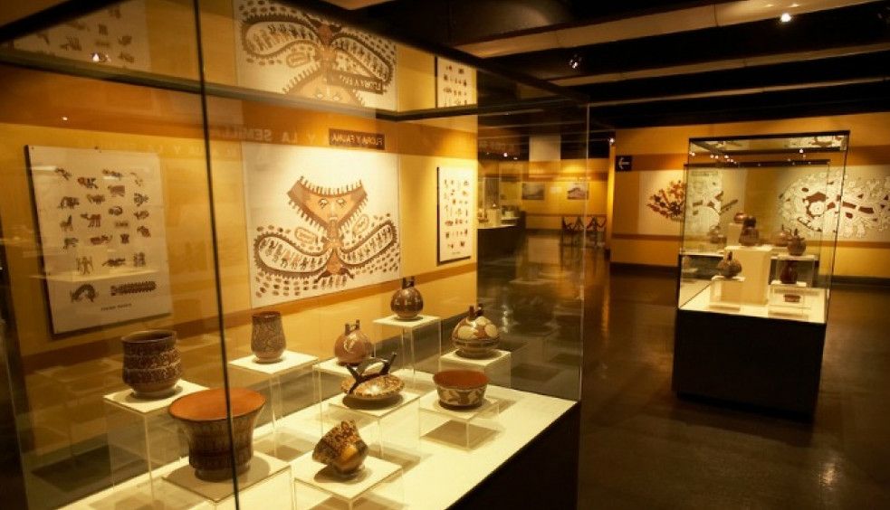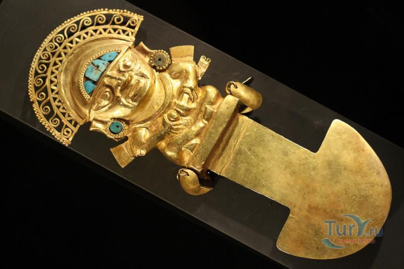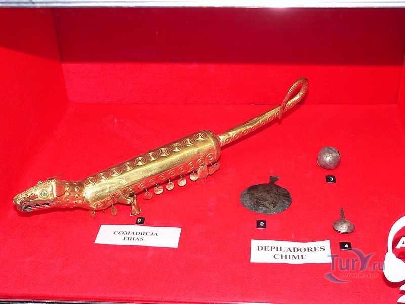 В музее представлены самые разнообразные артефакты: золотые маски, наплечники, различные украшения - диадемы, короны, ожерелья, ножи для ритуалов, винные кубки, украшенные пластинами из золота туники, обои из золота и серебра. Уникальным экспонатом музея является человеческий череп с искусственными зубами из горного хрусталя. Есть также череп со следами трепанации, в котором сделали два отверстия, прикрытые знахарем золотыми пластинами. В музее хранится мумия инкского правителя. Можно также ознакомиться с уникальными образцами легендарной письменности перуанских индейцев - узелковым письмом кипу.