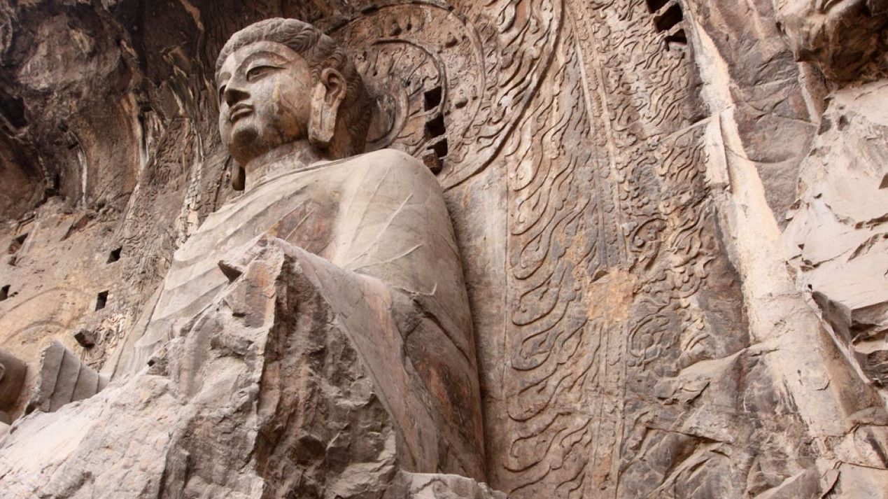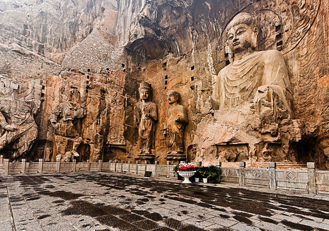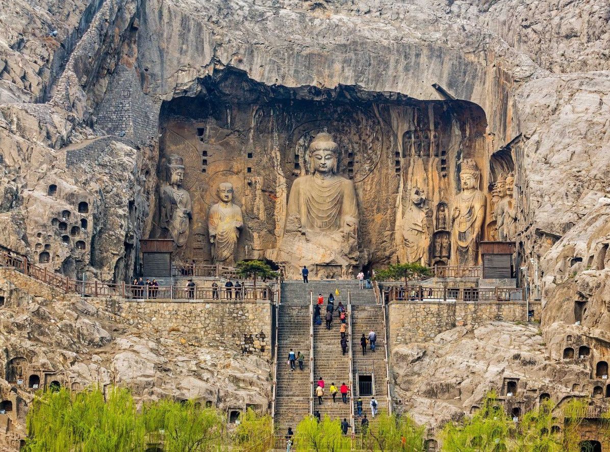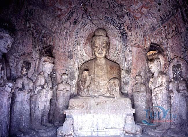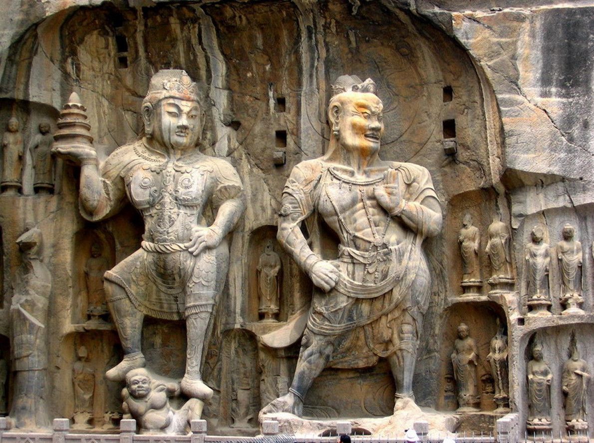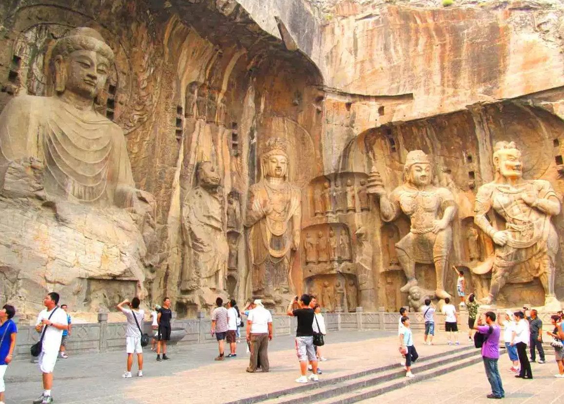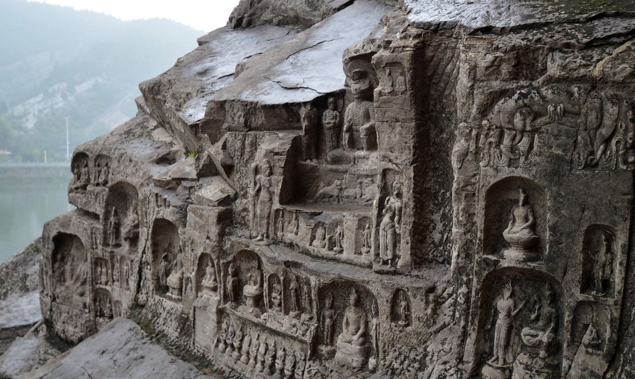 Традиция вырезать в скале гроты со статуями Будды пришла в Китай из Индии вместе с буддизмом. Скульптуры в гротах и на склонах, надписи и графические элементы свидетельствуют об определённых изменениях стиля, связанных со временем их создания. Самые крупные гроты с известными скульптурами и надписями: Гуанг-донг, работа в котором началась в 493 году, Биньянг-донг - 505 год, Лианхуа-донг - 520 год, Шику-си - 520 год, Шиску - 520 год, Яофанг-донг - 570 год, Дзайфу-донг - 636 год, Фахья-донг - 650 год. Надписи здесь самые разные, например одни выражают причины, по которым человек решил создать здесь буддистскую статую, другие отмечают добрые и благочестивые дела, а третьи - это просто записи о путешествиях или выражения людских эмоций. Все эти изречения искусно выполнены в самых разных стилях каллиграфии: печатные иероглифы, официальный шрифт, наклонный и обычный.