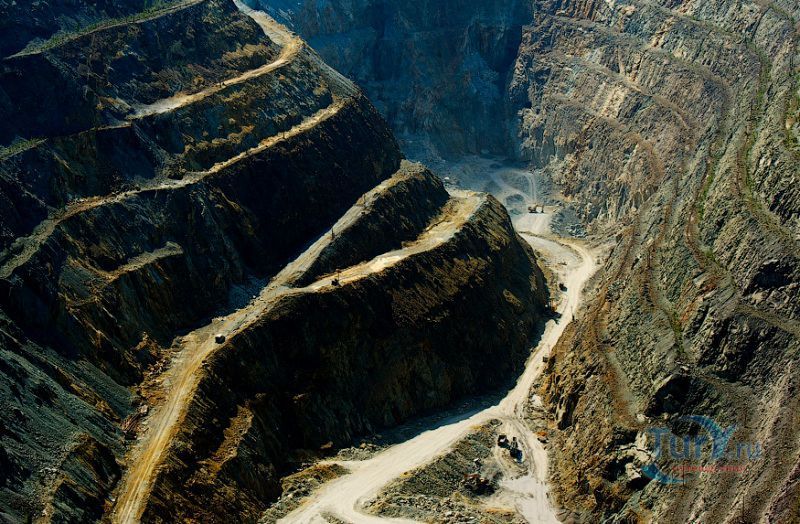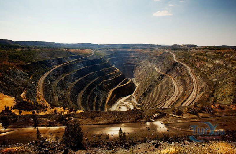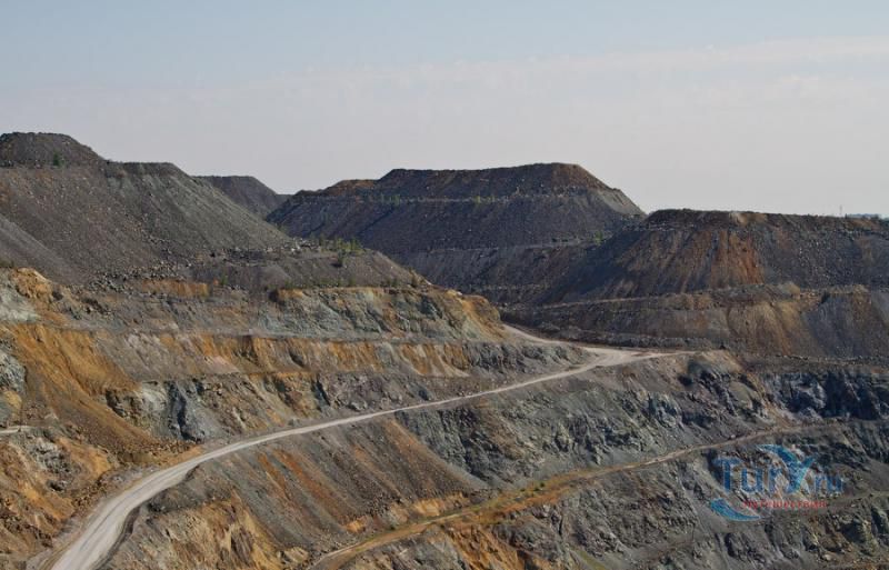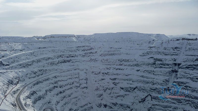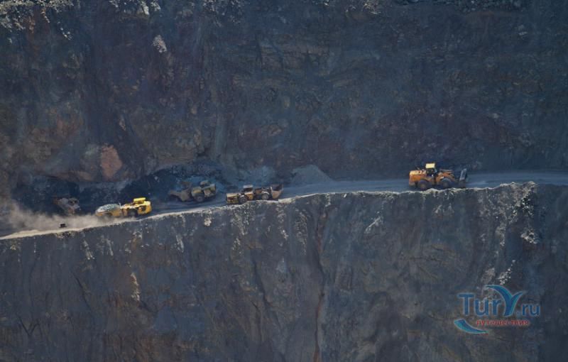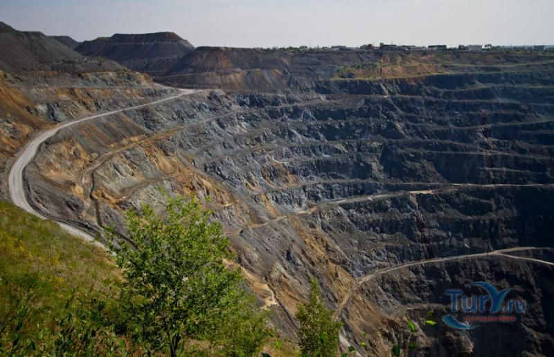 Недалеко от карьера возвышаются огромные навалы пустой породы. На краю карьера действует смотровая площадка. Попасть на нее можно обратившись в местную турфирму "Буранбай", которая сотрудничает с комбинатом. Вам организуют пропуск и провожатого.