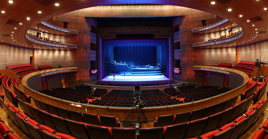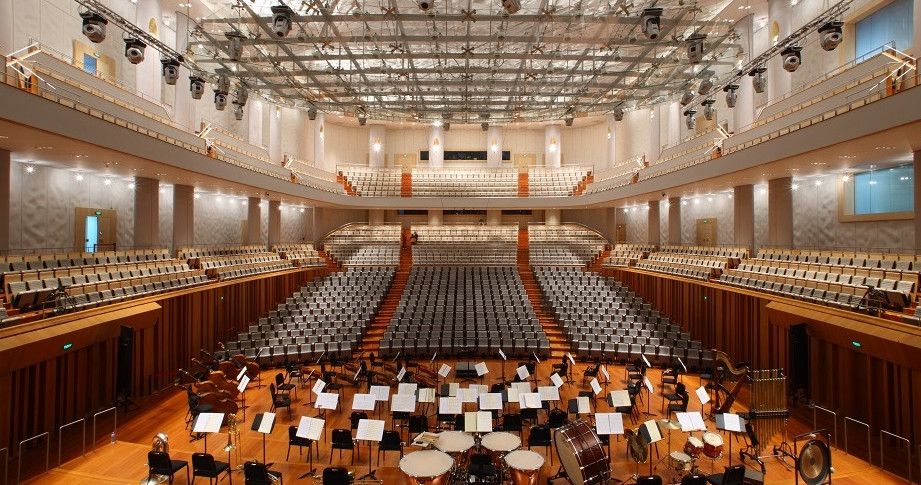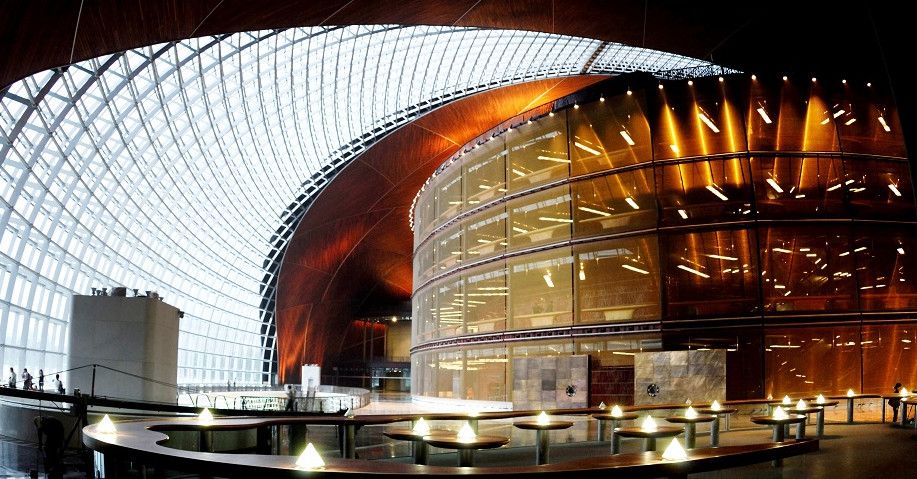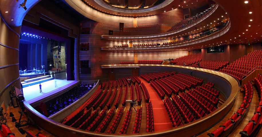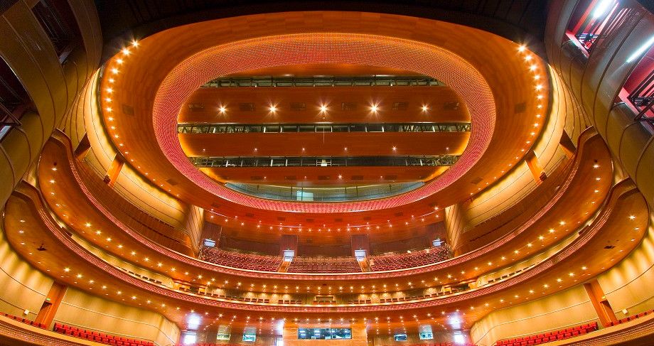 Три зала театра могут вместить 5452 человека. Дом Оперы вмещает 2398 человек и предназначен для опер, танцевальных представлений и балетов. В Театральном Зале 1035 мест - здесь играют современные пьесы и проводят представления Пекинской Оперы. И, наконец, Концертный Зал, предназначенный для симфонических концертов и национальной музыки, может вместить 2019 человек. Здесь также находится множество выставочных залов, интегрированных в единое пространство.