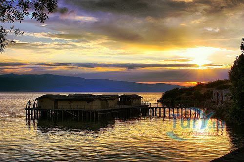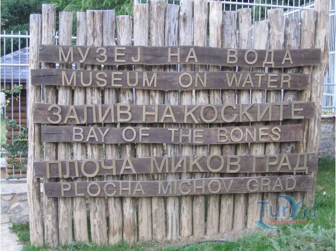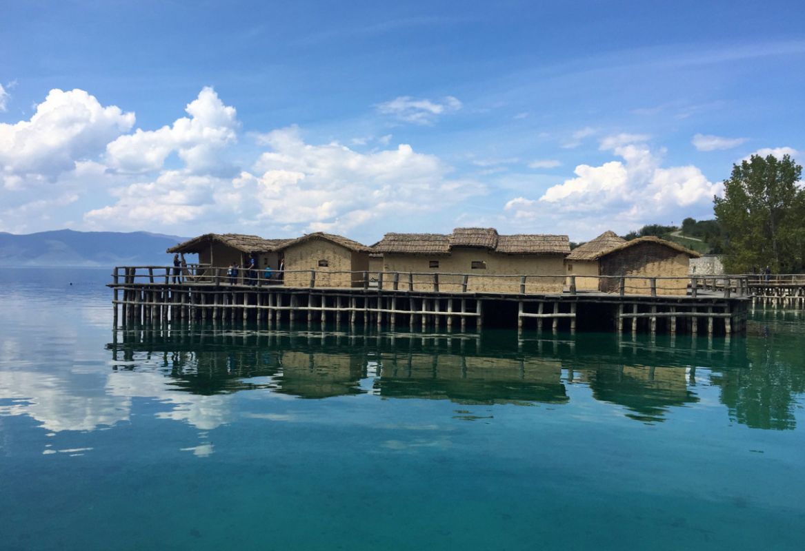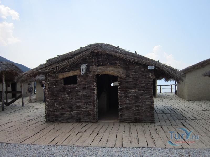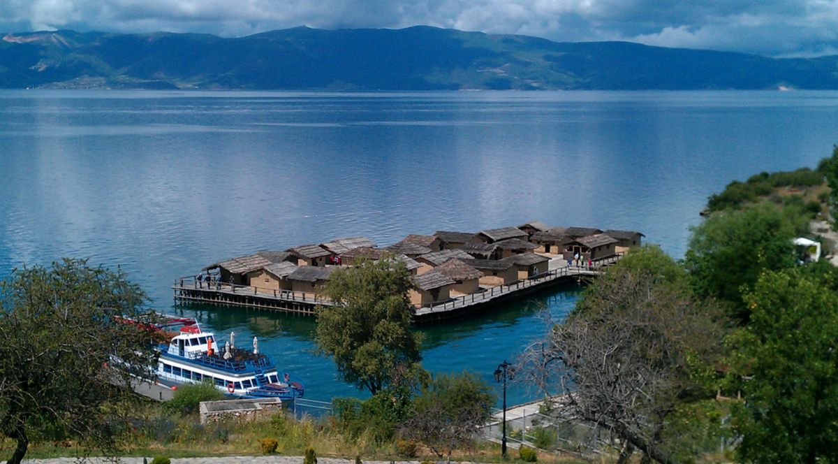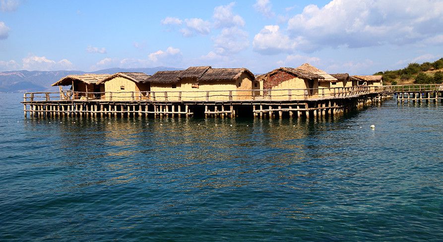 На юге полуострова Градиште, в 20 минутах езды на юг от македонского города Охрид, ученые реконструировали доисторическое поселение на воде. На дне Охридского озера, в месте, которое сейчас называют Заливом на костях, в 1997 году были найдены остатки поселка, которому свыше трех тысяч лет, и было решено воссоздать его в первозданном виде.Поселение было расположено в 20 метрах от берега, с которым его соединял деревянный мостик. На шести тысячах 4-6-метровых свай был деревянный настил, а на нем хаты-мазанки из прутьев и глины, под соломенными крышами. Дома приблизительно на 1,5 метра возвышались над водой. Толстый слой из остатков свай, посуды и костей животных археологи-водолазы нашли на дне. Они считают, что люди жили в этом селе не целый год, а только в теплую пору, когда рыбачили. Скот пасся на берегу.