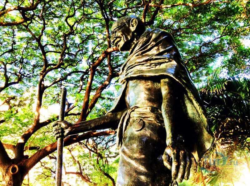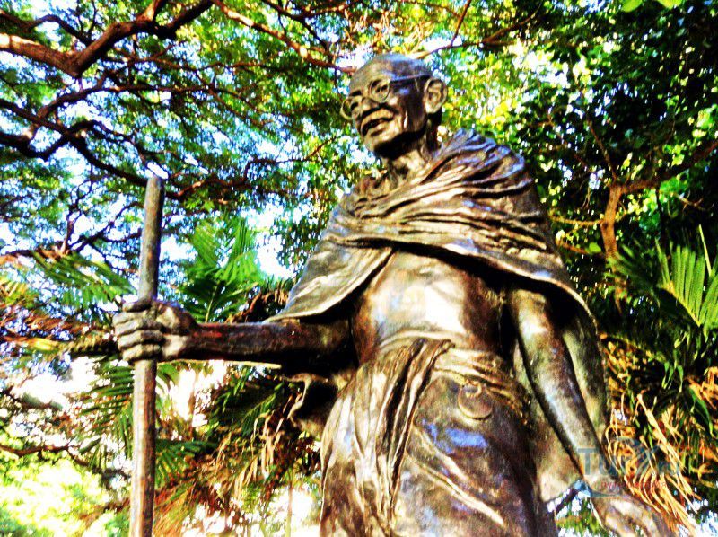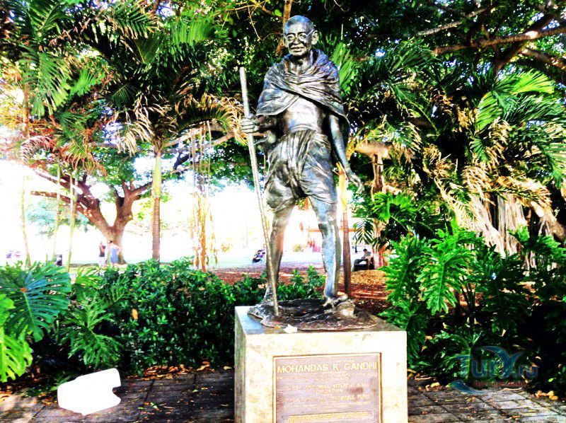 Памятник индийскому философу, руководителю и идеологу движения за независимость Махатма Ганди (полное имя Mohandas Karamchand Gandhi) установлен в Парке Королевы Капиолани (Queen Kapiolani Regional Park), который раскинулся на берегу Тихого океана в южной части острова Оаху, в знаменитом районе Вайкики города Гонолулу. Скульптура изображают Ганди в преклонном возрасте, с мудрым лицом в очках, идущего босиком и опирающегося на посох. Годы жизни Ганди: родился 2 октября 1869 года в г.Порбандар, Гуджарат — убит 30 января 1948 в Нью-Дели. Титул Махатма, что означает "великая душа", дал Ганди индийский писатель, лауреат Нобелевской премии по литературе Рабиндранат Тагор. Махатма Ганди проповедовал сатьяграху - философию ненасилия, которая оказала огромное влияние на движения сторонников мирных перемен во всем мире. Он ратовал за отмену кастовости и за равноправие в Индии, боролся за независимость Индии от Великобритании.