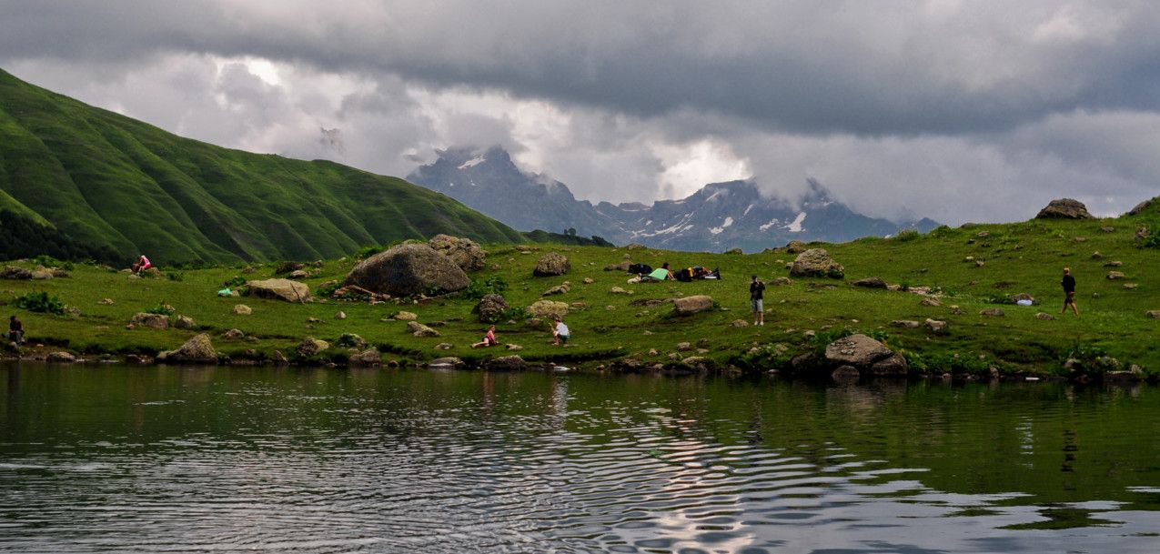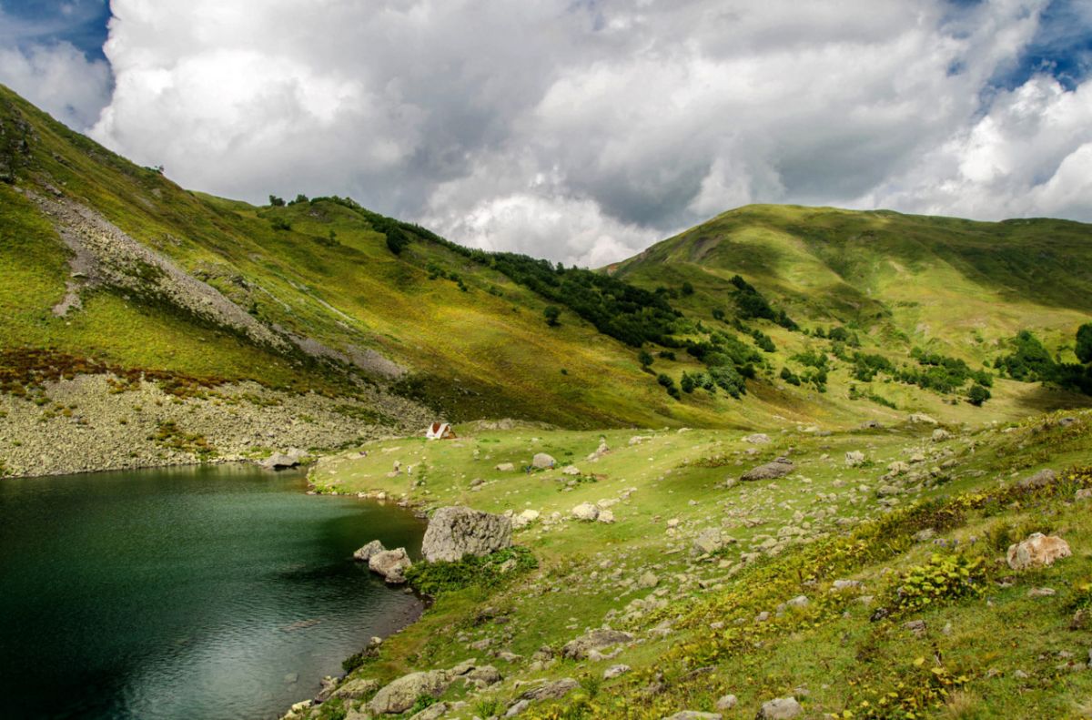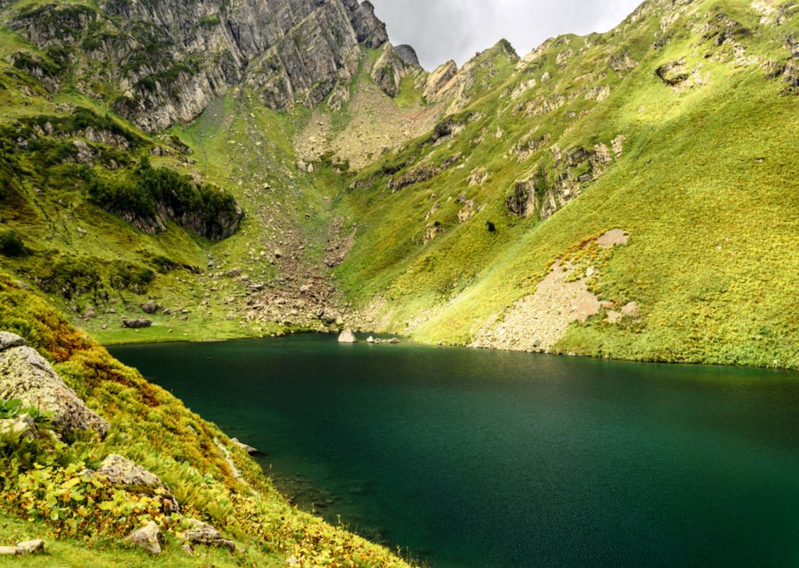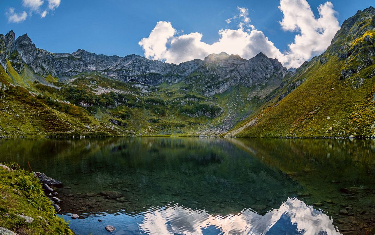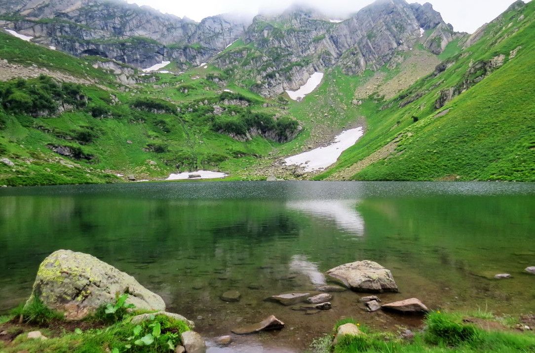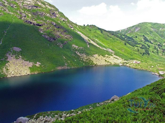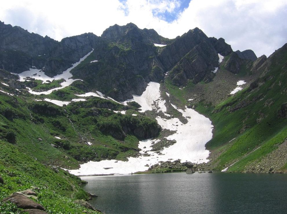 Высокогорное озеро Мзы - одно из самых живописных мест Абхазии, оно расположено выше озера Рица и минеральных источников Аудхара, на высоте 2000 метров над уровнем моря. Снег здесь практически не тает, и, даже, летом, на фоне яркой зелени лугов можно встретить островки снега и льда. Длина озера – 100 метров, ширина 45 метров, глубина – 40 метров, а температура воды - всего +4 °C.