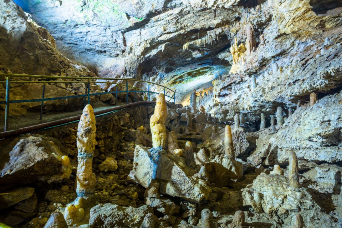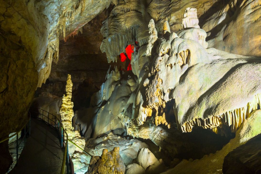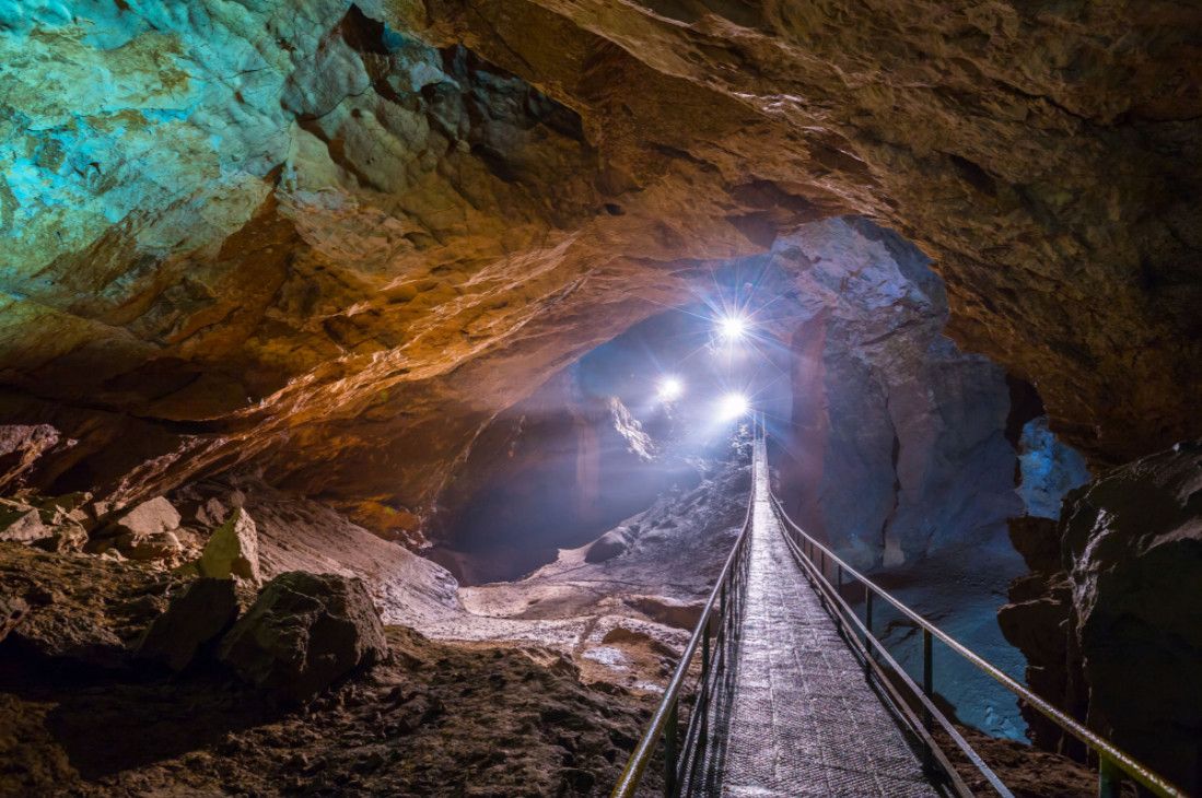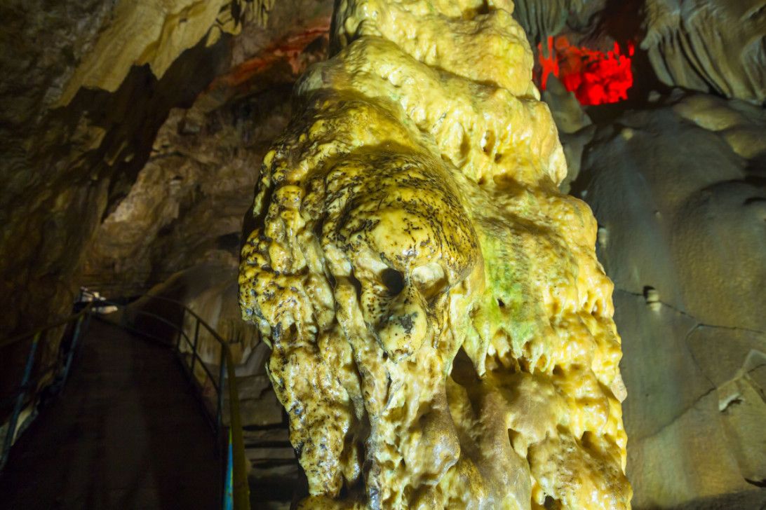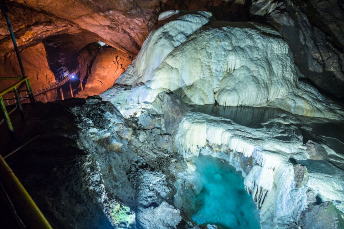 Новоафонская пещера - одна из крупнейших и красивейших карстовых пещер в мире, своими размерами она может посоперничать с Шкоцианской пещерой в Югославии и Карлсбадской в США. Объем только исследованной части пещеры составляет более 1,5 миллионов кубических метров. Расположена пещера в Новом Афоне (Абхазия), на склоне Иверской горы. Открыта она была сравнительно недавно - в 1961 году житель Нового Афона Гиви Смыр (сейчас известный художник и спелеолог) с помощью обычной верёвки впервые спустился в большой провал "Бездонная яма". В этом же году спелеологи начали исследование пещеры, а в 1975 году 9 залов были открыты для посетителей - по искусственному туннелю, проведенному к пещере, прошёл первый поезд "пещерного метро" с туристами. В ходе экскурсии по Новоафонской пещере посетители увидят протянувшиеся на сотни метров огромные залы и вьющиеся причудливыми меандрами галереи. Пещерный ландшафт просто поражает своим разнообразием и красотой - сумрачные нижние залы, сверкающие белизной великолепные сталактитовые дворцы, изумрудные пещерные озера, каменные валы, "музыкальные" гроты и кристаллические образования самых разнообразных форм и расцветок. В залах пещеры сооружена пешеходная дорожка длиной 1,4 километра с обзорными площадками и устроено художественное освещение. Все залы озвучены.