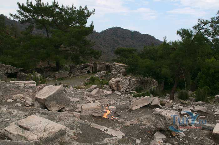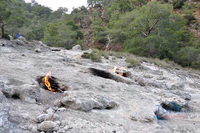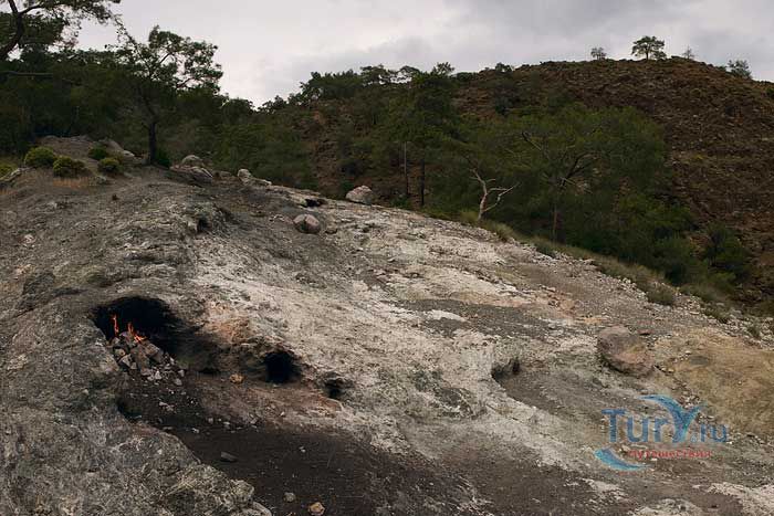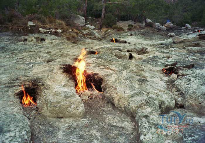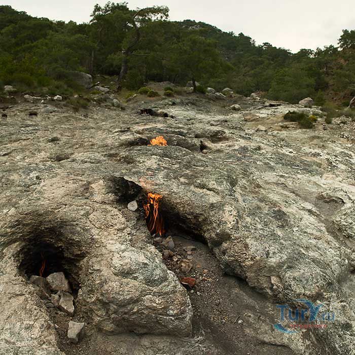 Гора Янарташ, что в переводе означает "Горящая гора", известная еще под названием Химера, расположена недалеко от селения Чиралы. Это удивительная гора, пламя на которой не гаснет тысячелетиями. С научной точки зрения это происходит из-за скопившегося внутри горы природного газа. При выходе газа на поверхность происходит его соединение с кислородом, в результате чего и начинается возгорание, образуя небольшие огненные языки. Многие гору называют Химерой. Химера в греческой мифологии – это чудовище с головой и шеей льва, туловищем козы, хвостом в виде змеи. Существует легенда, что греческий герой Беллерофонт убил изрыгающее огонь чудовище – Химеру и засыпал ее глыбами. Прошли столетия, а химера до сих пор дает о себе знать пламенем, которое вырывается на поверхность горы Янарташ. Особенно красива гора в ночное время суток, удивительная панорама открывается со стороны Средиземного моря. После посещения горы Янтараш остается незабываемое впечатление от увиденного - это поистине сказочное место, которое не хочется покидать.