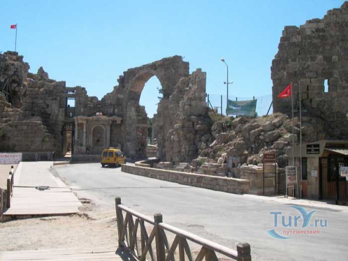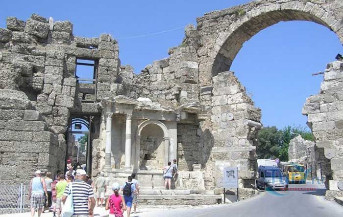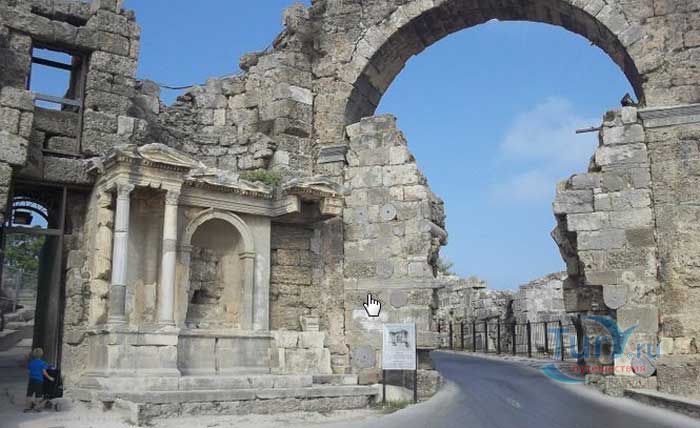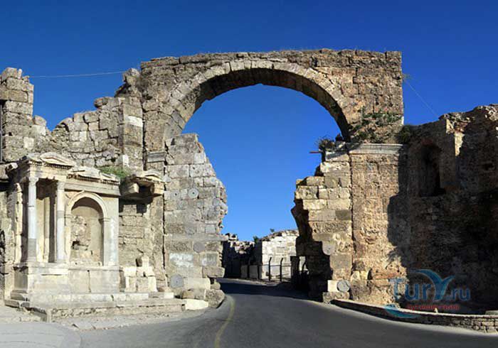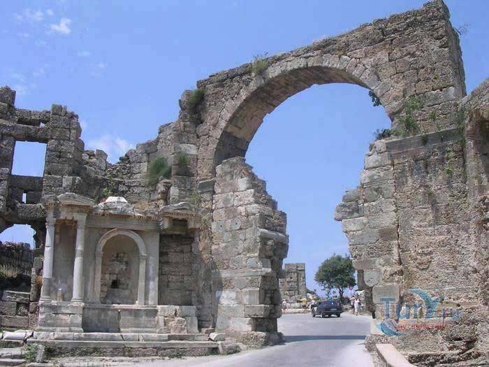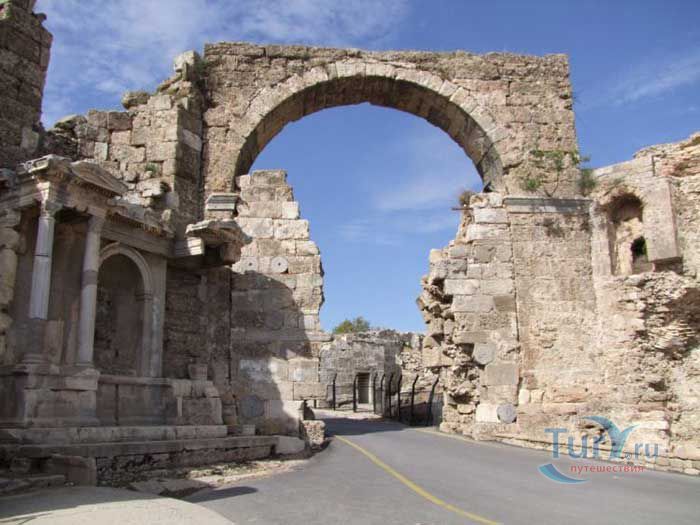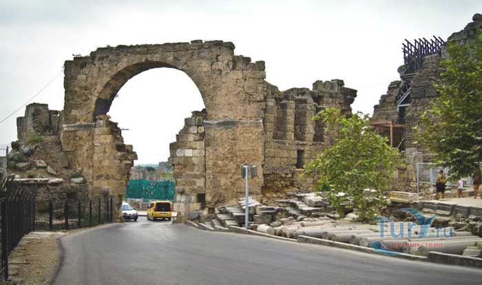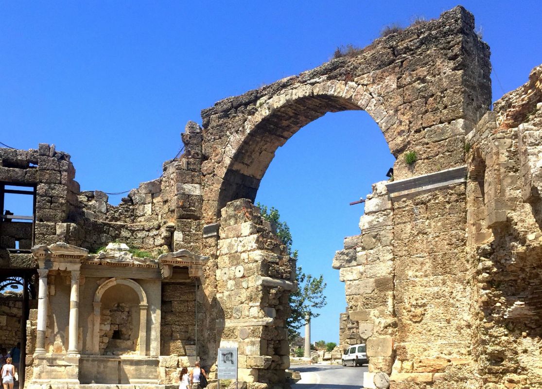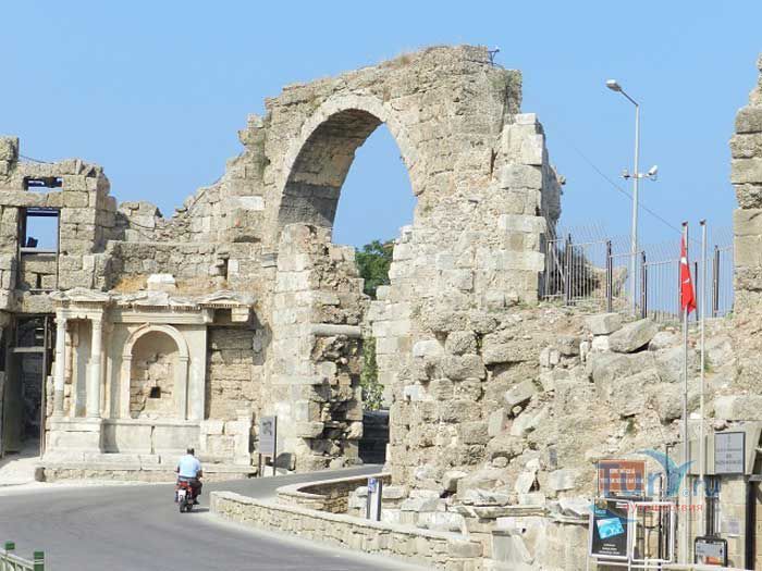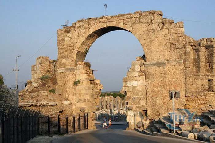 Центральные арочные ворота античного города Сиде представляют собой массивное сооружение, которое когда-то имело очень большое значение для города. Высота главных ворот античного города составляет около 10 метров. Историки считают, что это самые старые ворота, которые много раз отстраивались и реставрировались от многочисленных повреждений после сражений. По бокам были построены оборонительные башни, с которых хорошо просматривался вход в город. Двухэтажные ворота, сохранившиеся до наших дней, были построены во время римской эпохи на Средиземноморском побережье. Вторые по величине ворота города были расположены на востоке города. Во время землетрясения они были полностью разрушены и длительное время оставались в глубине песков. В ходе восстановительных работ они почищены и установлены на блочных камнях.