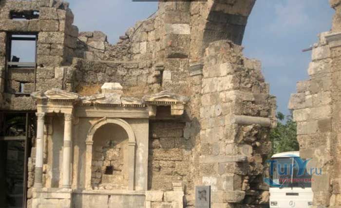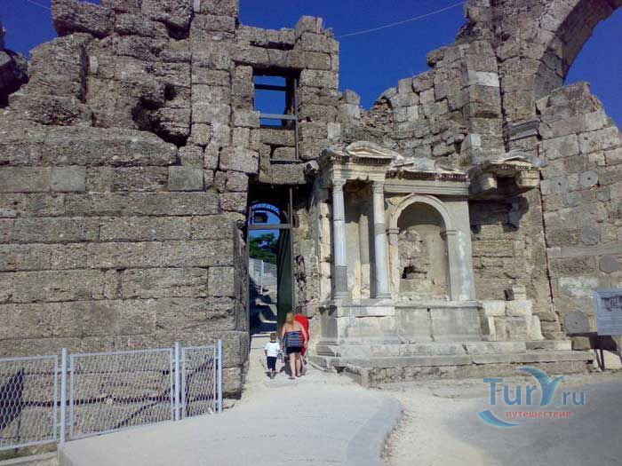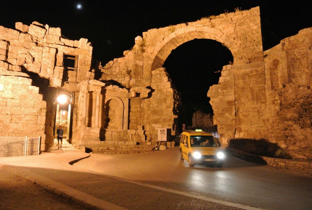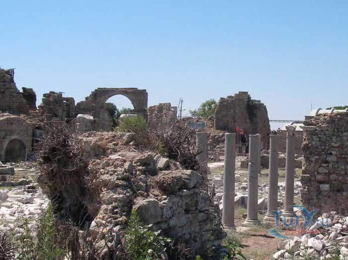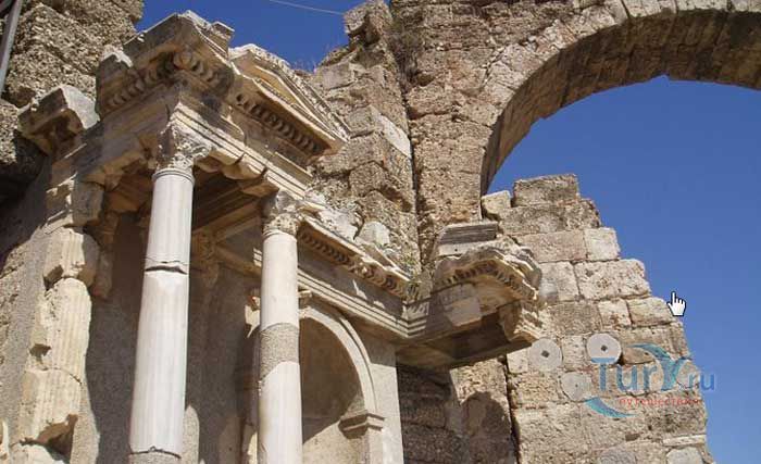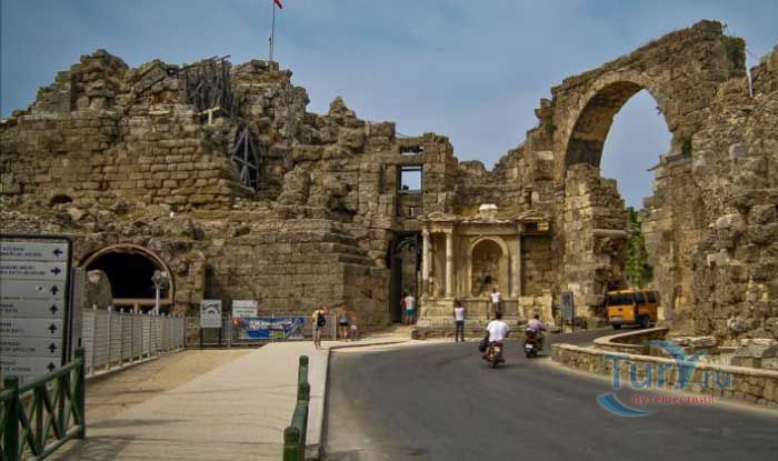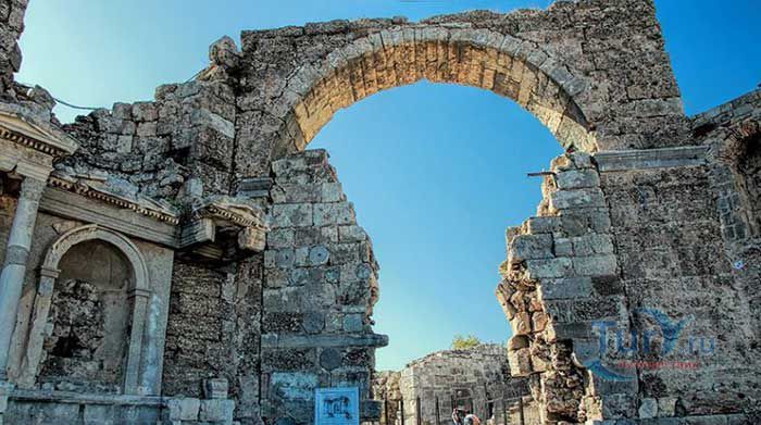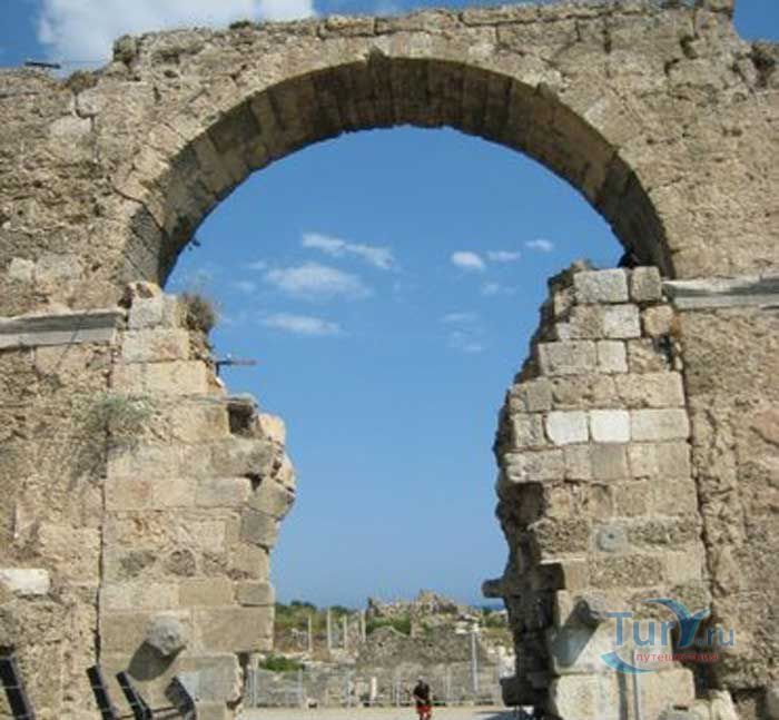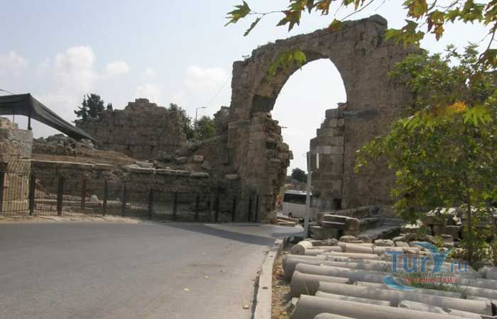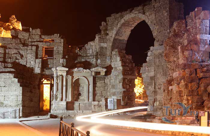 Центральные арочные ворота античного города Сиде представляют собой массивное сооружение, которое когда-то имело очень большое значение для города. Высота главных ворот античного города составляет около 10 метров. Историки считают, что это самые старые ворота, которые много раз отстраивались и реставрировались от многочисленных повреждений после сражений. По бокам были построены оборонительные башни, с которых хорошо просматривался вход в город. Двухэтажные ворота, сохранившиеся до наших дней, были построены во время римской эпохи на Средиземноморском побережье. Вторые по величине ворота города были расположены на востоке города. Во время землетрясения они были полностью разрушены и длительное время оставались в глубине песков. В ходе восстановительных работ они почищены и установлены на блочных камнях.