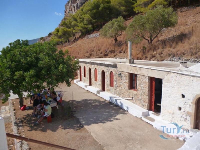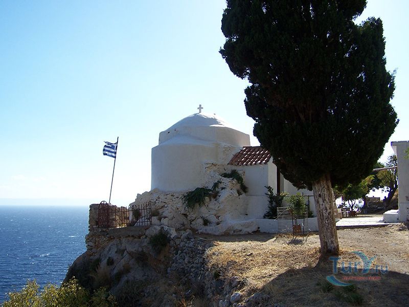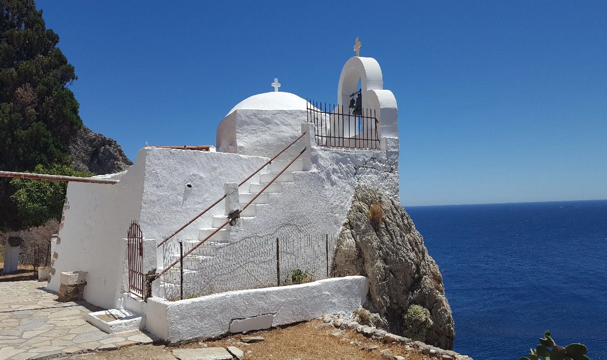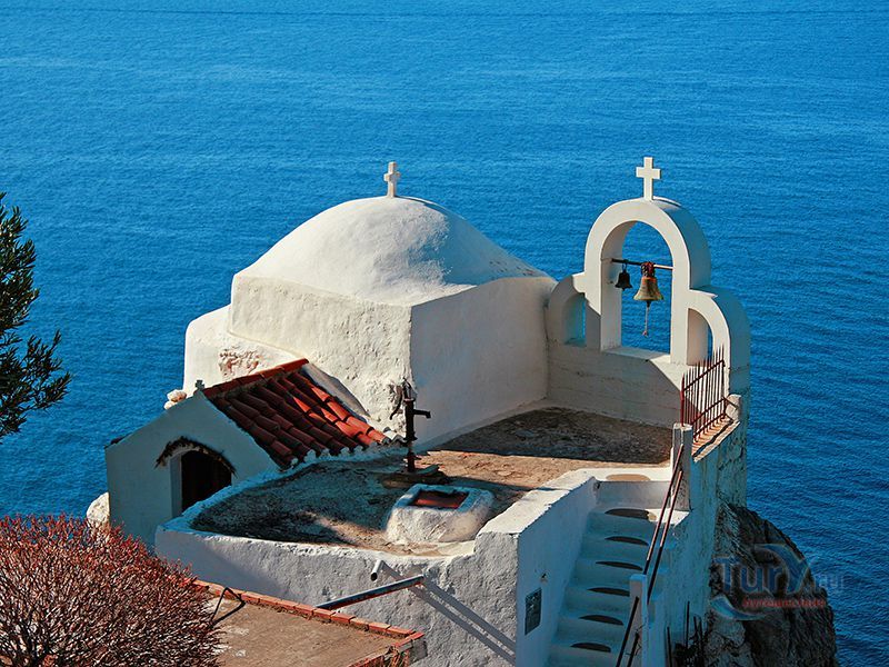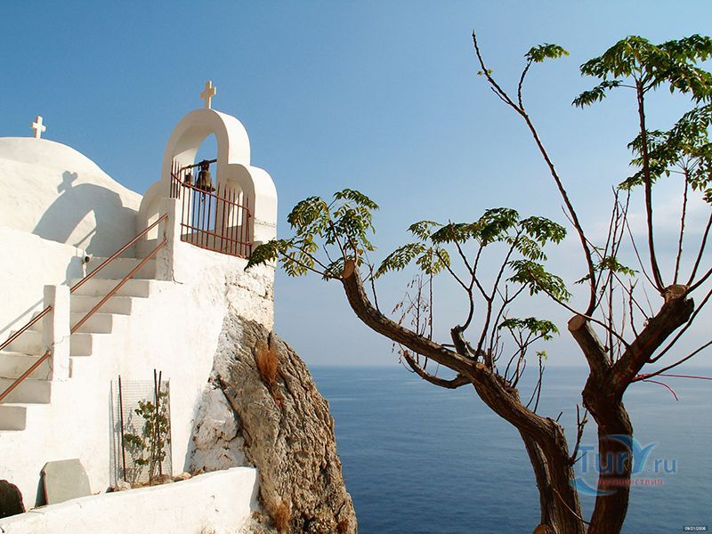 Маленькая белая церквушка Святой Ирины буквально висит на скале. Византийская церковь крестообразного стиля была построена на развалинах ещё более древнего монастыря, в котором имелся резервуар для сбора воды.