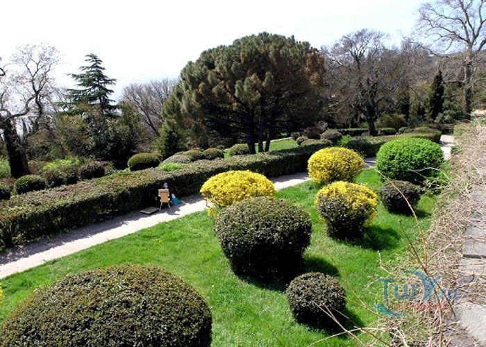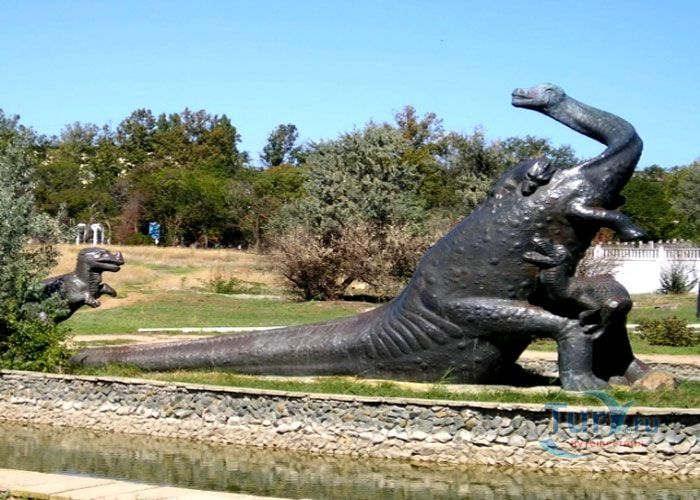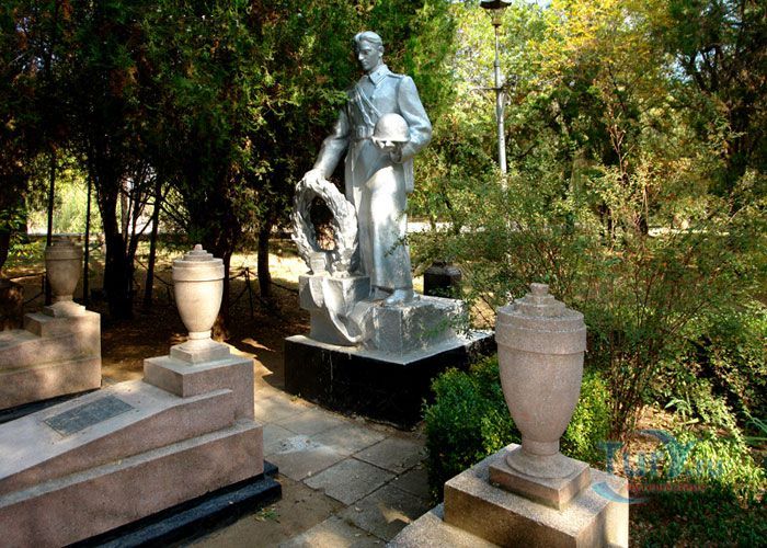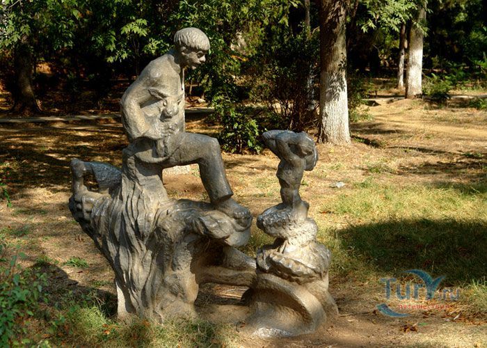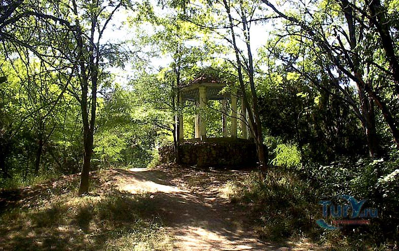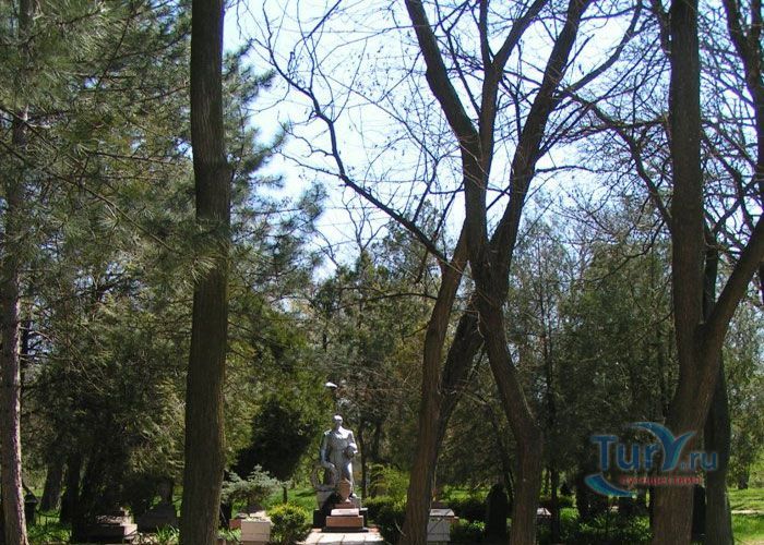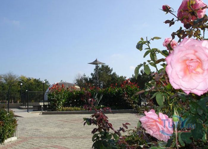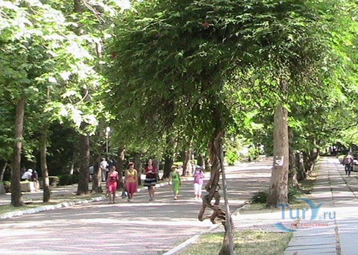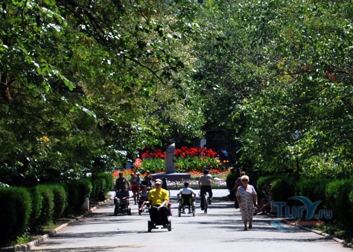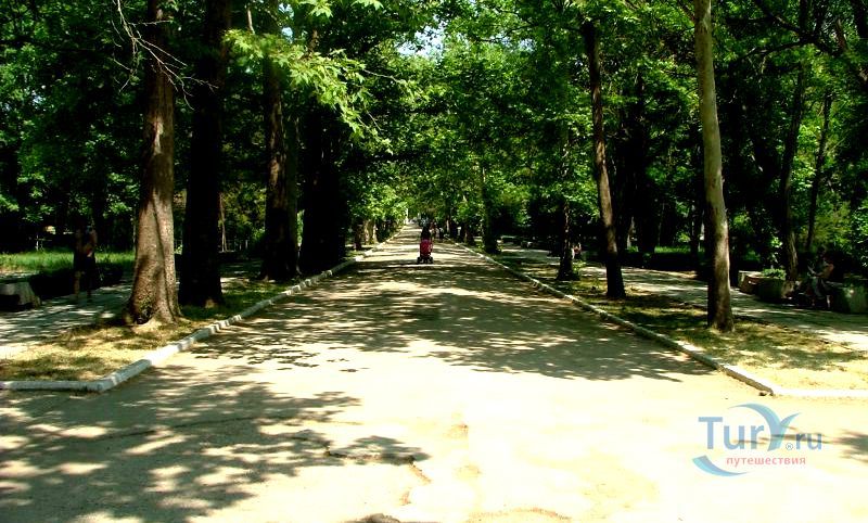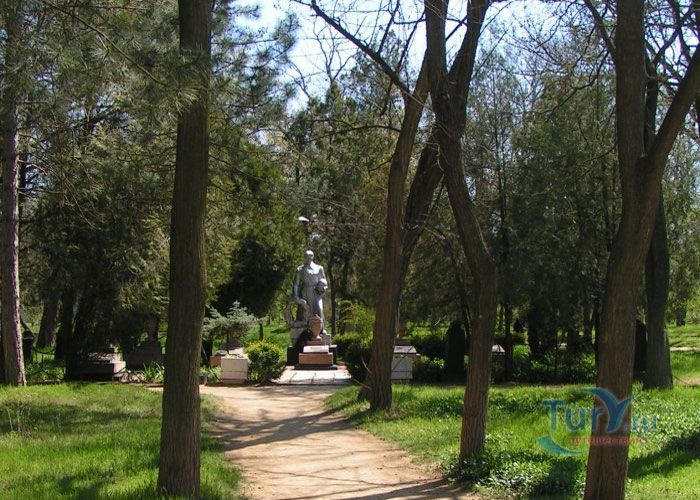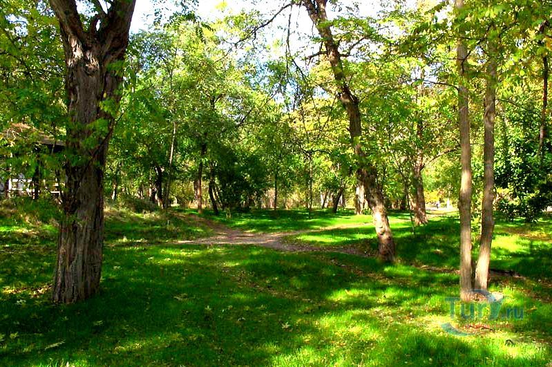 Парк по праву является гордостью города. Заложен парк более ста лет назад. Территория парка занимает сейчас почти 50 гектаров. В нем произрастает около 80 пород деревьев и кустарников. Редкое сочетание лесной, лесостепной, средиземноморской растительности создает живописный зеленый ансамбль. Тут красуются нарядные акации, серебристый лох, гледичия, тамариск, вяз, ясень. В парке прижились экзотические растения, привезенные из Средиземноморья и Китая, Японии и Северной Америки. Это дуб и береза, клен полевой и американский, японская софора, тис и пурпурный вяз, можжевельник и сосна. Вторую родину обрели теплолюбивые кипарисы, гималайский кедр, китайская глициния, сирийская роза. Деревья в парке растут как бы этажами. Воздух Сакского парка является еще одним лечебным фактором курорта. В парке чистый и свежий воздух, насыщен кислородом, и обогащен ионами солей лечебного озера. Прогулки по парку очень полезны для верхних дыхательных путей, красивые ландшафты благоприятно действуют на больных, укрепляют их нервную систему. В парке много художественно оформленных клумбы с цветами, уютные скамейки, трельяжи с вьющимися растениями. В центре парка сооружен памятник советским летчикам, погибшим в боях за освобождение Крыма. У подножия обелиска горит вечный огонь. На центральной аллее, в гуще столетних дубов установлен бюст Н. В. Гоголя, который лечился на сакском курорте в 1835 году.
