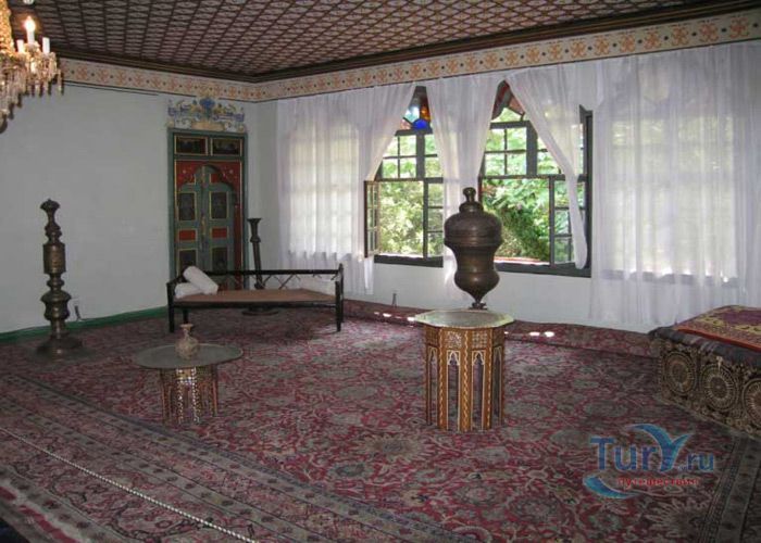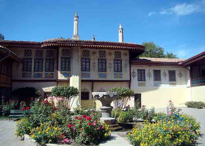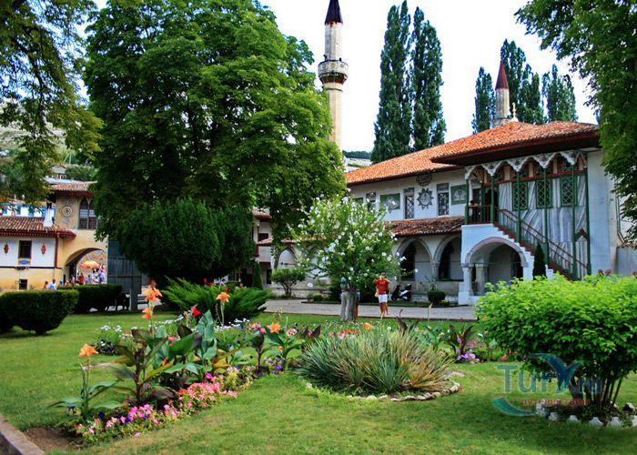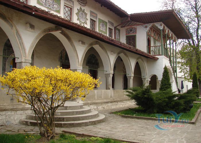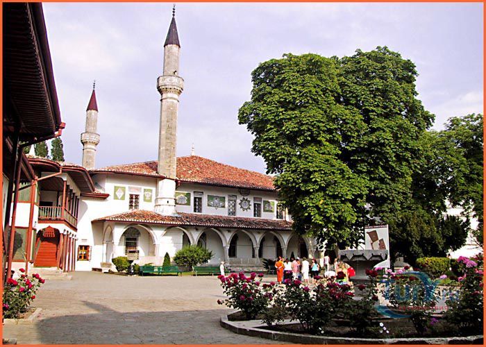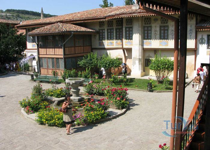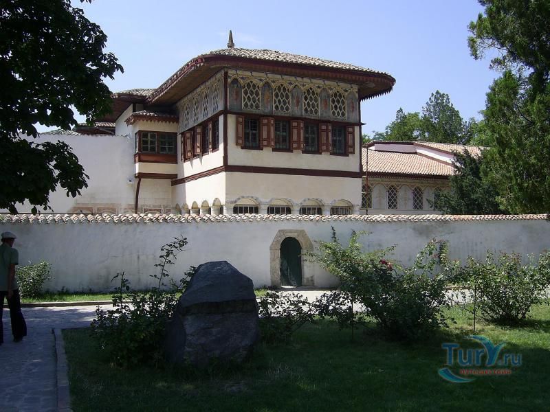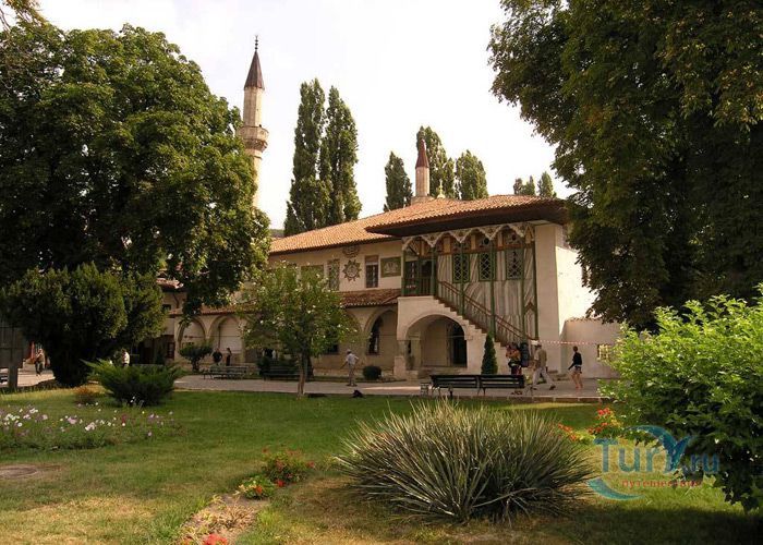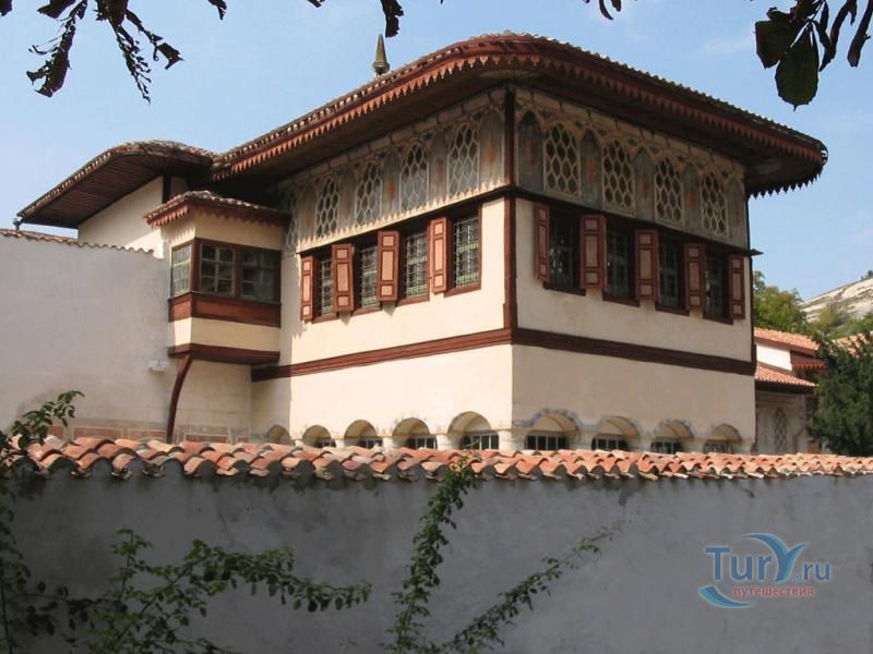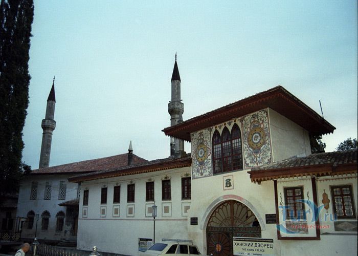 Ханский дворец (Хан-Сарай), уникальный памятник архитектуры XVI- XVIII веков, расположен в самом центре Бахчисарая. Здесь все восхищает: витражи и решетки на узких окнах, тонкие башни минаретов, тронутые печатью времени покои, затейливая вязь надписей, пышная зелень беседок. Архитектурный ансамбль Ханского дворца составляют несколько дворцовых корпусов: гарем, Соколиная башня, большая ханская мечеть, фамильное кладбище бывших властелинов Крыма - ханов Гиреев, мавзолей рано умершей любимой жены хана Крым-Гирея - Диляре, по легенде - полонянки Марии Потоцкой. По капле роняет хрустальную влагу "Фонтан слез", созданный в память о ней. В центре дворца находится Золотой фонтан, который использовался для омовений. На его мраморной облицовке рельефные надписи и изречение из Корана. Дворец в Бахчисарае был построен, как родовая резиденция династии Гераев - правителей Крымского ханства. На протяжении двух с половиной столетий с 1532 до 1783 года, он служил центром политической, духовной и культурной жизни государства крымских татар. Не меньшую значимость дворец имеет и сегодня. Дворец является не только памятником истории и культуры общемирового значения, но уникальным и единственным в своем роде образцом крымско-татарской дворцовой архитектуры.