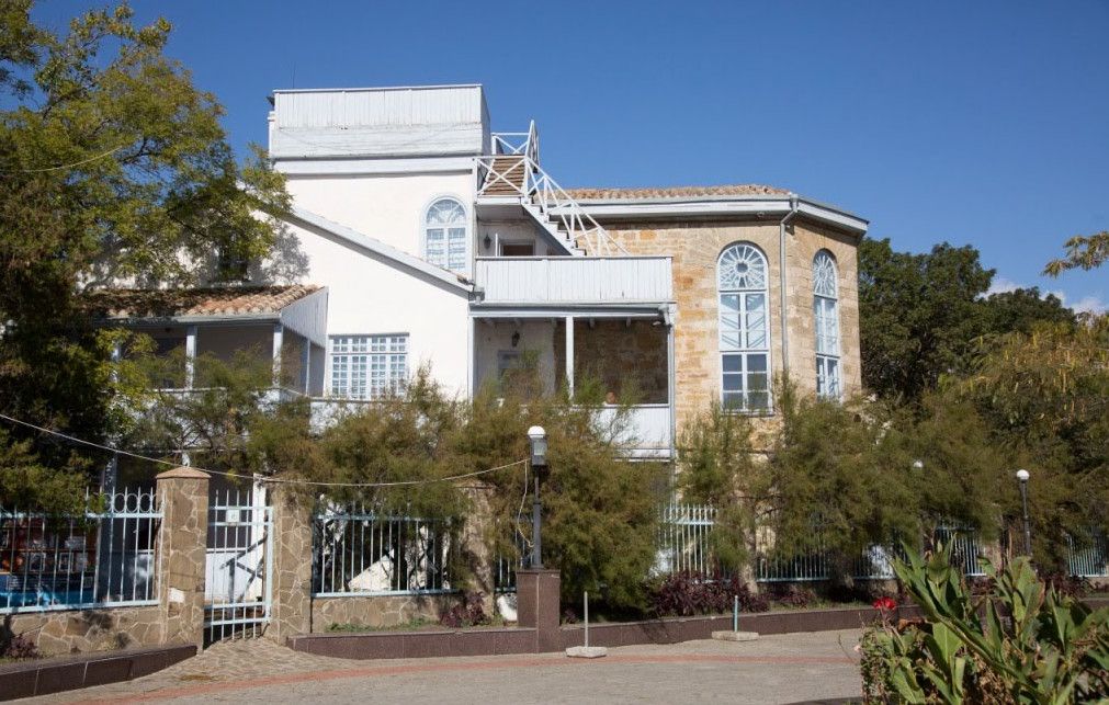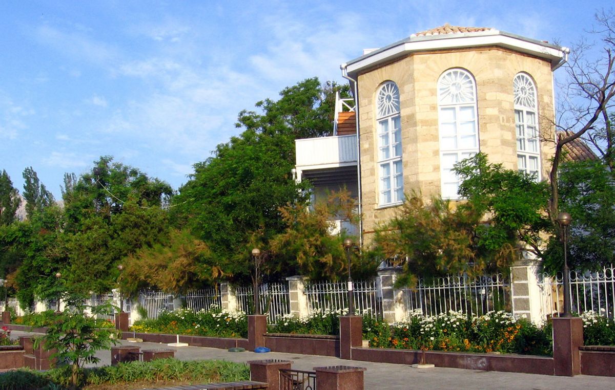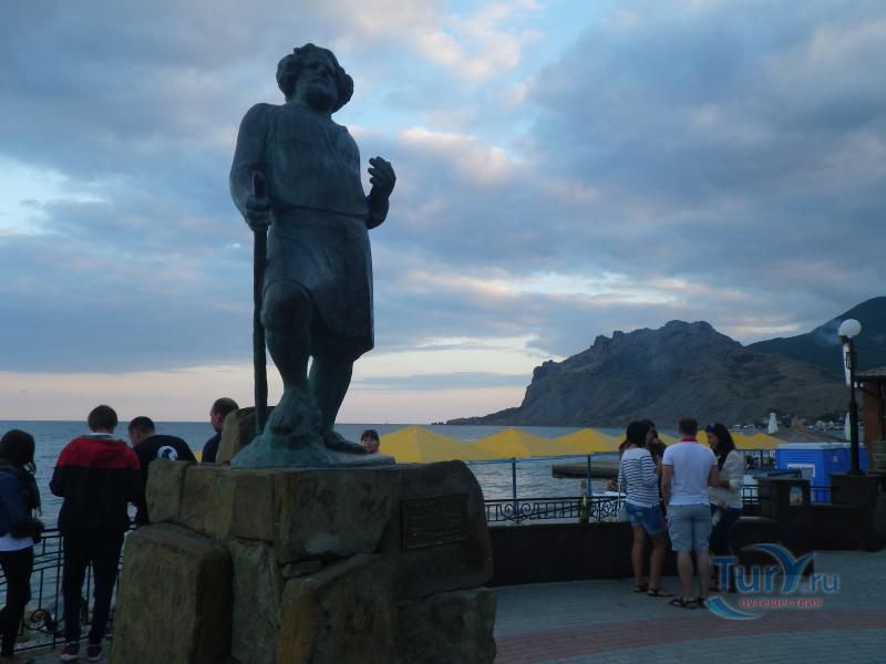 Неширокая каменистая полоска пляжа на берегу Коктебельского залива и променад набережной отделяют волны Чёрного моря от Дома-музея М. Волошина у подножия вулканического массива Карадаг. Максимилиан Александрович Волошин (1877 г — 1932 г) — поэт, переводчик, художник-пейзажист, художественный и литературный критик.