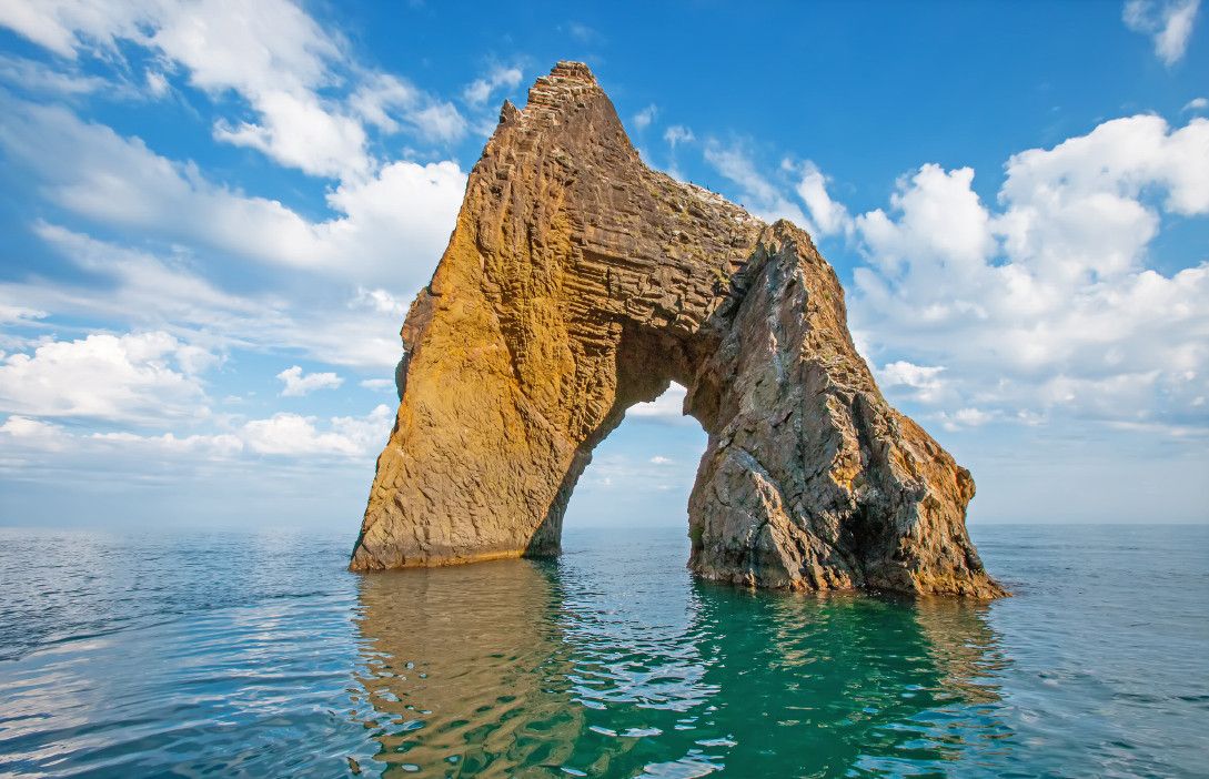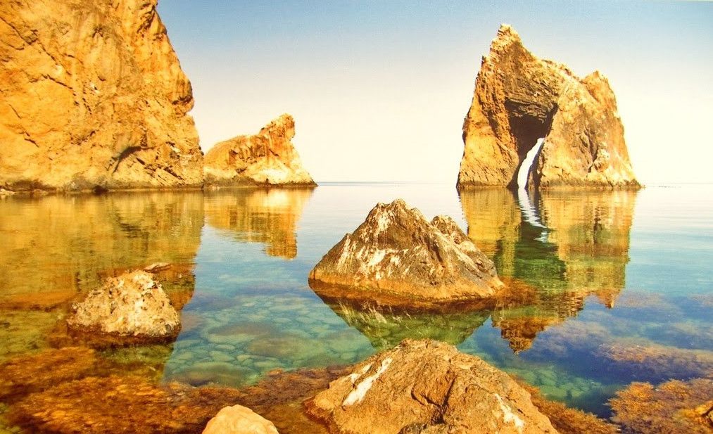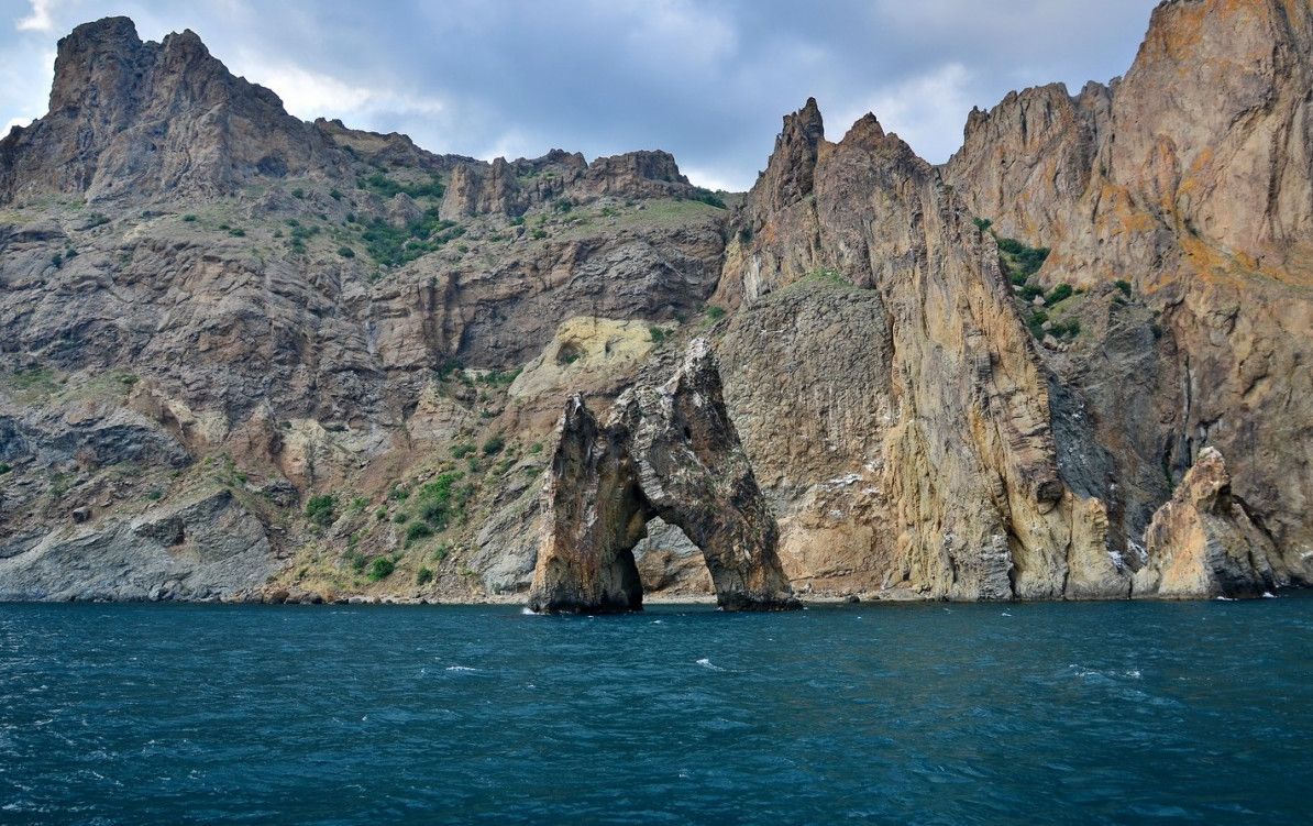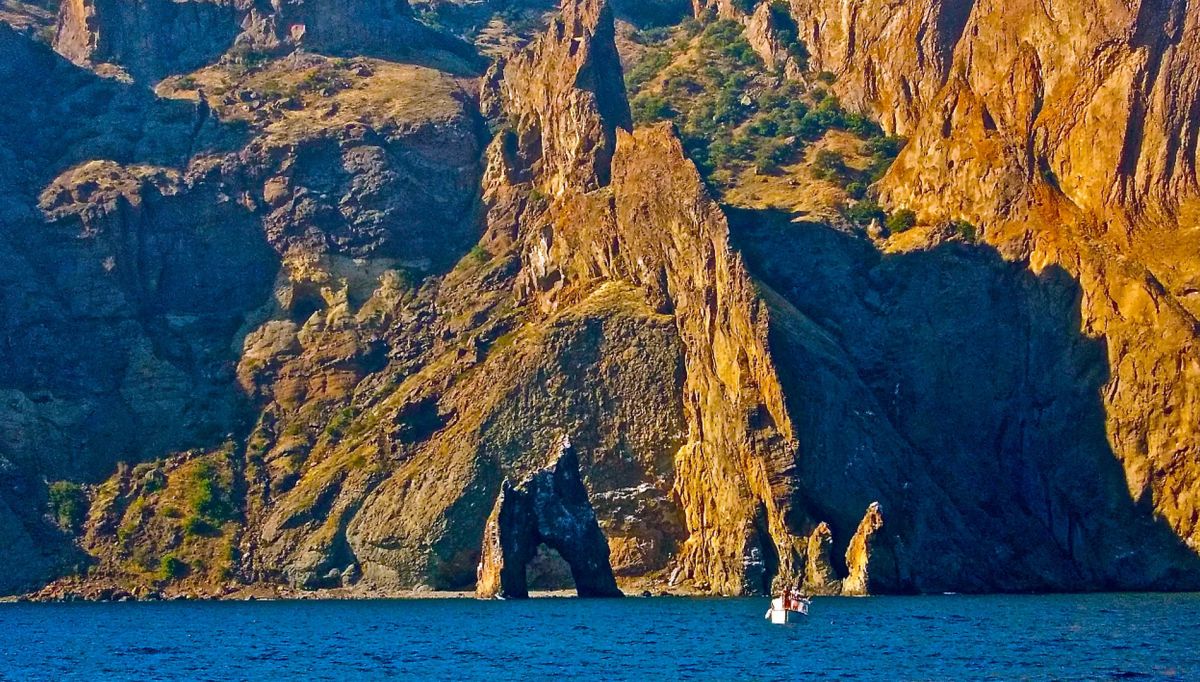 Шайтан-Капу (Чертовы, или Золотые ворота), Чёртов Палец, Иван-разбойник, Лев — это причудливые прибрежные скальные образования горно-вулканического массива Кара-Даг - «чёрная гора» на берегу Чёрного моря. Максимальная высота бывшего вулкана — 577 м (гора Святая). Береговой хребет состоит из хребтов Карагач, Хоба-Тепе, Магнитный, Кок-Кая. В глубине суши расположен куполовидный массив Святой горы и Малый Карадаг. В 1979 году был создан Карадагский государственный заповедник (площадь 2874,2 га), включающий территорию горного массива и прилегающую морскую акваторию (809 га). Золотые Ворота представляют собой скалистую арку в Пограничной бухте окружённую морем в форме каменной арки в 80 метрах от берега. На крымско-татарском её называли Шейтан-Капу (şeytan qapu) - Чёртовы ворота, считали, что здесь располагается вход в преисподнюю. Для путешественников они, как ворота, ведущие с моря в мир фантастических скал - "Ворота Карадага". Высота Золотых ворот 37 м, ширина арки 9 м, высота до перекрытия арки 12 м, глубина моря у скалы от 10 до 15 м. Изрезанная дождями и ветрами скала покрыта оранжевым лишайником и на закате отражая лучи солнца, окрашивается в золотисто-оранжевый цвет. А в фантазиях восторженных зрителей представляется, что скала сделана из золота. Карадагом и его вратами лучше любоваться на расстоянии и в вечернее время, чтобы охватить взглядом всю панораму гор, - советуют ученые. Или с популярной горной туристической тропы Кара-Дага. Именно учёные стали на защиту уникального горно-морского природного заповедника, частью которого является скала. Людские предания и традиции привели к наплыву отдыхающих с низким уровнем экокультуры: морское дно под скалой сплошь усеяно ржавеющими монетами, самоутверждающиеся крики «туристов» распугали хохлатых бакланах, занесенных в Красную книгу Украины, других пернатых обитателей скал, загрязнение моря топливными отходами и шум моторов катеров доказанно наносит вред рыбам и земноводным животным, обитающим и размножающимся в заповедной зоне бухты. Вызывает повышенную угрозу возгорание леса в Кара-Даге от моды на запуск горящих китайских «фонариков». В 2013г ученым советом заповедника принято решение об обязательном изменении маршрута экскурсионных катеров и утверждено Минприроды Украины: к береговой зоне с моря нельзя подходить ближе, чем на 300 метров. Посещать Кара-Даг разрешено только в сопровождении экскурсии, по экологической тропе.