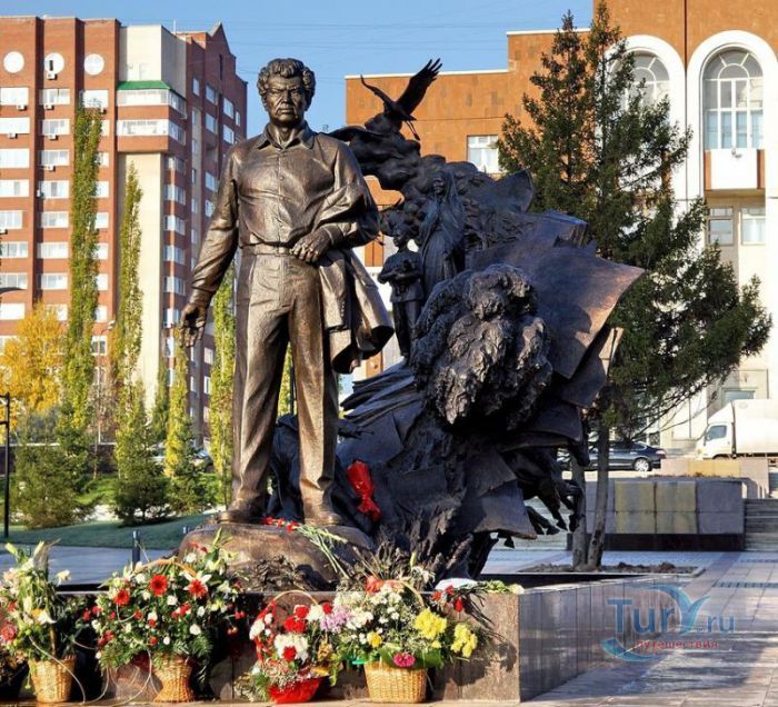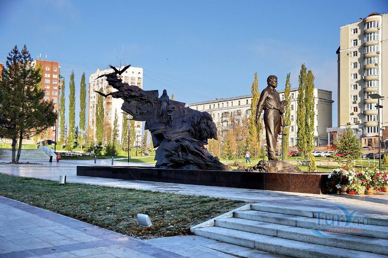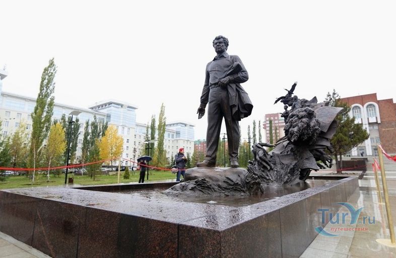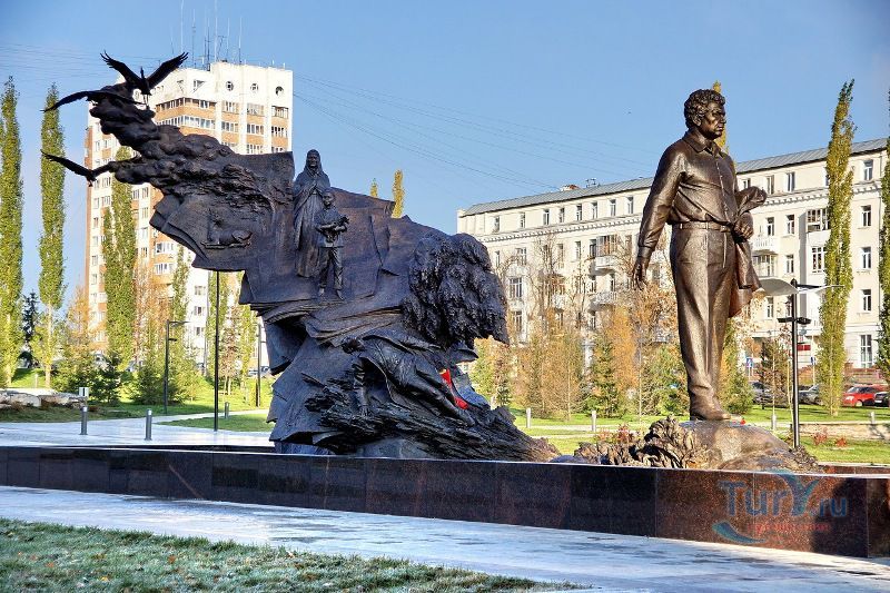 Памятник посвящен народному поэту Башкортостана, корифею советской литературы, писателю-фронтовику Мустаю Кариму. Этот человек был очень большим деятелем, он был Героем Социалистического труда, поэтом Башкирской АССР, членом ВКП(б), лауреатом Ленинской и Государственной премий СССР. Внушительная скульптурная композиция воздвигнута недалеко от дома, где семья писателя прожила 40 лет, совсем недалеко несколько десятилетий назад здесь стоял частный дом, где снимал угол студент Мустафа Каримов, приехавший учиться в Уфу из деревни Кляшево Чишминского района. Именно там он познакомился со своей будущей супругой Раузой.