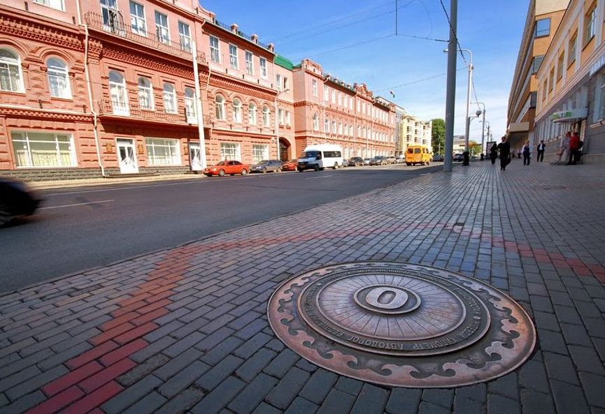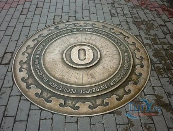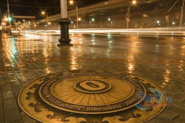 Знак "Нулевой километр" - символическая геодезическая отметка в Уфе. Этот знак служит начальной точкой отсчета протяженности дорог между Уфой и городами Российской Федерации и мира. Традиция вести отсчет всех расстояний от главного городского почтамта возникла в России еще в конце XVIII века. Сегодня "нулевые километры" можно увидеть в европейских столицах и городах, и за пределами Европы. В силу исторических причин, нулевой километр часто попадает на главный почтамт города. В Уфе подобный знак был вмонтирован в тротуар 14 сентября 2007 года около Главпочтамта на улице Ленина. Бронзовый знак выполнен в виде диска диаметром 1,5 метра и весит 700 килограмм. Его отлили в цехе точного литья Уфимского моторостроительного производственного объединения. На диске изображены элементы национальной символики Республики Башкортостан, надпись "Нулевой километр автодорог республики Башкортостан" и цифра "0" по центру. На фасаде здания Главпочтамта установлена памятная табличка, на которой указаны расстояния до Москвы, Калининграда, Владивостока, Мурманска и Сочи. Здесь же говорится, что данный знак заложен в честь 450-летия добровольного вхождения Башкирии в состав России.
