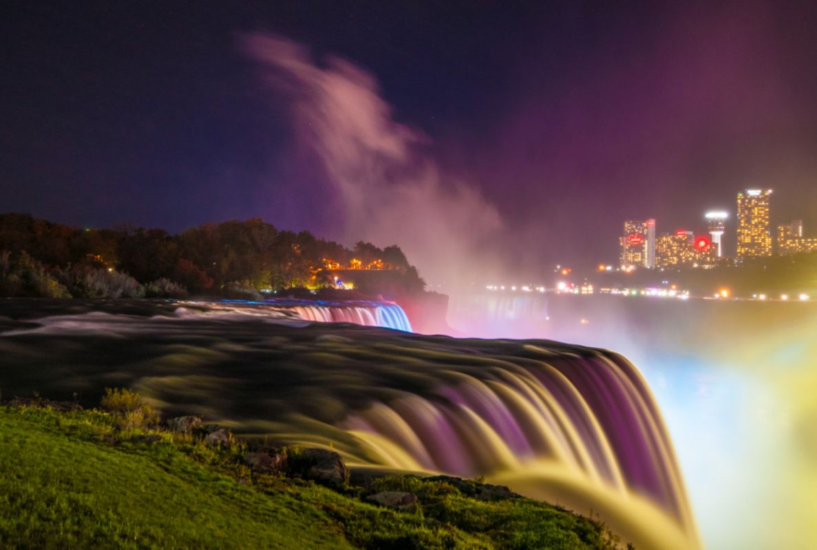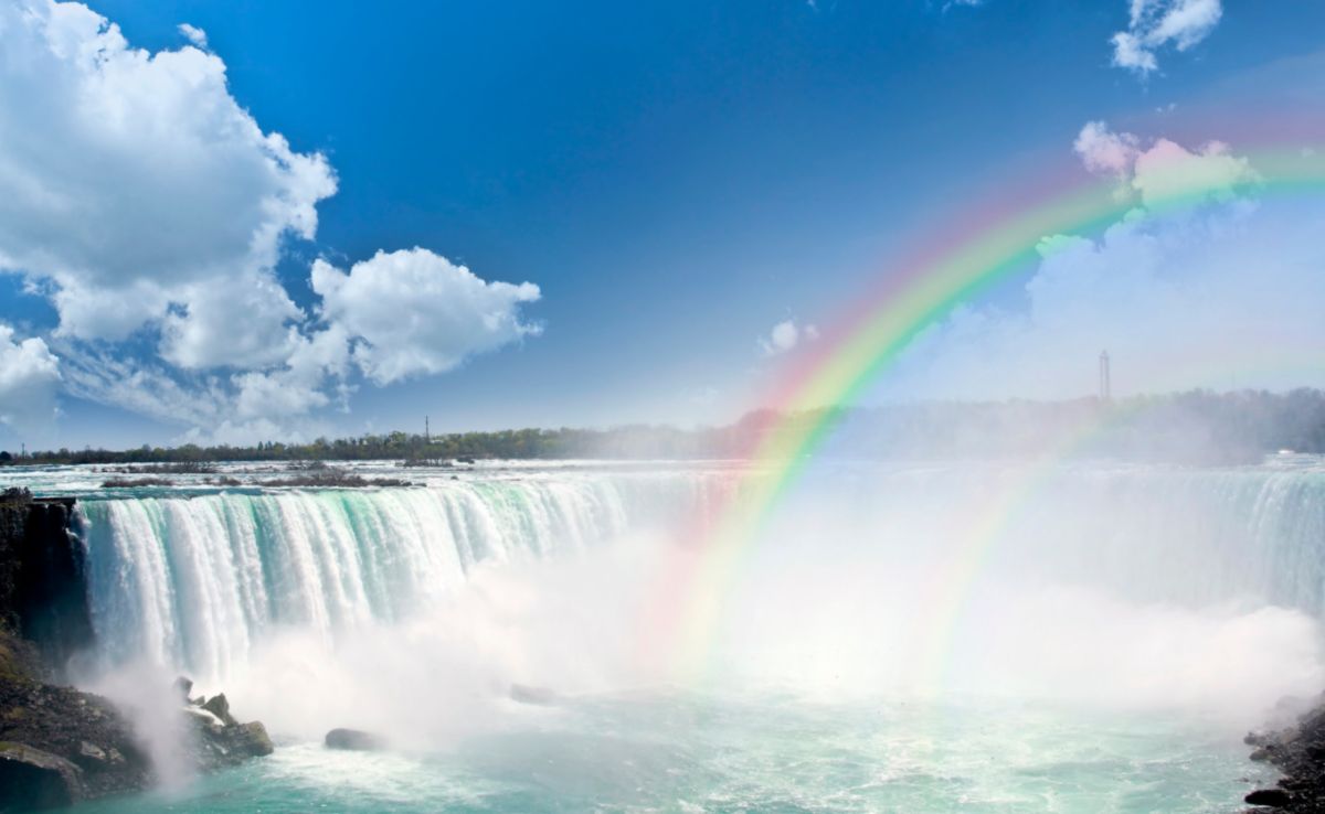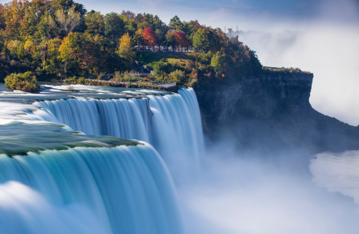 Среднегодовой расход водопада - 6010 куб. м, или 360600 т в минуту, - он один из пяти самых мощных на Земле. Большая часть воды расходуется через канадский рукав, именуемый Хорсшу или Подковой. Последнее название точно отражает вогнутую форму канадской части водопада, хотя встречается и другое название-Громовержец. Воды могучей реки плавно подходят к порогу и с величественным спокойствием падают в бездну с высоты 20-этажного дома. В большую воду толщина водного потока на гребне составляет несколько метров. Верх водяной стены даже кажется неподвижным. Нижняя же часть - апофеоз клокочущей воды. Она кипит и беснуется, образуя гигантские водовороты. Над пучиной поднимается завеса водяной пыли. В ясную погоду лучи солнца, преломляясь в мельчайших каплях воды, образуют семицветные радуги. Их бывает несколько, часто одна внутри другой. Как и у других гигантских водопадов, бесподобна, химерична радуга ночью, в свете луны. Игра стихии настолько впечатляет, что огромные толпы туристов часами наблюдают ее, не шевелясь. Американцы умело преподносят чудо природы. У Ниагары установлены десятки прожекторов общей мощностью 1,5 млн. кВт. Прожектора разноцветные. Как только стемнеет, их лучи направляются на непрерывно движущуюся стену водопада и, создавая сказочную иллюминацию, усиливают и без того внушительную картину. Грохот водопада слышен на расстоянии многих километров, особенно ночью, поэтому человек, стоящий у самое Ниагары, ничего не слышит (по-индейски Ниагара -"грохочущая вода"). Выше и ниже водопада по течению реки для удобства туристов построены мосты для любования грандиозным зрелищем. Водопад могуч. Туристы, очарованные колдовством феномена, не отводят от водопада глаз. И почти каждый мыслящий наблюдатель думает: десятки тысяч лет низвергался в этом месте бушующий ураган воды, он неистовствует при мне, он не прекратится никогда. Наблюдателя пронизывает, наполняет все его существо острое чувство Вечности Жизни. Ниагара, как и любой другой водопад, выглядит по-разному в зависимости не только от времени суток, но и от времени года. Весной и летом кипящий белый занавес оттеняется сочной зеленью, осенью - багряными красками. Зимой замерзают только края реки. Со скал-выступов гребня - постепенно намерзают огромные, с фабричную трубу, ледяные наплывы - гигантские "сосульки", искрящиеся бриллиантами на фоне беснующейся воды. "Трубы" - это не метафора. "Сосульки" многих больших и малых замерзшие точнее, замерзающих водопадов представляют собой действительно полые внутри, конусообразные или расширяющиеся книзу ледяные образования, сквозь прозрачные стенки которых можно наблюдать как падает, пульсирует и бьется, сопротивляясь замерзанию, вода. По обоим берегам выстроены штольни, их подъемники опускают туристов, предварительно одетых в прорезиненные плащи, вниз, к самой подошве водопада. Стоя на специальных бетонных площадках, находясь в каких-нибудь 1,5 м от гигантской стены рушащейся стихии, наблюдатели испытывают благоговейный ужас перед мощными, необузданными силами природы...