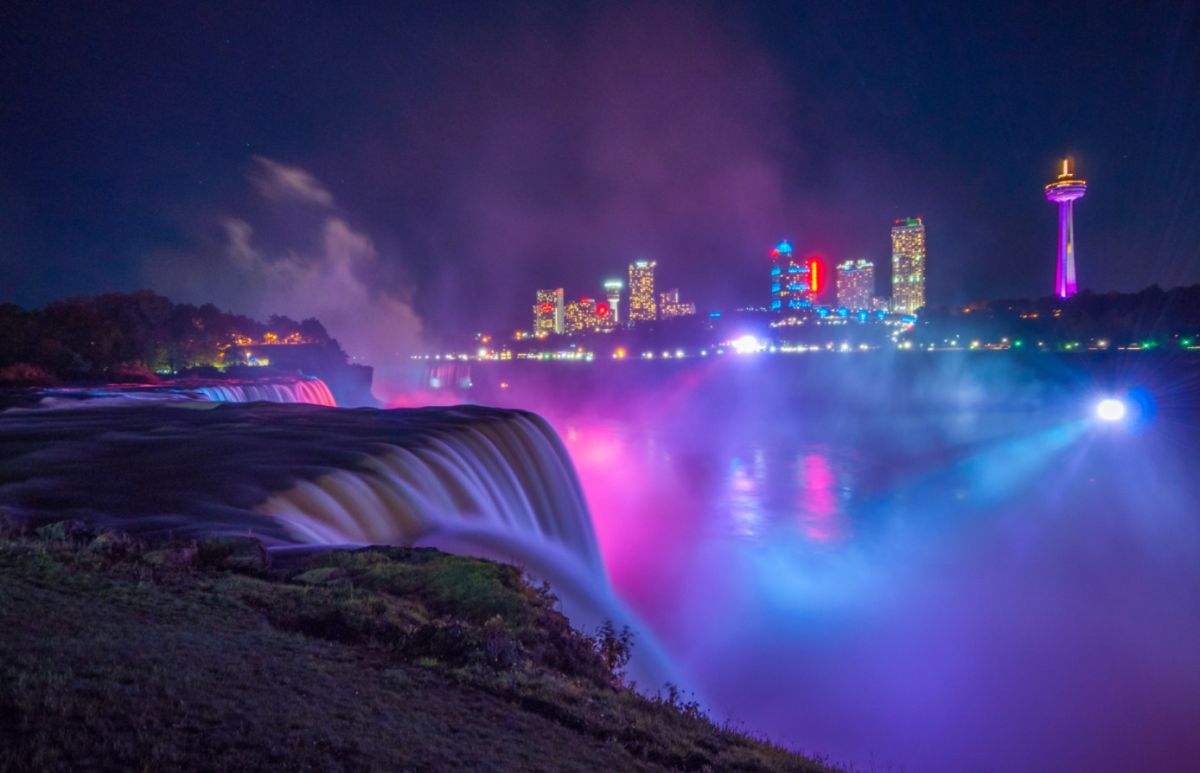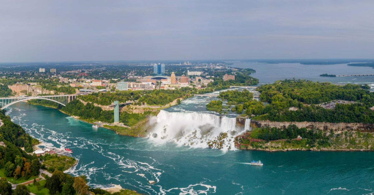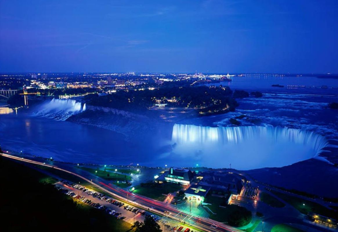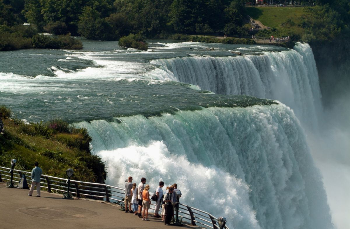 На границе США и Канады расположено пять крупнейших пресных озер земного шара: Верхнее, Мичиган, Гурон, Эри и Онтарио. Площадь зеркала четырех озер - 225 тыс. кв. км (3/5 Каспийского моря). Единственный сток вод четырех первых из них - р. Ниагара, вытекающая из оз. Эри и впадающая в оз. Онтарио. Река несет их воды сначала по отлогому руслу, но недалеко от оз. Онтарио обрывается 50-метровым уступом в сланцевых породах, прикрытых известняками. Водопад у самого уступа делится островом Гот (Козьим островом - когда-то там водились дикие козы) на два потока: левый - канадский - шириной 914 м и правый - американский - шириной 305м. Рядом с Козьим островом расположен крошечный островок Лунный. Струя шириной 20 м, ниспадающая между ними, называется Центральным или Лунным каскадом.