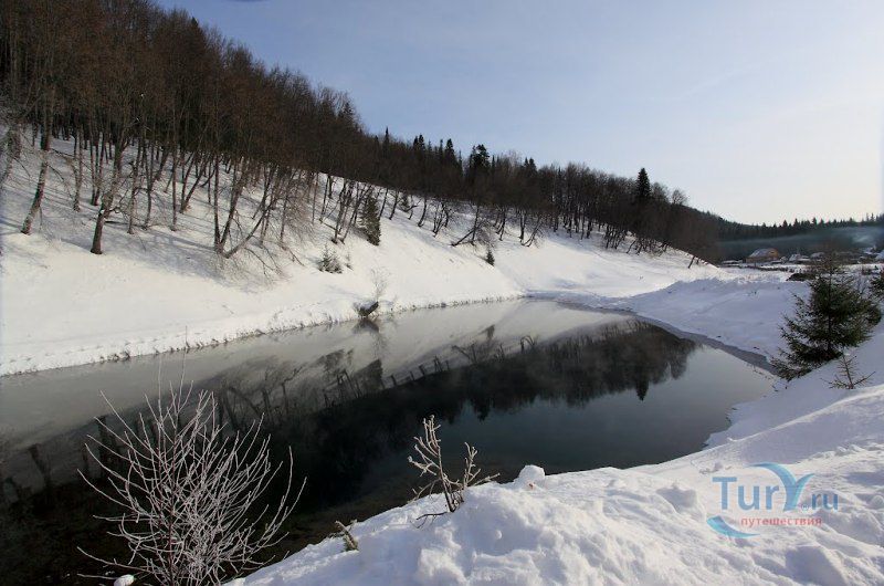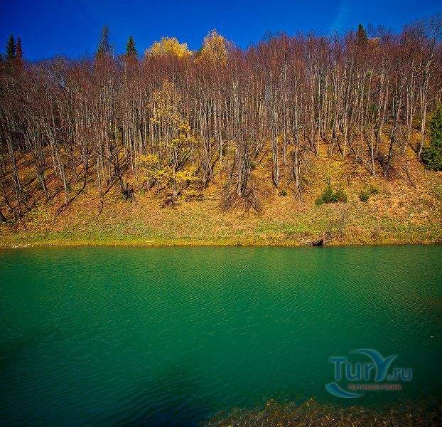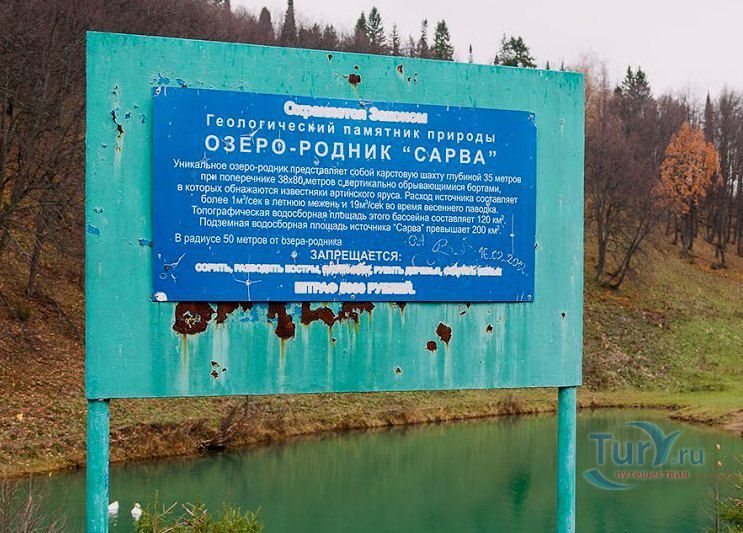 Озеро Сарва находится на восточной окраине одноименной деревни. Озеро Сарва является геологическим памятником природы и находится под охраной. Оно необычайно красиво, обычно его вода имеет красивейший голубоватый оттенок, но цвет меняется в зависимости от погоды. Сарва имеет карстовое происхождение. Оно небольшое по площади - около 60 метров в длину и около 30 метров в ширину. Зато глубина доходит до 38 метров. Дно уходит отвесно вниз практически возле самого берега. Стоя у левого края озера, можно увидеть около полуметра дна, а дальше - бездонная пропасть. Правый берег представлен крутым горным склоном, обросшим липово-пихтовым лесом с небольшой земляничной полянкой. Купаться в озере почти невозможно, вода здесь ледяная, поэтому его еще называют озеро-родник. Здесь водятся окуни, караси и щуки. Воды этого озера дают начало одноименной реке, которая через 17 километров впадает в другую реку Салдыбаш - приток Уфы.