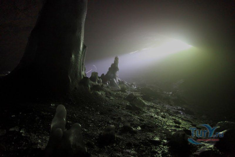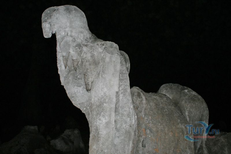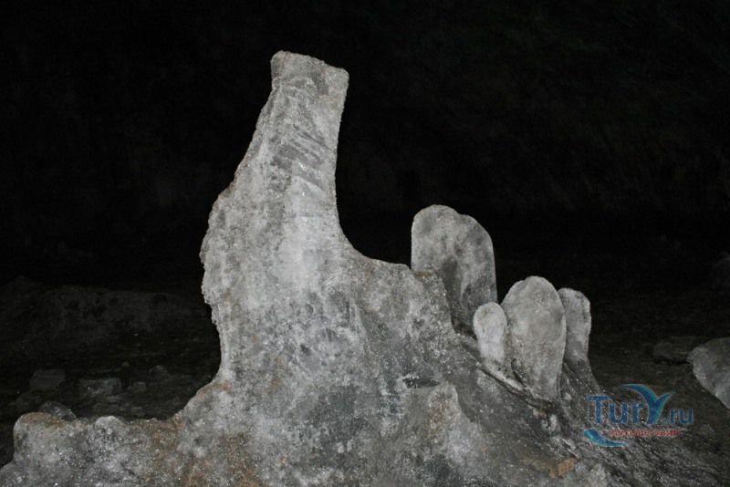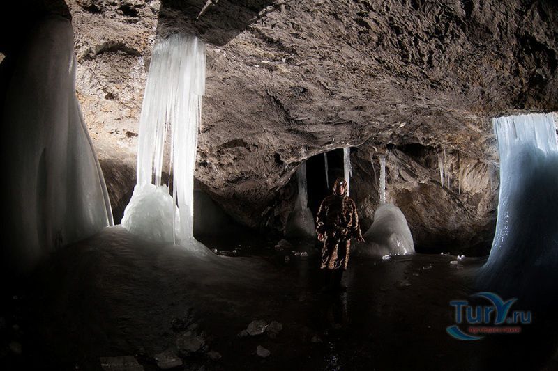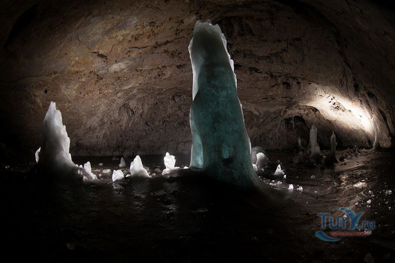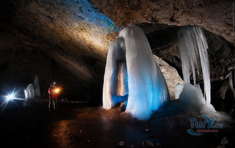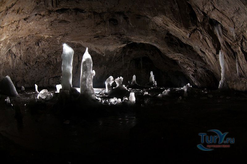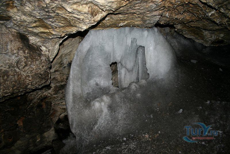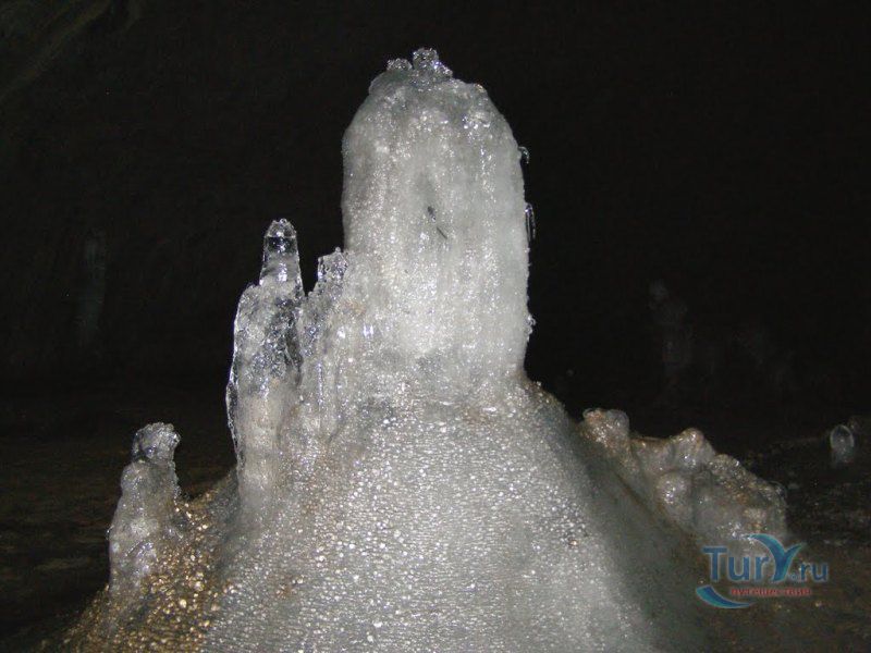 Аскинская ледяная пещера - это крупнейшая полость Южного Урала мешкообразного типа с наибольшим по площади ледником и самыми крупными ледяными сталагмитами. Пещера представляет собой большой зал длиной 104 метра, максимальной шириной 61 метр, высота пещеры достигает 26 метров. Пещера имеет аркообразный вход, обращенный на северо-восток. Спускаться в пещеру приходится по крутому склону высотой около 15 метров. Не стоит беспокоиться, спуск к входу в пещеру оборудован лестницей с перилами, просто нужно быть предельно аккуратным, поскольку лестница тоже покрывается льдом. В огромном зале со сводчатыми стенами и потолком почти весь пол покрыт ледником. В разные годы здесь насчитывалось от 7 до 10 гигантских ледяных сталагмитов высотой от 8 до 11 метров, диаметр в основании которых достигал 5 метров. Потолок ледяной пещеры покрыт коркой натечного известняка, местами он обледенел. С потолка и стен свисают сталактиты самой различной формы и величины. В юго-восточной и юго-западной стенах зала имеются два слепых хода. Пещера обладает уникальной акустикой - многоголосое, долго не умолкающее эхо, многократно повторяет каждый звук.