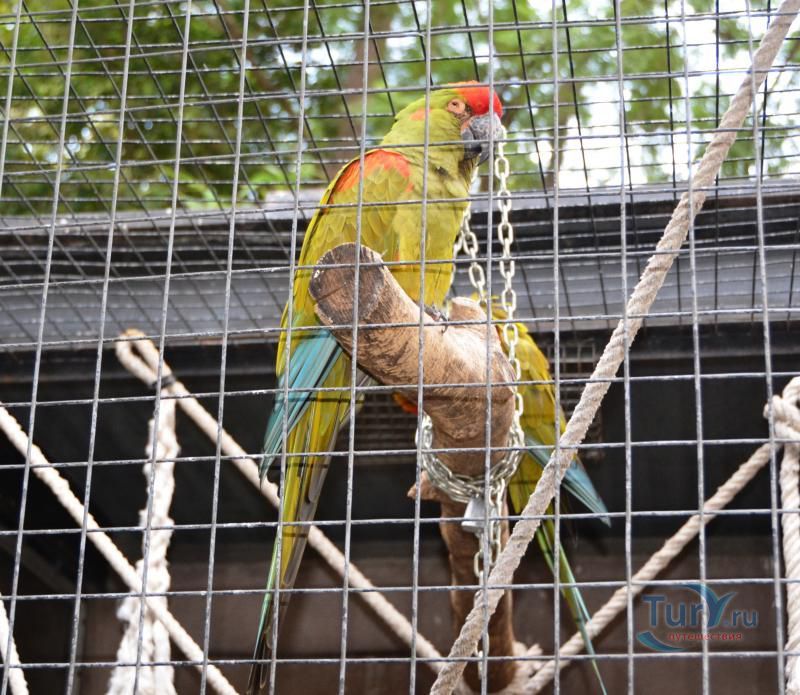 В самом тупике зоопарка, живут крупные попугаи, в основном латиноамериканского происхождения. Передняя часть и верх их места обитания затянуты сеткой. Но ее дырки, видимо, настолько большие, что через них в вольеру постоянно залазят воробьи и таскают у попугаев их корм.