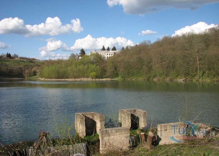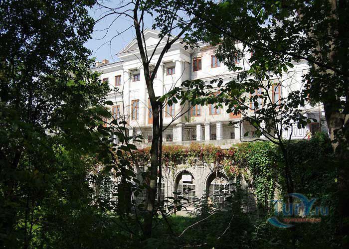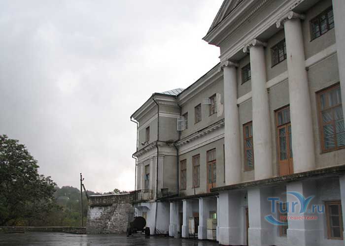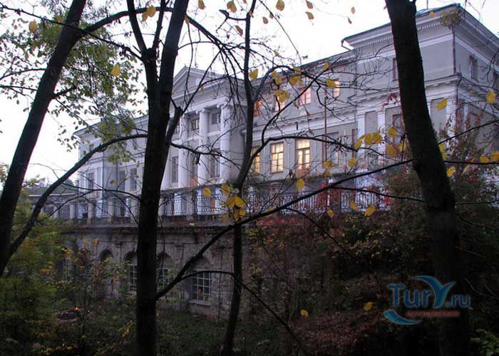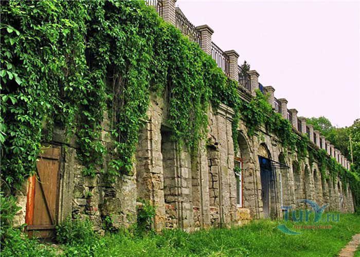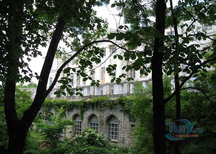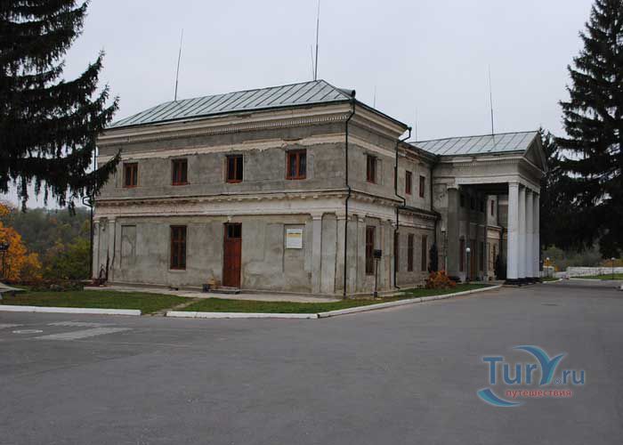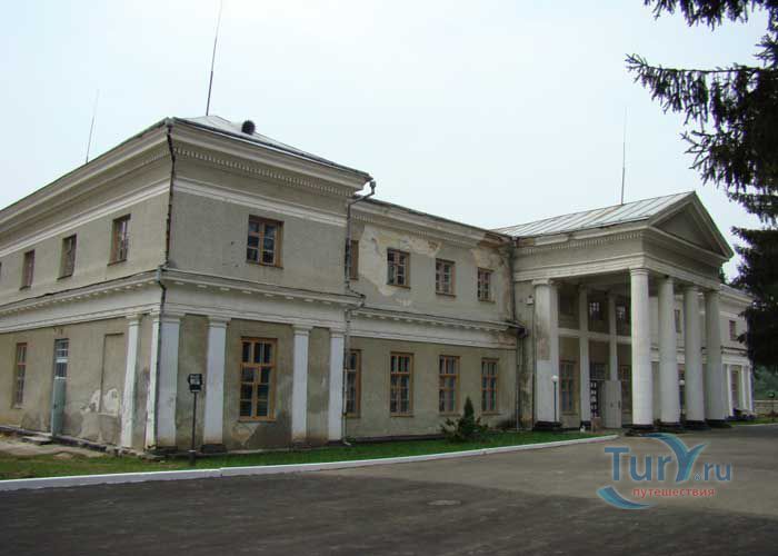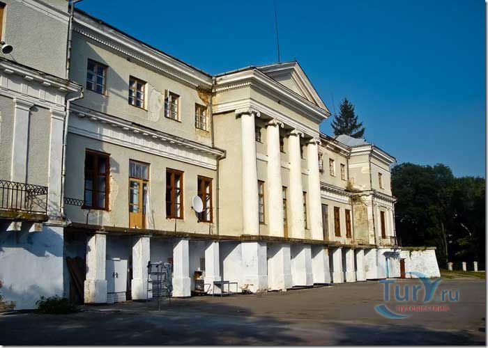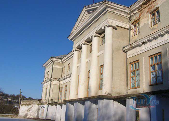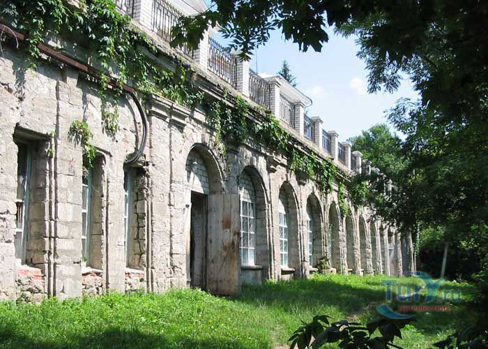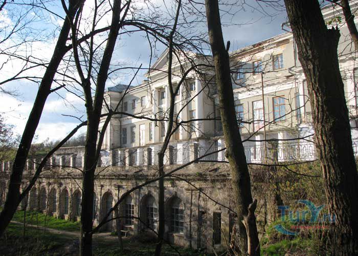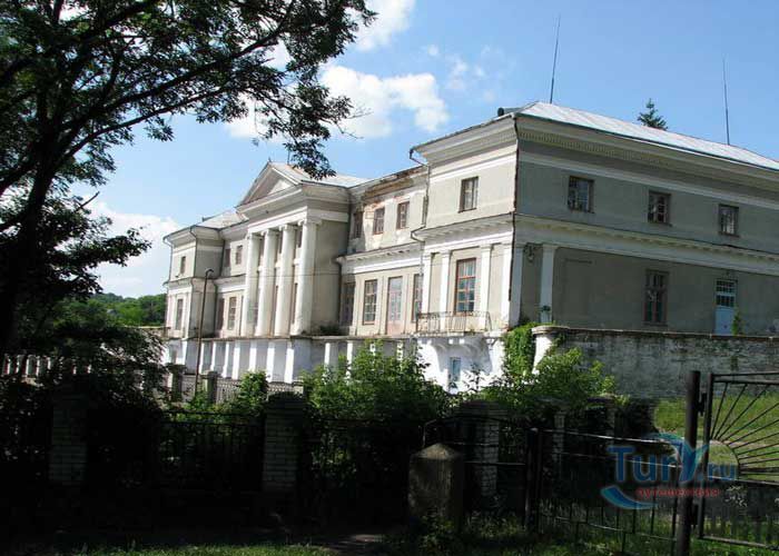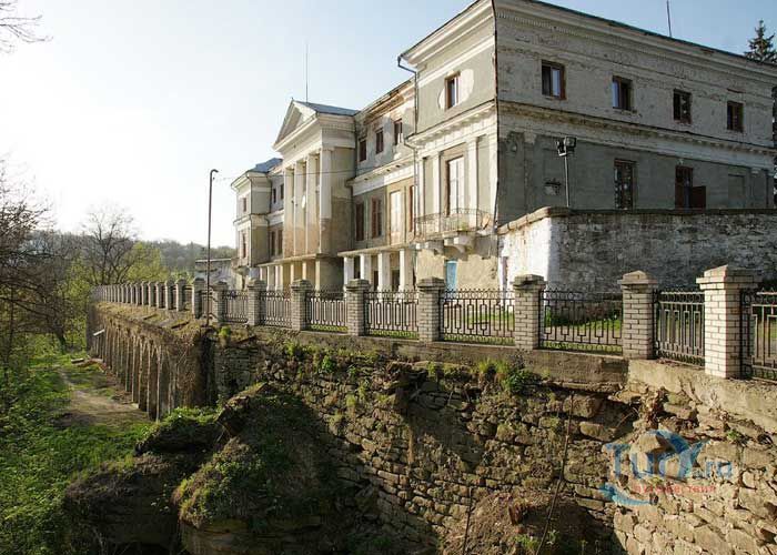 Благодаря резкому перепаду высот с парадной стороны он имел два этажа, со стороны парка - три. Строители не использовали раствор, а для лучшей стыковки камней укладывали их выступлением верхнего в углубление нижнего. Дворец окружает огромный пейзажный парк, который был заложен паркостроителем Дионисием Миклером еще в XVIII веке и располагается на обоих берегах реки Жван. Автор умело использовал ландшафт вокруг дворца с большими природными скалами, в которых проложил аллеи и создал каменные скамьи. Из парковой архитектуры до наших дней дошел каменный мост, созданный в 1805 году одновременно с дворцом. Мост до сих пор эксплуатируется. Частично сохранился пейзажный парк, конюшня, флигель, каменный мост. Сейчас в усадьбе размещена санаторная школа-интернат для детей с заболеваниями сердечно-сосудистой системы.