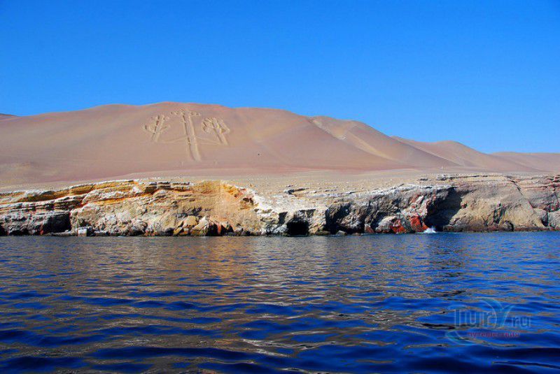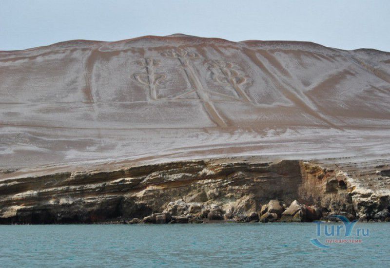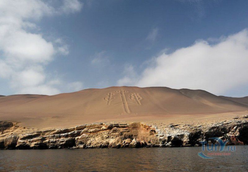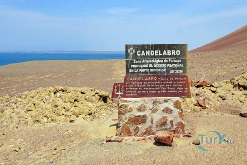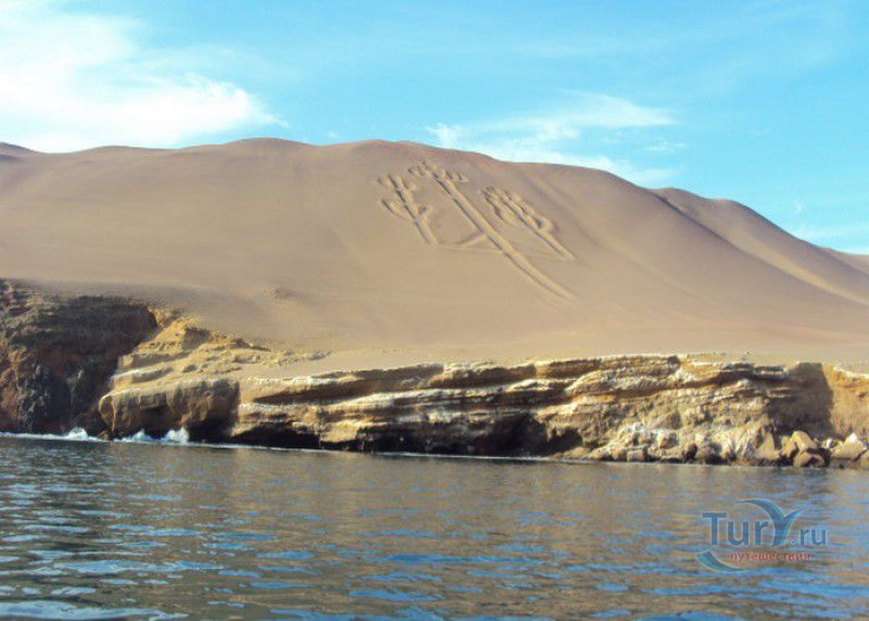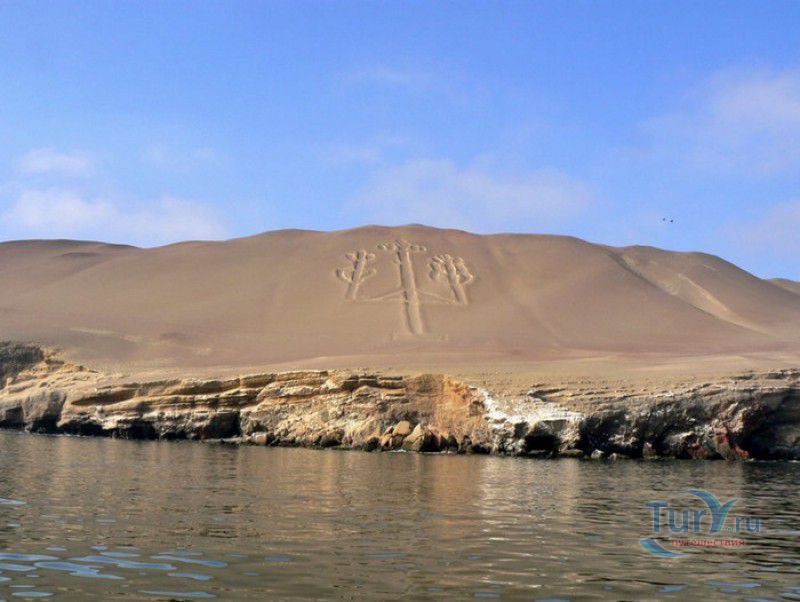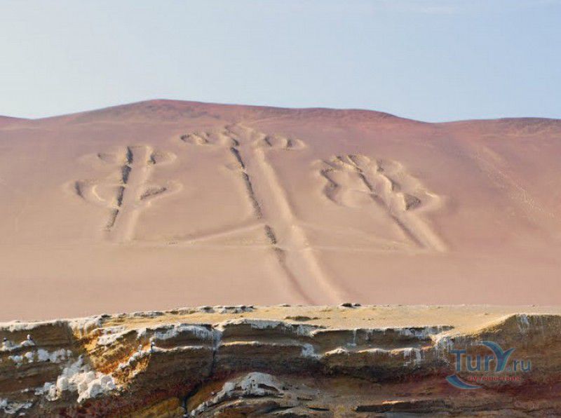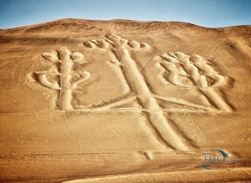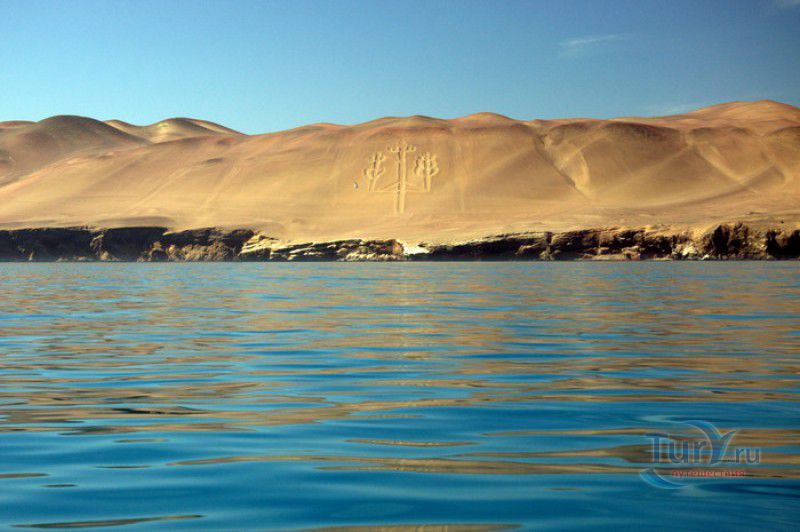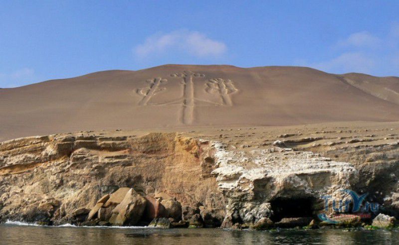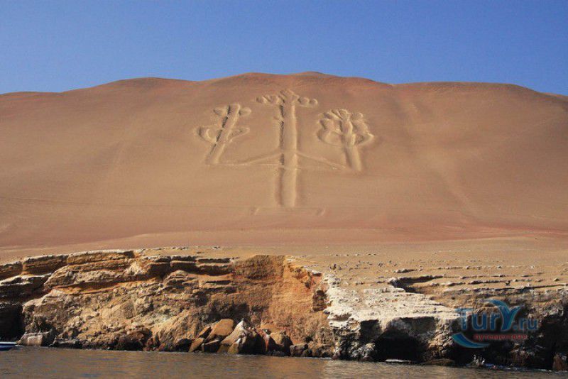 Геоглиф Андский Канделябр (Канделябр Паракаса) расположен в Перу, на северном побережье полуострова Паракас, на территории Национального заповедника Паракас. Андский канделябр вырезан на обращённом к морю склоне скалы, покрытом толстым слоем песка. Из-за постоянных ветров песок никогда не засыпает геоглиф полностью - очертания Канделябра Паракаса, похожего на огромный подсвечник с тремя свечами, всегда отлично видны как с высоты птичьего полёта, так и со стороны моря. Высота гигантского трезубца около 180 метров, ширина - 60 метров, толщина его линий составляет 3,2 метра, а глубина - от 1 до 1,2 метров. Предположительный возраст геоглифа - 2500 лет. О происхождении и предназначении Андского канделябра существует множество легенд и научных гипотез, которые пока никак не подтверждены. Некоторые учёные предполагают, что Канделябр указывает на линии Наска (группа гигантских геометрических и фигурных геоглифов на плато Наска в южной части Перу), но до них от Канделябра Паракаса более 200 километров. Другие исследователи склоняются к версии о религиозном предназначении геоглифа, а местные жители считают его элементом культа божества Виракоч - древнего бога-творца. Существует также предположение, что геоглиф служил маяком для мореплавателей - расположение и гигантские размеры Канделябра позволяют увидеть его в ясную погоду на расстоянии 20 км. Естественно, не обошлось без инопланетян, масонов, зарытых несметных сокровищ и ритуалов жертвоприношений. Достоверным является факт, что Андский Канделябр - творение древних цивилизаций. Считается, что геоглиф был создан представителями Паракасской археологической культуры, потомком которой является культура Наска. Не вызывает сомнений и то, что геоглиф "пережил" несколько тысячелетий - ни время, ни сильные морские ветра, ни песчаные бури и штормы не смогли стереть Андский канделябр с поверхности Земли.