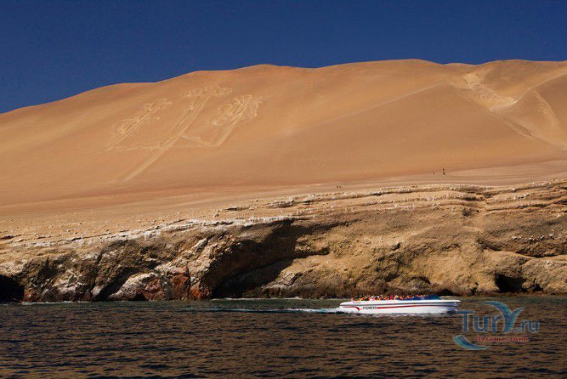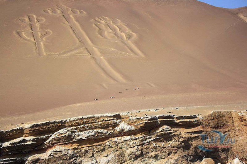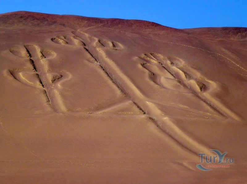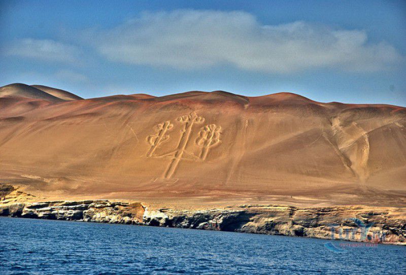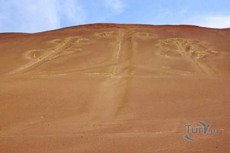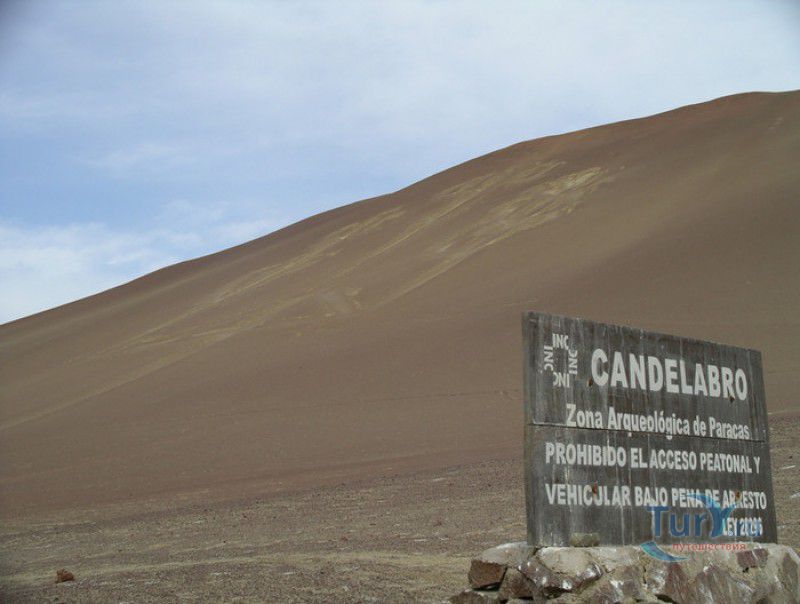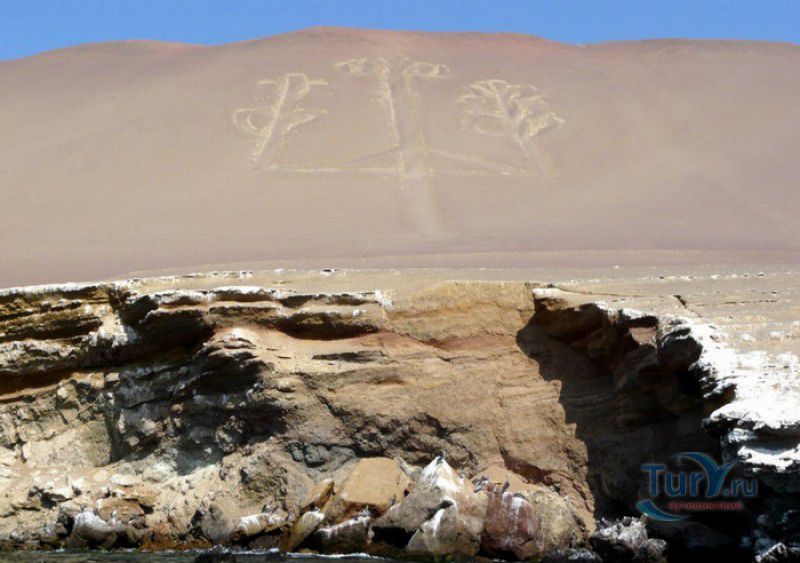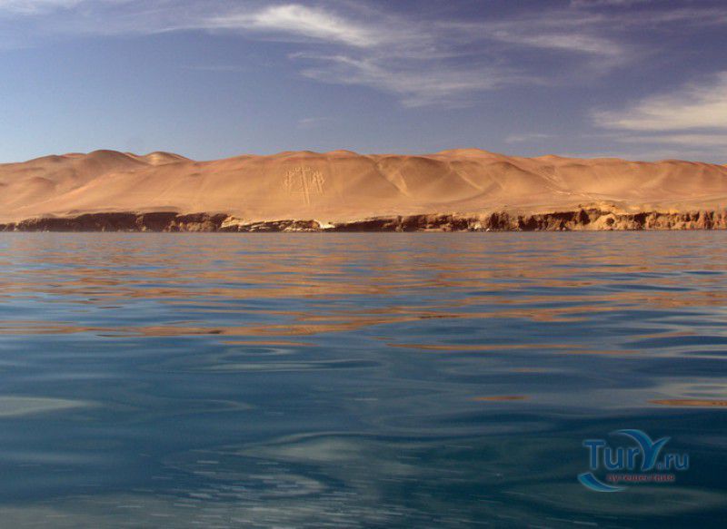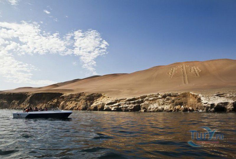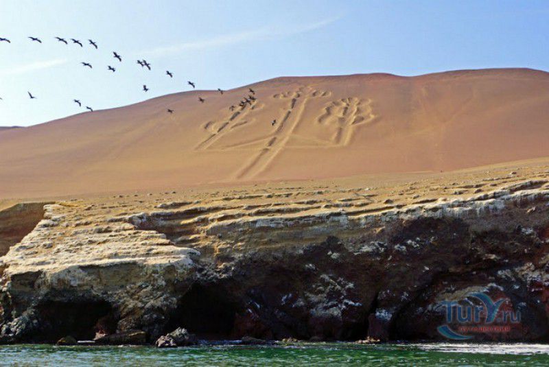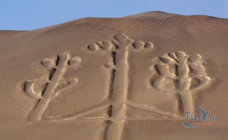 Геоглиф Андский Канделябр (Канделябр Паракаса) расположен в Перу, на северном побережье полуострова Паракас, на территории Национального заповедника Паракас. Андский канделябр вырезан на обращённом к морю склоне скалы, покрытом толстым слоем песка. Из-за постоянных ветров песок никогда не засыпает геоглиф полностью - очертания Канделябра Паракаса, похожего на огромный подсвечник с тремя свечами, всегда отлично видны как с высоты птичьего полёта, так и со стороны моря. Высота гигантского трезубца около 180 метров, ширина - 60 метров, толщина его линий составляет 3,2 метра, а глубина - от 1 до 1,2 метров. Предположительный возраст геоглифа - 2500 лет. О происхождении и предназначении Андского канделябра существует множество легенд и научных гипотез, которые пока никак не подтверждены. Некоторые учёные предполагают, что Канделябр указывает на линии Наска (группа гигантских геометрических и фигурных геоглифов на плато Наска в южной части Перу), но до них от Канделябра Паракаса более 200 километров. Другие исследователи склоняются к версии о религиозном предназначении геоглифа, а местные жители считают его элементом культа божества Виракоч - древнего бога-творца. Существует также предположение, что геоглиф служил маяком для мореплавателей - расположение и гигантские размеры Канделябра позволяют увидеть его в ясную погоду на расстоянии 20 км. Естественно, не обошлось без инопланетян, масонов, зарытых несметных сокровищ и ритуалов жертвоприношений. Достоверным является факт, что Андский Канделябр - творение древних цивилизаций. Считается, что геоглиф был создан представителями Паракасской археологической культуры, потомком которой является культура Наска. Не вызывает сомнений и то, что геоглиф "пережил" несколько тысячелетий - ни время, ни сильные морские ветра, ни песчаные бури и штормы не смогли стереть Андский канделябр с поверхности Земли.