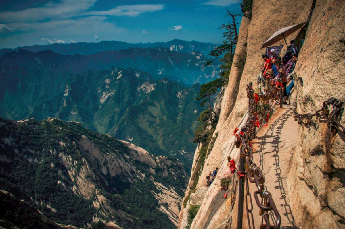 Для любителей экстрима предлагается путешествие на Каменный цветок Китая - гору Хуашань. Она расположена в 120 км к востоку от Сианя и знаменита своими величественными скалами, крутыми тропами, но прежде всего — своими фантастически великолепными видами. Это одна из пяти священных гор Китая, и здесь пролегает самый экстремальный туристический маршрут в мире. Гора Хуашань имеет пять вершин: Южная, Северная, Западная, Восточная и Центральная, из которых Южная вершина со своими 2155 метрами самая высокая. Все пики кажутся примерно одинаковыми и напоминают по форме лепестки цветка. Подняться на гору можно несколькими способами. С Западного входа вы сможете увидеть множество даосских храмов. С Восточного входа прийдеться пробираться по крутой каменной лестнице. И самый безопасный способ это подняться на фуникулере, он был здесь установлен в середине 90-х годов. Обычно люди выбираю канатную дорогу, которая поднимается на Северную вершину. А далее они выбирают либо Западный либо Южный пик. Большинство предпочитает Западный пик, так как этот маршрут довольно безопасен, и вид на Западную вершину просто ошеломляющий, и он еще грандиозней при совершенно ясной погоде.