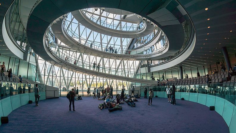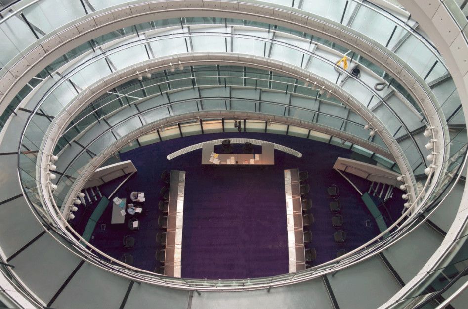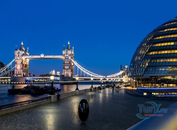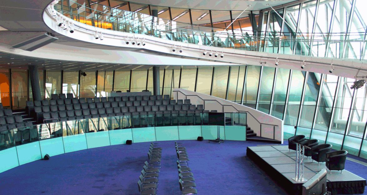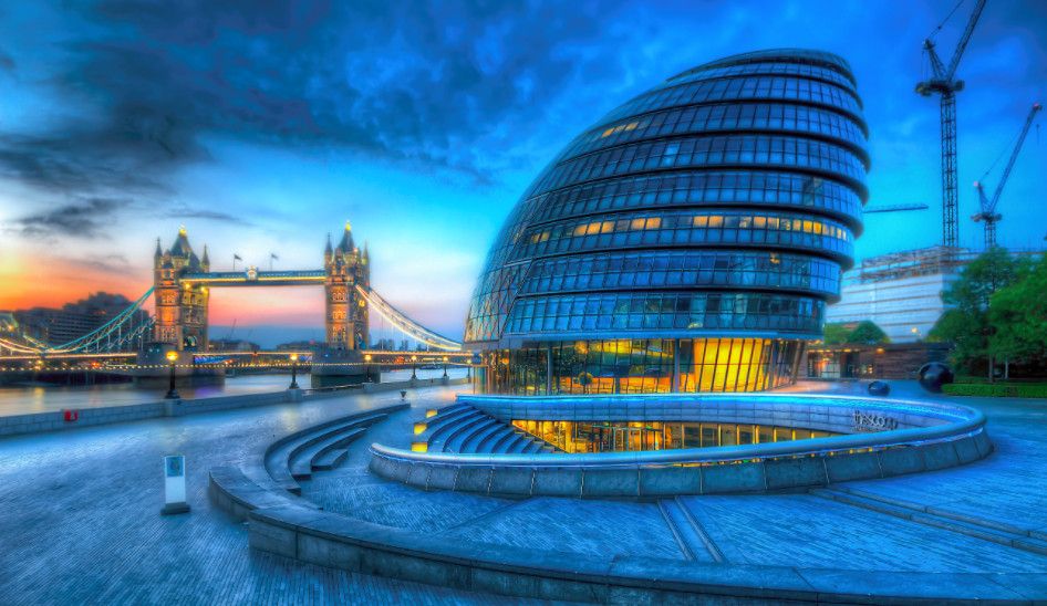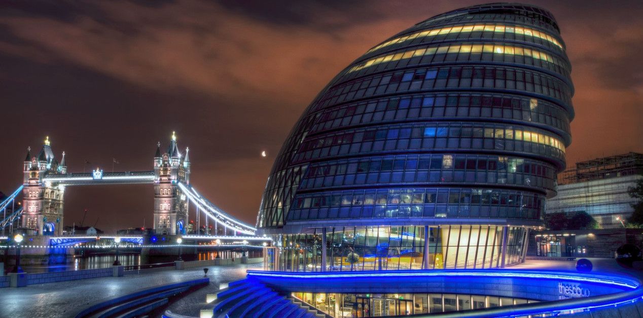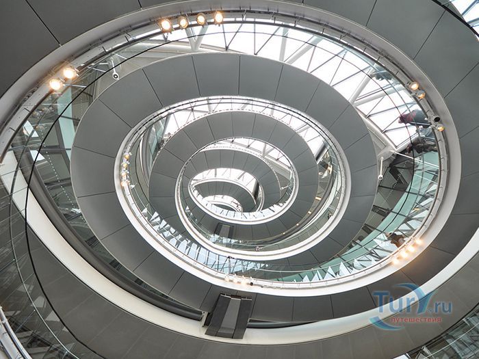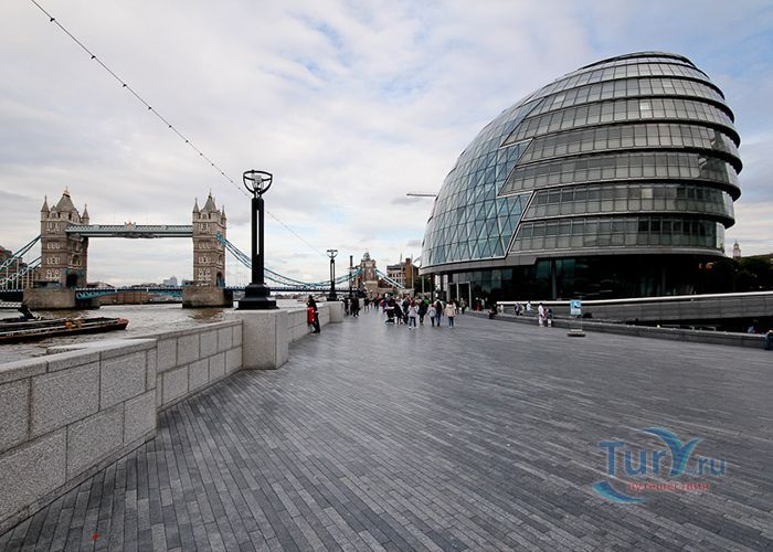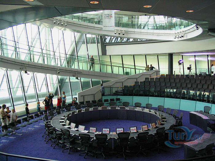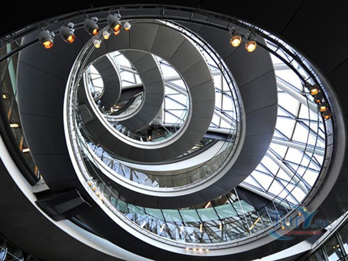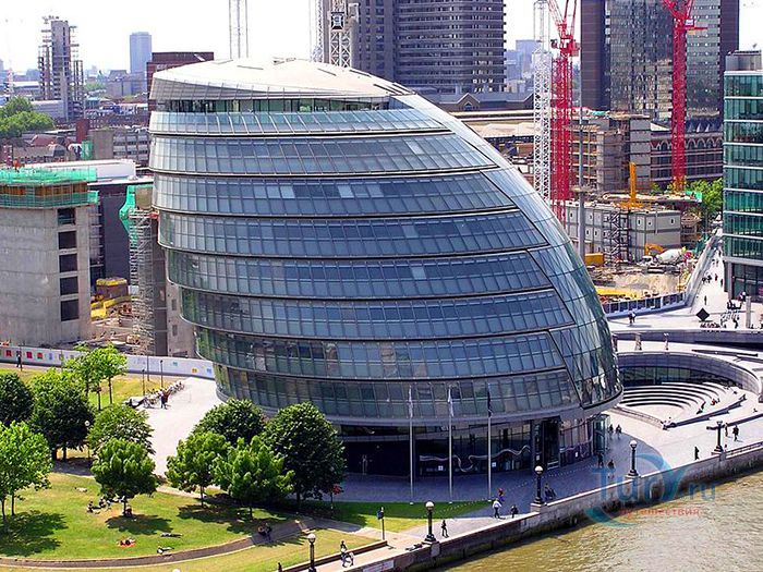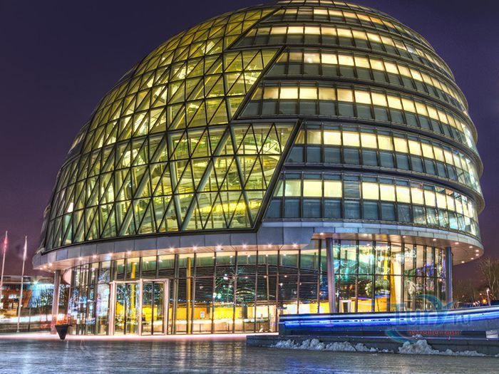 Сити-холл – десятиэтажное здание нестандартной формы, служащее резиденцией Администрации Большого Лондона. Расположено в Ламбете – административной единице Лондона, на южном берегу Темзы, неподалеку от Тауэрского моста. Его строительство длилось 5 лет и завершилось в 1998 году. Суммарный бюджет составил 65 миллионов фунтов. Свою известность Сити-холл приобрел благодаря необычной форме 45-ти метровой архитектурной конструкции, которая напоминает наклоненное яйцо с выделенными горизонтальными линиями смещенных в одну сторону этажей. За счет наклона стеклянного здания в сторону юга, его противоположная – северная часть может собирать больше световых и тепловых лучей. Навес над поверхностью земли южной части, не позволяет солнечной активности причинять дискомфорт работающим в здании. Благодаря такой асимметричности, на все этажи попадает оптимальное количество света. Задумка создания сферического здания, заключается в стремлении экономить электроэнергию. Зодчий здания - Норман Фостер, известный британский архитектор, который главными качествами своих творений считал простоту, экологичность и целесообразность. Сити-холл накрыт 3844 стеклянными плитами, каждая из которых не повторяет остальные. Внутри здания есть винтовая лестница, по которой можно подняться на десятый этаж, называемый «Лондонской гостиной», вся площадь которого используется для проведения выставок и встреч.