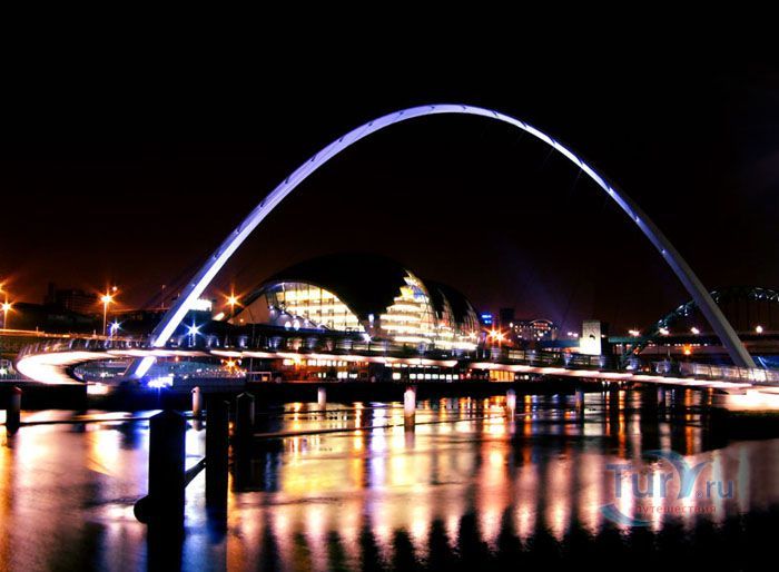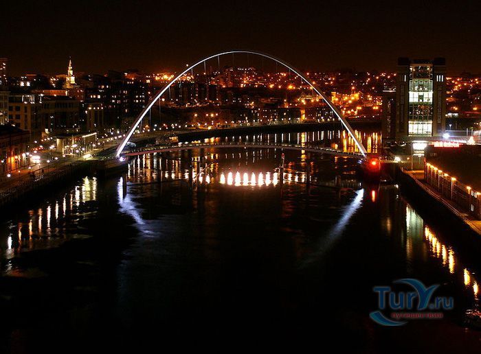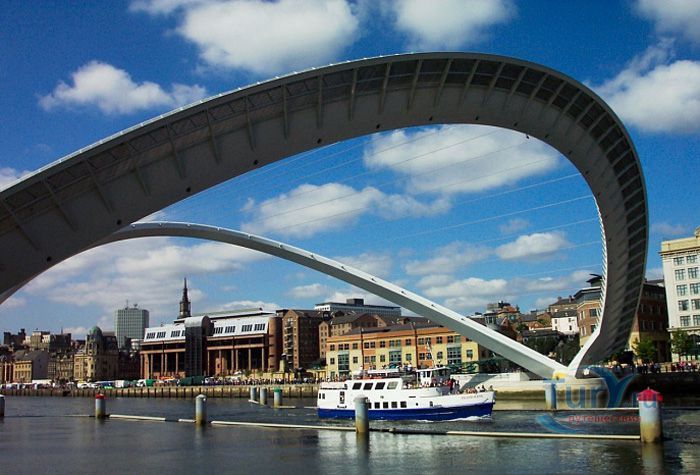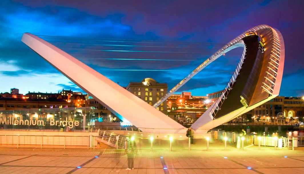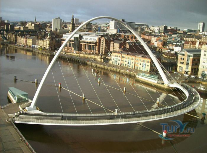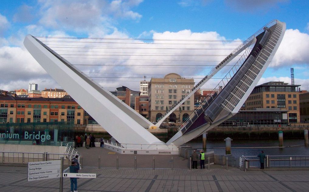 Гейтсхед Миллениум Бридж – первый наклоняемый мост в мире, расположен на реке Тайн, в Гейтсхеде, Англия. Это весьма необычный пример современного мостостроения. Авторство этого проекта принадлежит двум архитекторам Уилкинсону и Эйру. В 1996 году они выиграли большой конкурс, который организовывал городской совет Гейтсхеда. Основная задача, которая ставилась перед архитекторами – построить пешеходный и велосипедный мост, который не будет мешать проходящим по реке Тайн судам. Они создали проект оригинального, наклоняемого моста. Бюджет строительства составил 40 миллионов долларов, а на его строительство ушло более двух лет. Торжественное открытие состоялось в сентябре 2001 года. В день открытия на реке Тайн вокруг моста собралось более 35 тысяч человек. Основой моста являются две стальные арки соединённые тросами. Одна из них находится под углом, поднимаясь над водой на расстоянии 50 метров, а вторая арка является пешеходной и велосипедной частью моста. В таком положении под мостом могут проходить небольшие суда. Для того, чтобы могли проходить большие суда в действие вступает гидравлическая часть, которая управляется восьмью мощными электромоторами. Это позволяет поднимать обе части моста на 40 градусов вокруг основной оси. Во время поворотов моста вокруг него собирается множество зрителей и туристов. Внешне мост напоминает челюсти огромного кита, который внезапно вынырнул из реки, а во время поворота он похож на «подмигивающий глаз». Такое моргание можно увидеть на Тайне около 200 раз в году. Гейтсхедский Миллениум Бридж является одной из основных достопримечательностей в Гейтсхеде.