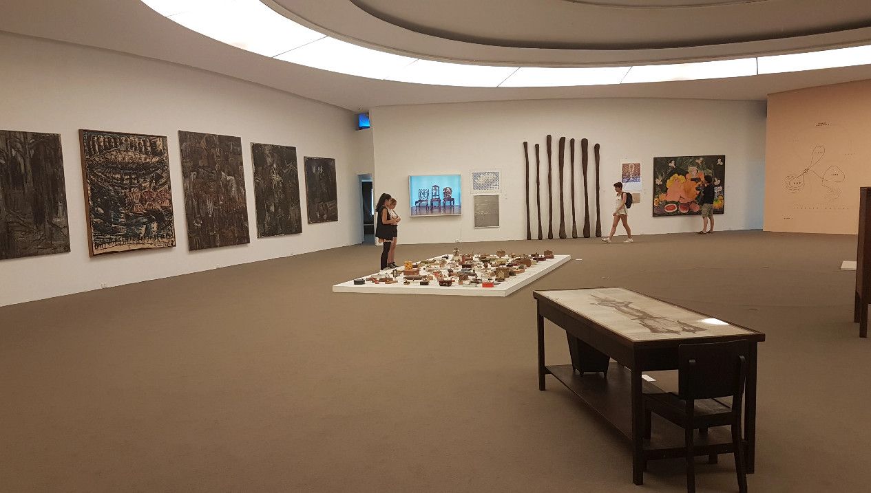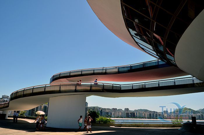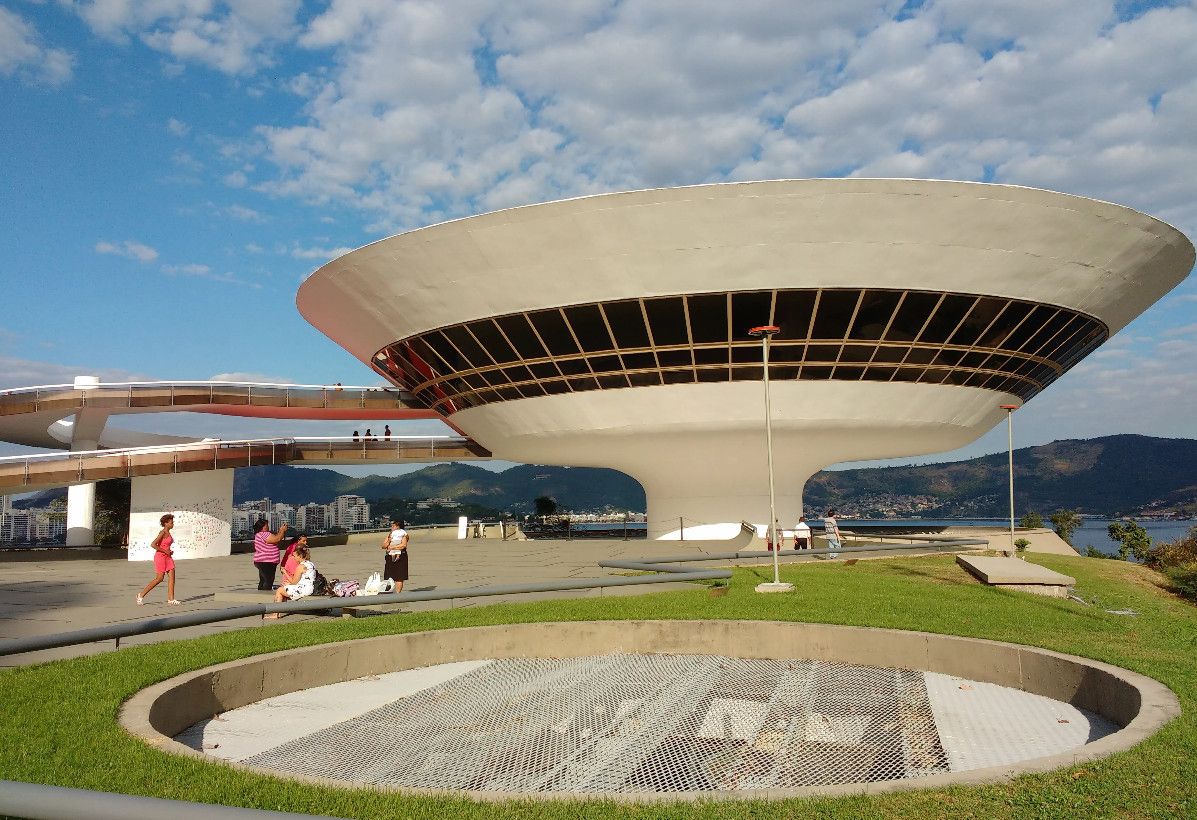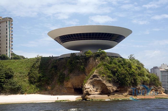 Музей современного искусства расположен в городе Нитерой, Бразилия. Это знаменитое архитектурное творение в стиле модернизма принадлежит Оскару Нимейеру. Музей строился на протяжении пяти лет и был торжественно открыт в 1996 году. Это здание по своей форме напоминает летающую тарелку, приземлившуюся на самом берегу залива Гуанабара. Здание является уникальным, его конструкция представляет собой шестнадцатиметровое, трёхэтажное бетонное цилиндрическое сооружение. Диаметр здания составляет 50 метров, а диаметр опорной колонны, на которой оно установлено – 9 метров. Вокруг здания находится небольшой водоём, колонна располагается посреди него, что придает зданию визуальную лёгкость. К входу в музей ведёт длинный спиралевидный пандус. Сразу после входа в музей посетитель попадает в помещение картинной галереи. Из большого панорамного окна зала музея открывается восхитительный вид на Рио-де-Жанейро, Сахарную голову, Статую Христа и другие достопримечательности. В музее действует постоянная экспозиция из 1217 работ коллекции Жоана Саттамини, которую он собирал 45 лет. Музей является настолько популярным, что некогда маленький городок, основной задачей которого являлось снабжение морепродуктами Рио-де-Жанейро, стал популярным местом для бразильских и зарубежных художников.