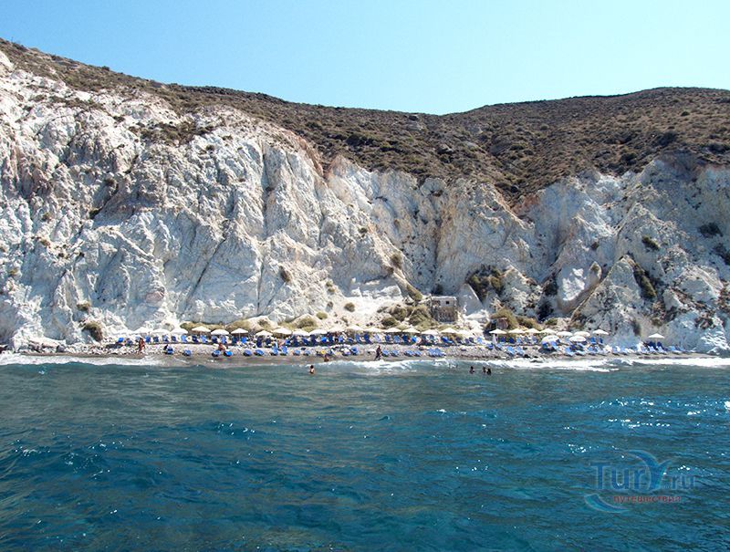 Белый пляж расположен в деревне Акротири, на юго-западном побережье Санторини, в 14 километрах от Фиры. Белый пляж - это полоса из белой гальки, окруженная белыми высокими скалами, образующими красивую маленькую бухту. Добраться сюда можно только по воде. Причем причала на пляже нет, так что высадка пассажиров производится прямо в воду. Дно здесь неглубокое, сам пляж усыпан булыжниками и чуть менее крупными камнями. Начало спуска тоже достаточно некомфортно, но через три-четыре метра начинается приятный песок. На пляже можно арендовать зонтики и лежаки и купить напитки.