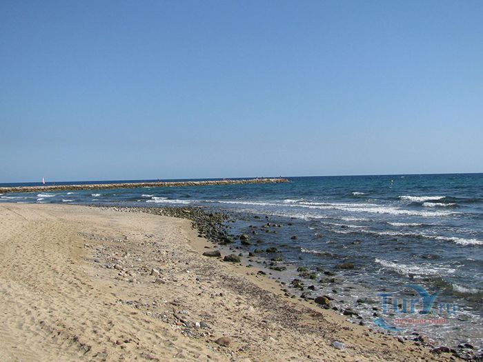 На пляже есть: места для спуска инвалидов, мототрасса, душевые, туалеты, пляжный бар, лежаки, зонтики, навесы, водные мотоциклы, парусные суда, парковка, спасатели, детская игровая площадка и спортивная площадка. Рядом располагается автобусная остановка.