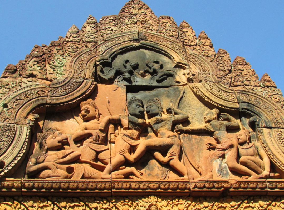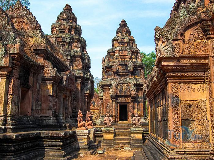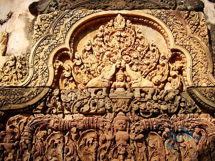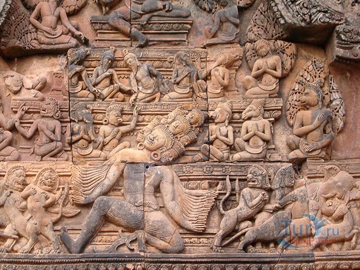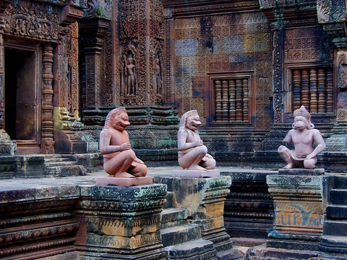 Бантеайсрей построен в основном из красного песчаника. Этот вид камня отлично поддается обработке и идеален для нанесения резьбы, благодаря чему удивительно изящные декоративные барельефы в Бантеайсрее сохранилась до нашего времени. По сравнению с другими храмам Ангкора это строение кажется миниатюрным. Но при этом заслуженно носит звание "драгоценного камня" или "жемчужины кхмерского искусства". Происхождение названия Бантеайсрей или Женская крепость, вероятно, связано с небольшими размерами здания и с затейливостью барельефов, изображающих деват (богинь) на его стенах.