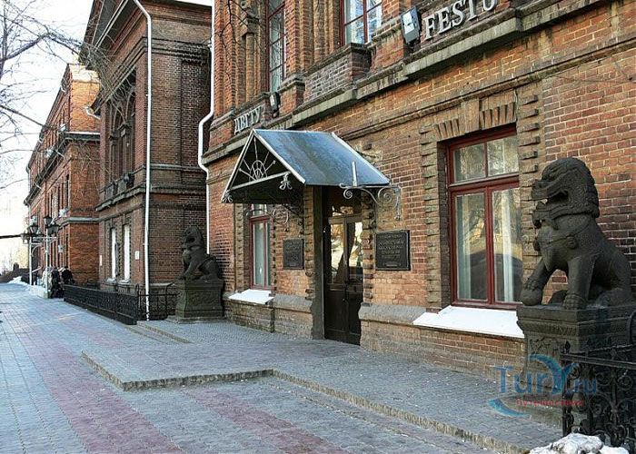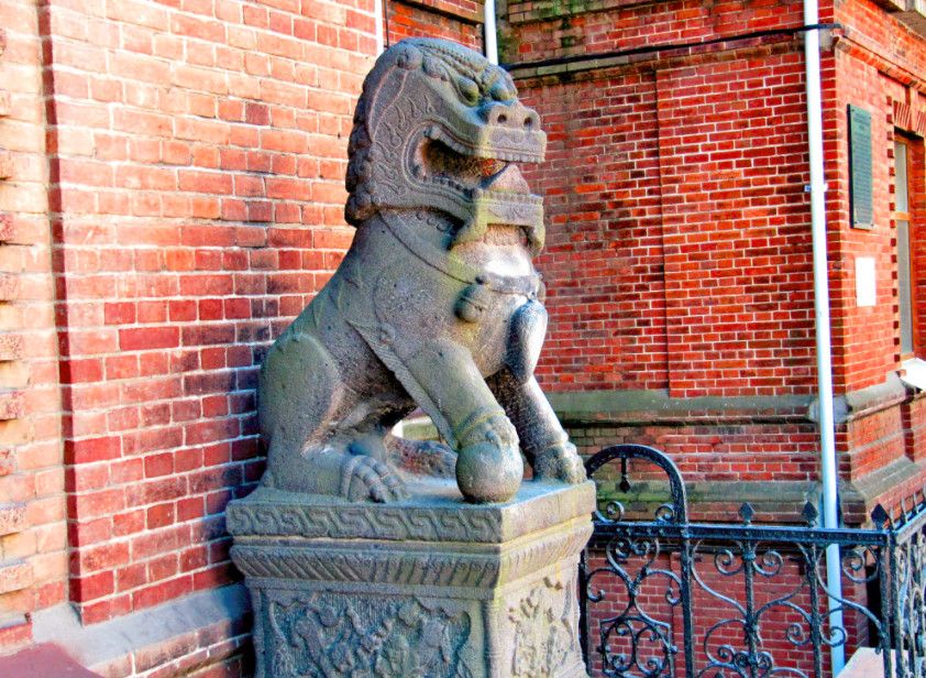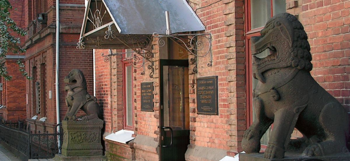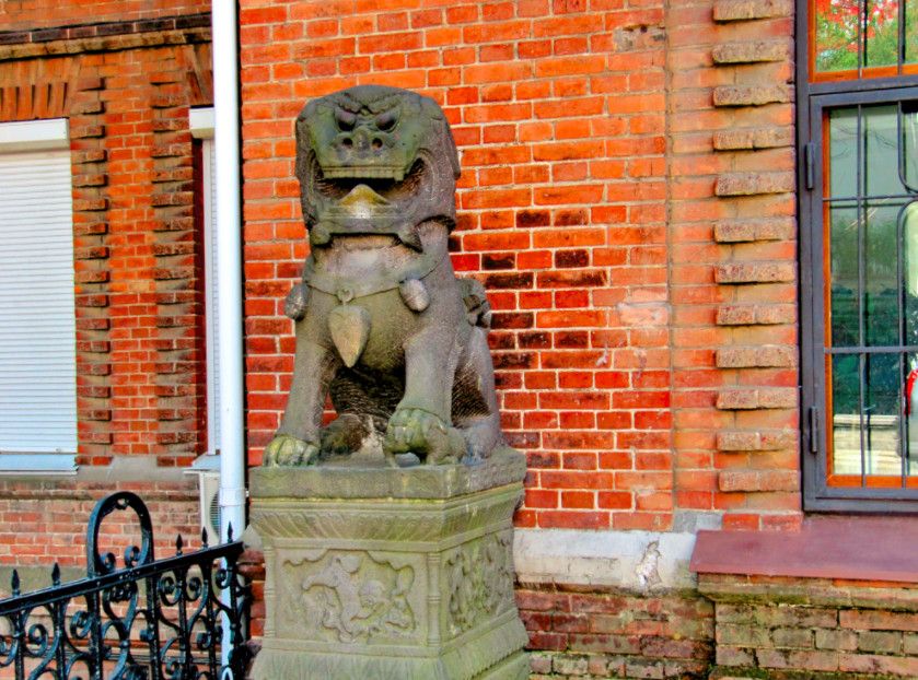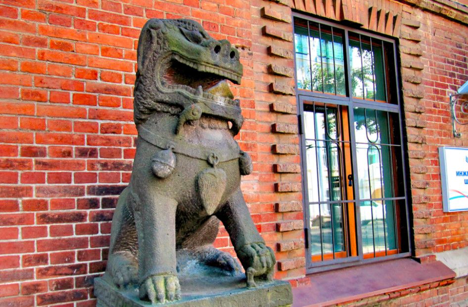 В середине 1890-х годов во Владивостоке было решено построить новое здание для мужской гимназии. Один из владельцев Торгового дома «Кунст и Альберс» А. В. Даттан подарил городу участок земли под строительство гимназии. 15 сентября 1896 года состоялась закладка здания. 21 октября 1899 года в торжественной обстановке состоялось освящение здания и открытие двух учебных заведений Восточного института и гимназии. Особую красоту и колорит зданию придают два каменных льва, выполненных в восточном стиле, которые как будто охраняют вход в здание. По одной версии, они были привезены во Владивосток в 1900 г. из Тяньцзиня после подавления Боксёрского восстания, по другой - подарены китайским представителем при Приамурском генерал-губернаторе.