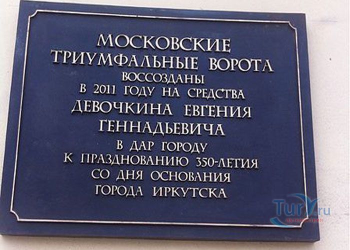Московскую триумфальную арку в Иркутске построили в честь десятилетия восшествия на престол Александра I. Ворота располагались на пересечении улиц Московско-Ланинской и Нижней набережной Ангары, при выезде из Иркутска в сторону Европейской части России - на Московский тракт. Отсюда и было получено название Московские. Под каждым из пилонов арки положили по закладной доске. В первой говорилось об участниках заложения ворот, а во второй - причина создания памятника. 15 сентября 1813 года состоялось торжественное открытие арки. Московские ворота представляли собой четырехъярусное здание высотой 19 метров и шириной почти 16,5 метров. На самом верху сооружения была чаепитная комната в которой в день открытия был устроен приём для тогдашнего гражданского губернатора Николая Трескина и епископа Вениамина I.